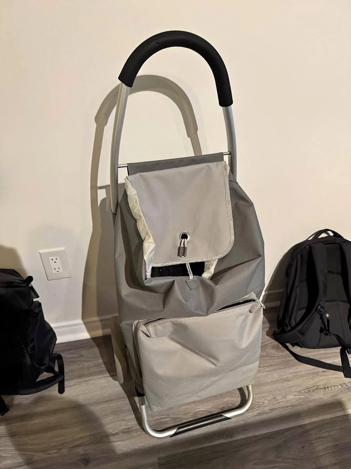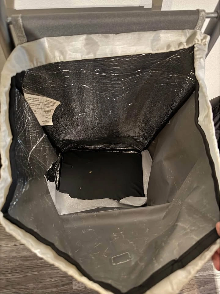 The string around the main opening is gone, which is why you see it "closed" using the string below that. But that can be repaired. Also, the interior insulation has been mostly torn away. Otherwise it's perfectly functional, good wheels etc. Honestly just take it, no need to pay anything.