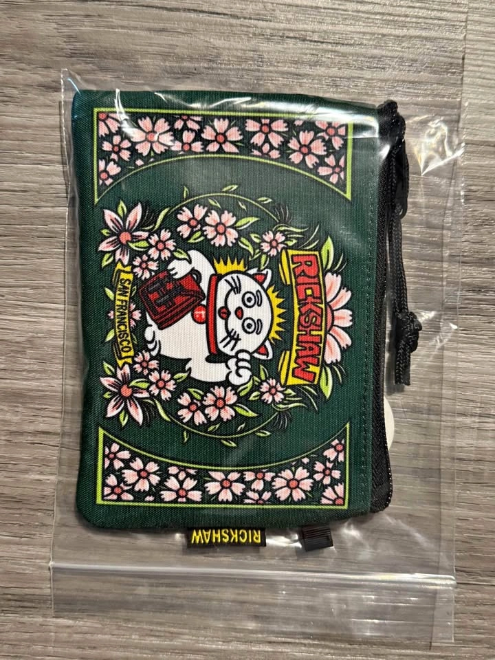 Handmade in San Francisco from Rickshaw Bagsworks. It's just a simple pouch, about 6.25" x 4.5". The material feels like Cordura. The design is a Japanese maneki-neko (lucky cat) holding a Rickshaw bag, with sakura flowers around it.