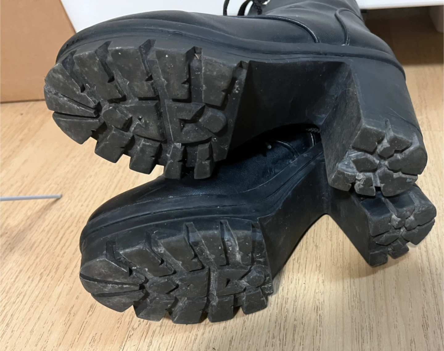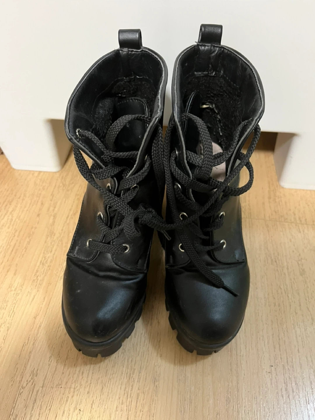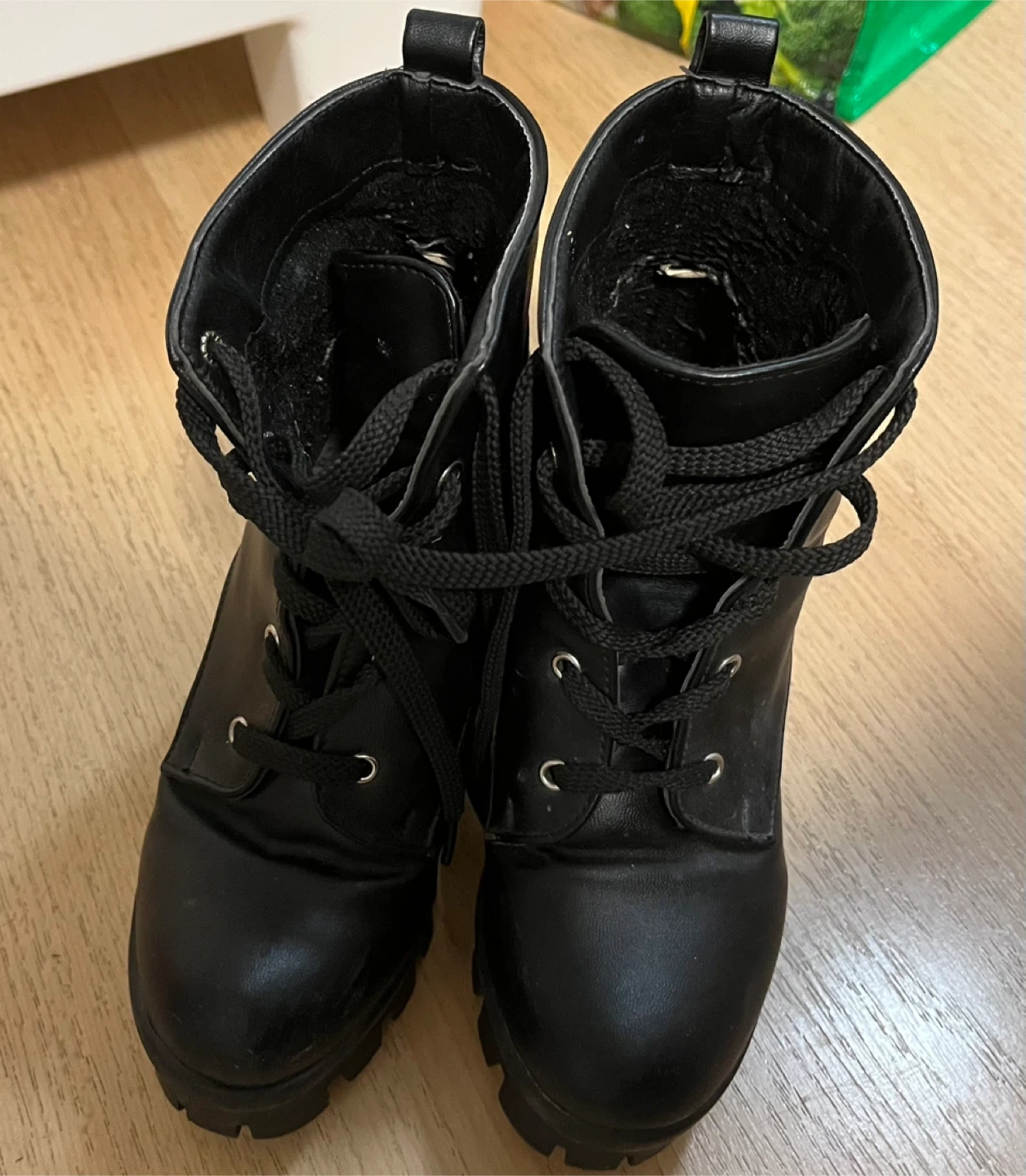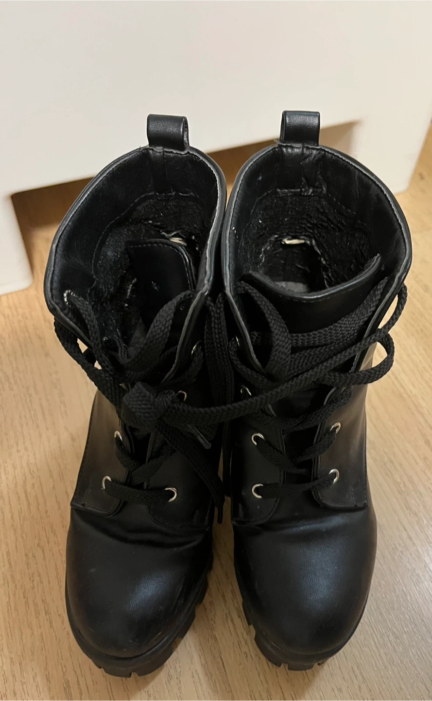 Selling a pair of black lace-up heeled boots! They're in good condition and have a chunky heel and lug sole. Perfect for adding a bit of edge to any outfit!