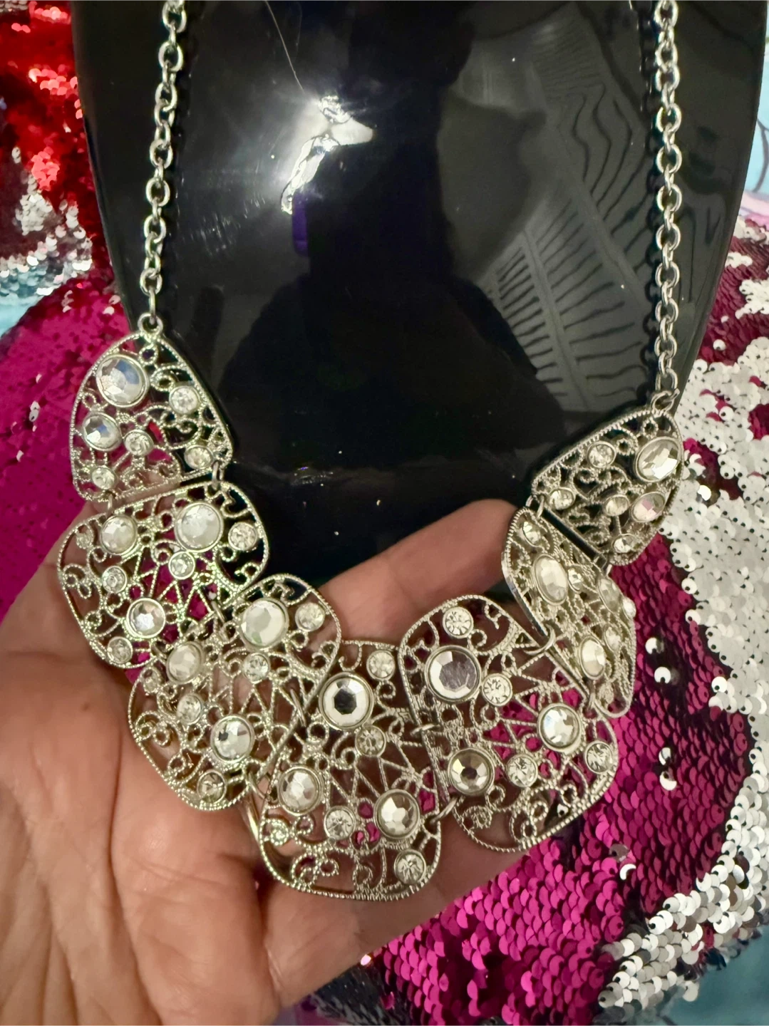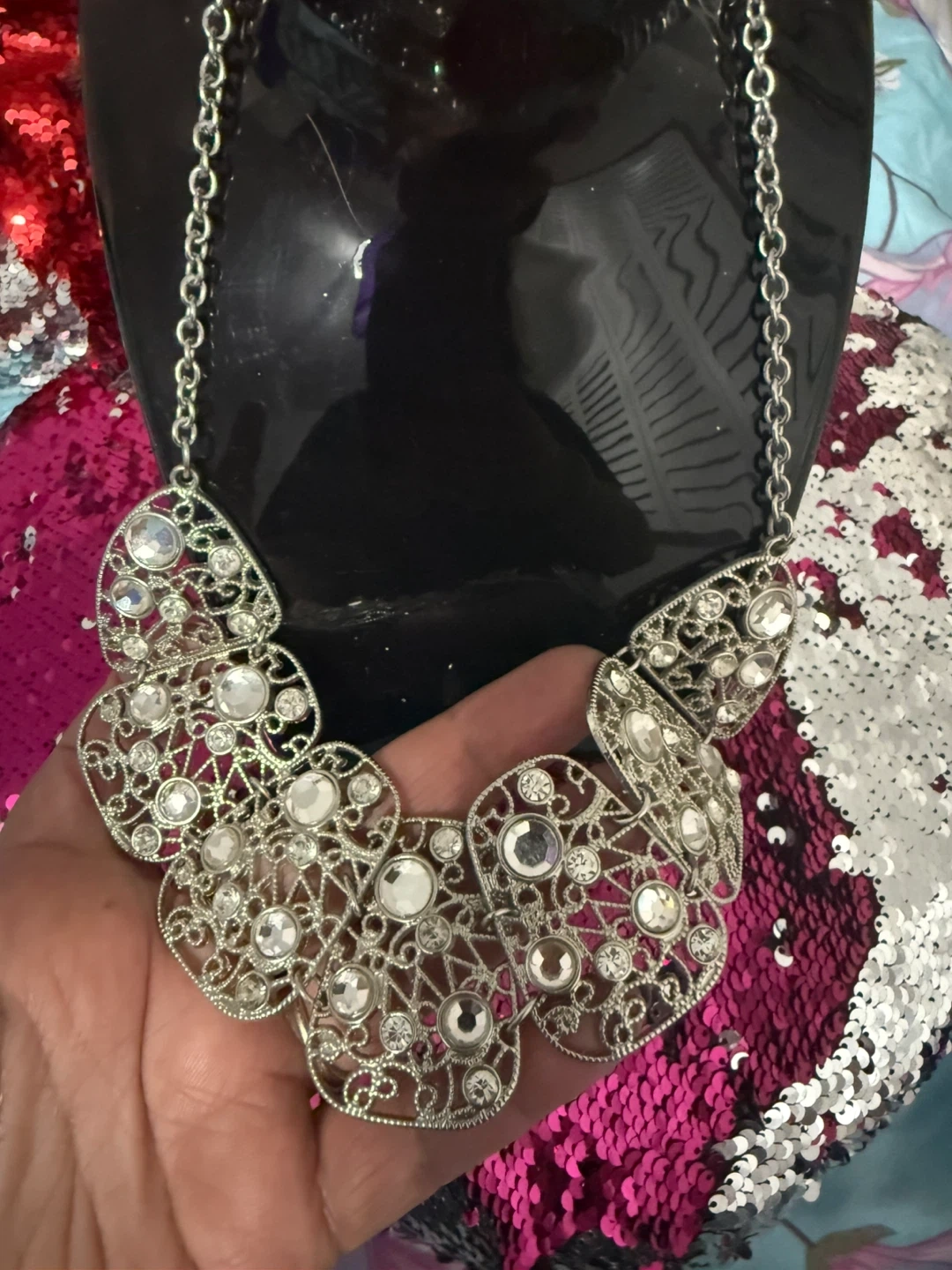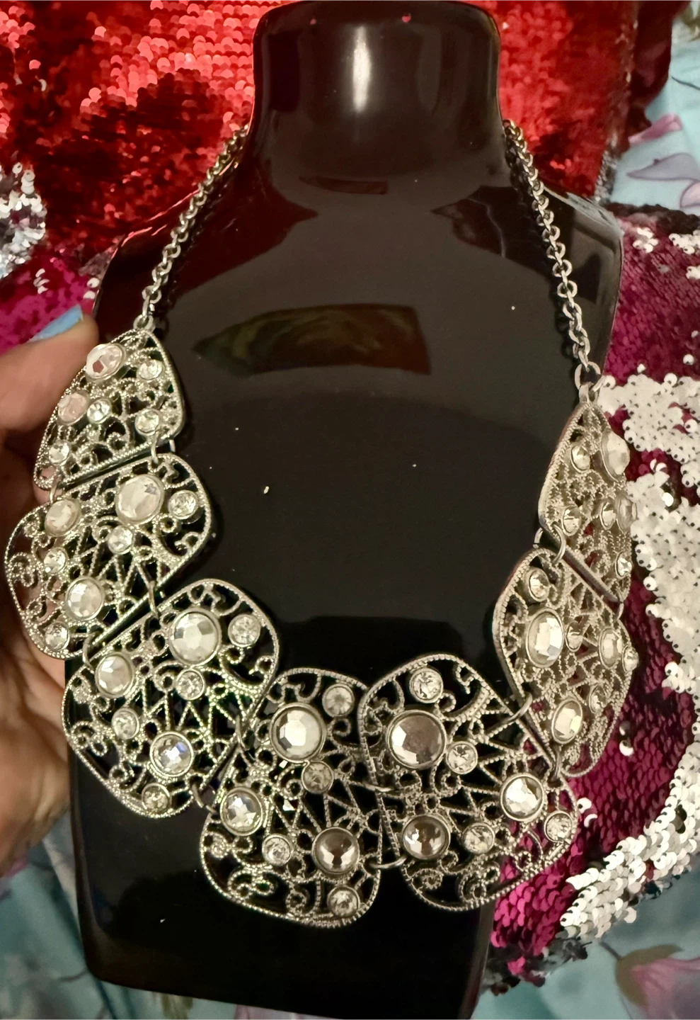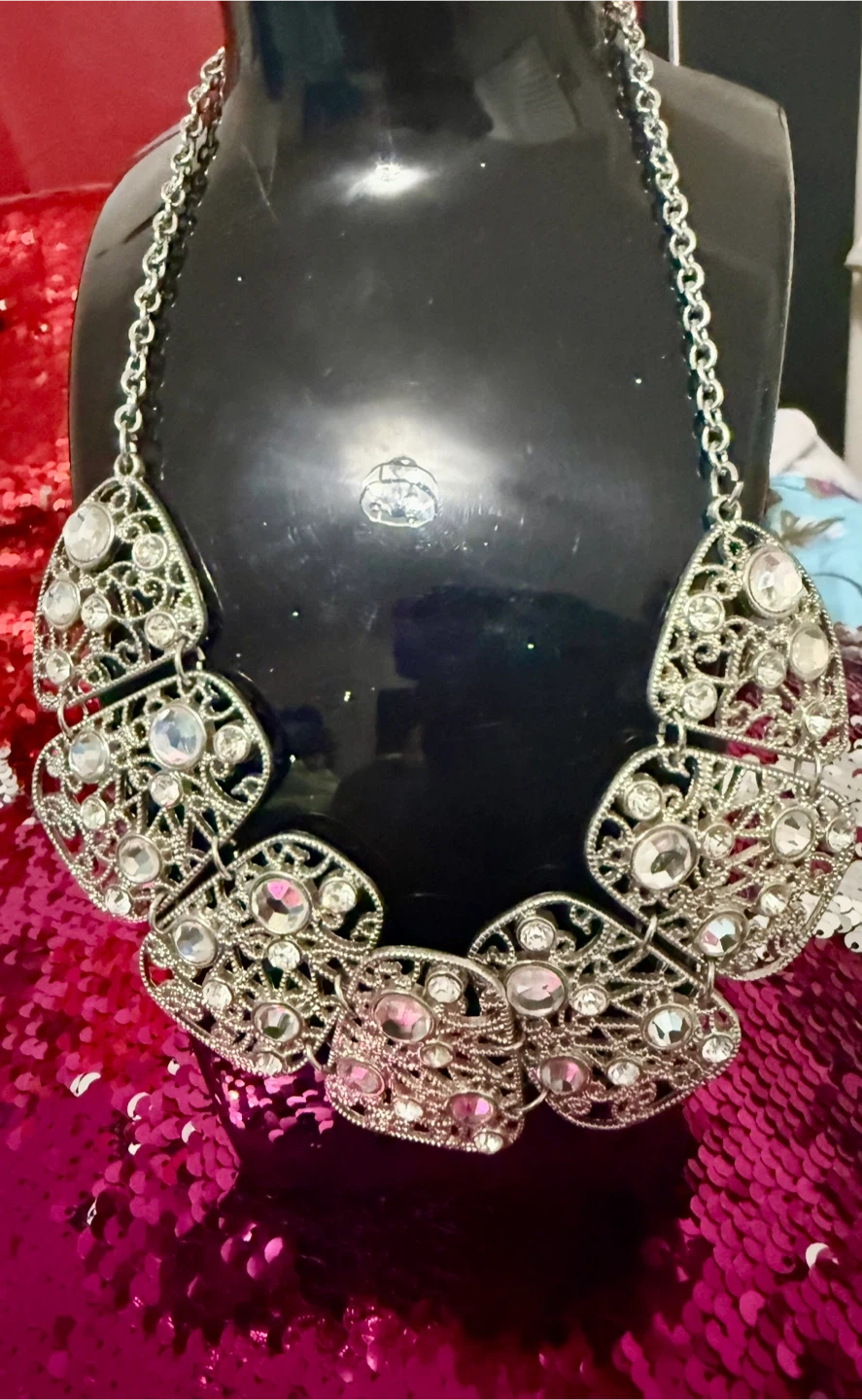 Selling a beautiful silver statement necklace. It features an intricate design with clear rhinestones. Perfect for adding a touch of sparkle to any outfit!