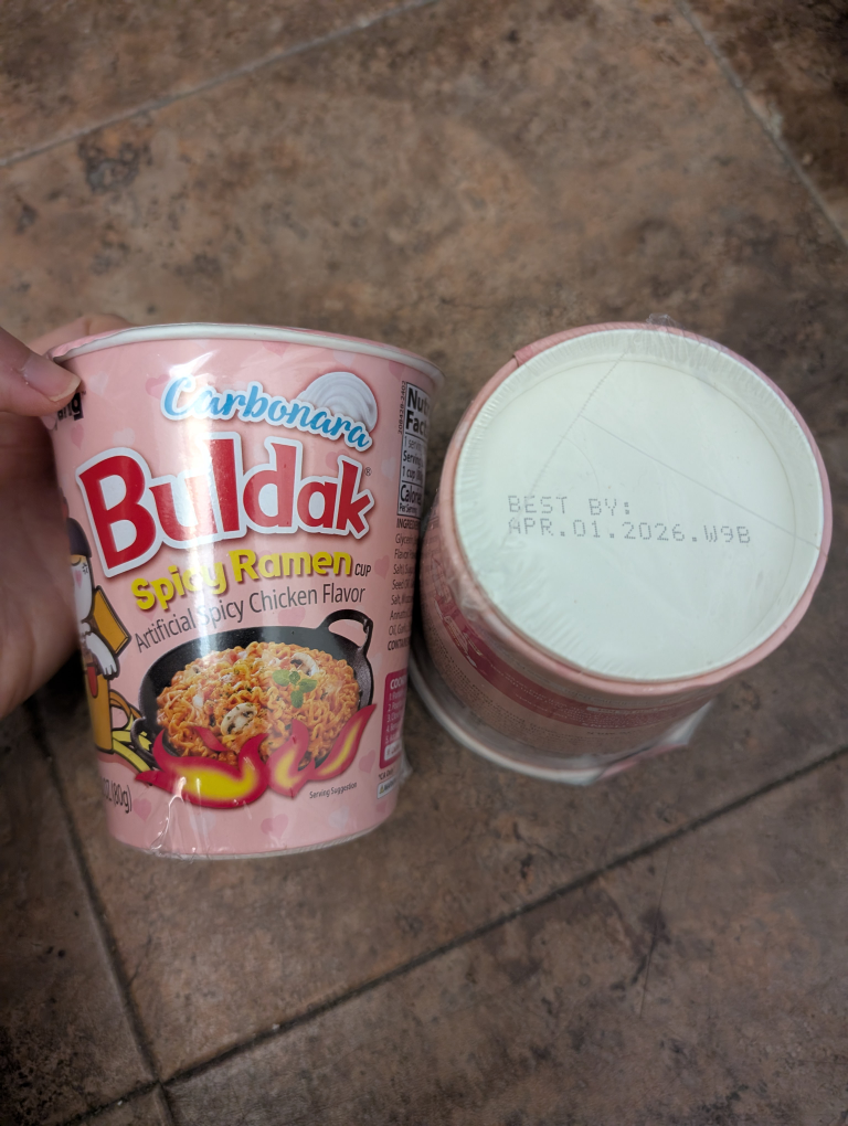 I'm selling a new cup of Buldak Carbonara Spicy Ramen! It's the artificial spicy chicken flavor. Best by 2026 April 01