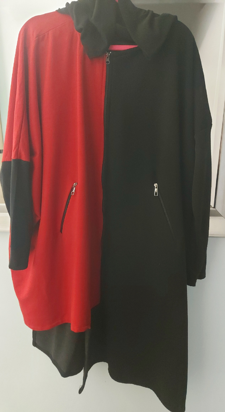 Selling a warm unique asymmetrical hooded coat featuring a striking red and black colour block design! It comes from a stylish designer, has a zipper and some cool pocket details. Perfect for adding a bit of edge to your wardrobe