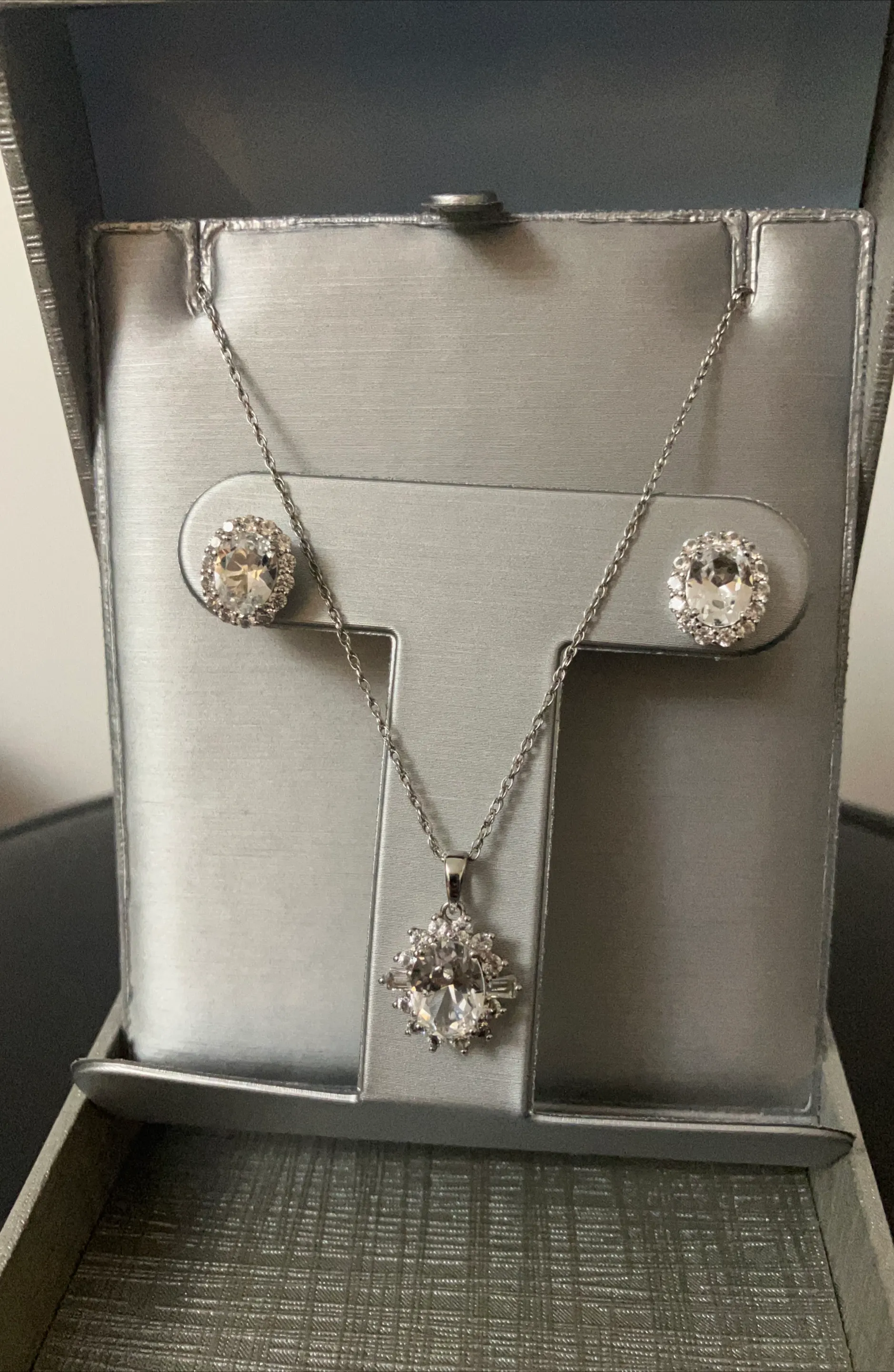 Selling a lovely necklace and earrings set. The set features white sapphire lab and a silver-tone finish 925. Great for adding a touch of sparkle to any outfit!