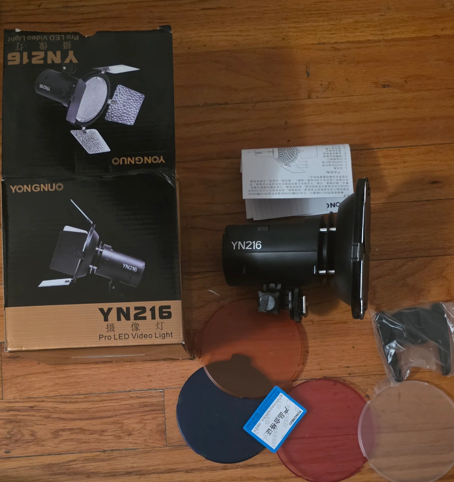 23Selling a Yongnuo YN216 Pro LED Video Light! It comes with the box and all the components you see in the picture, including the colored filters and instructions