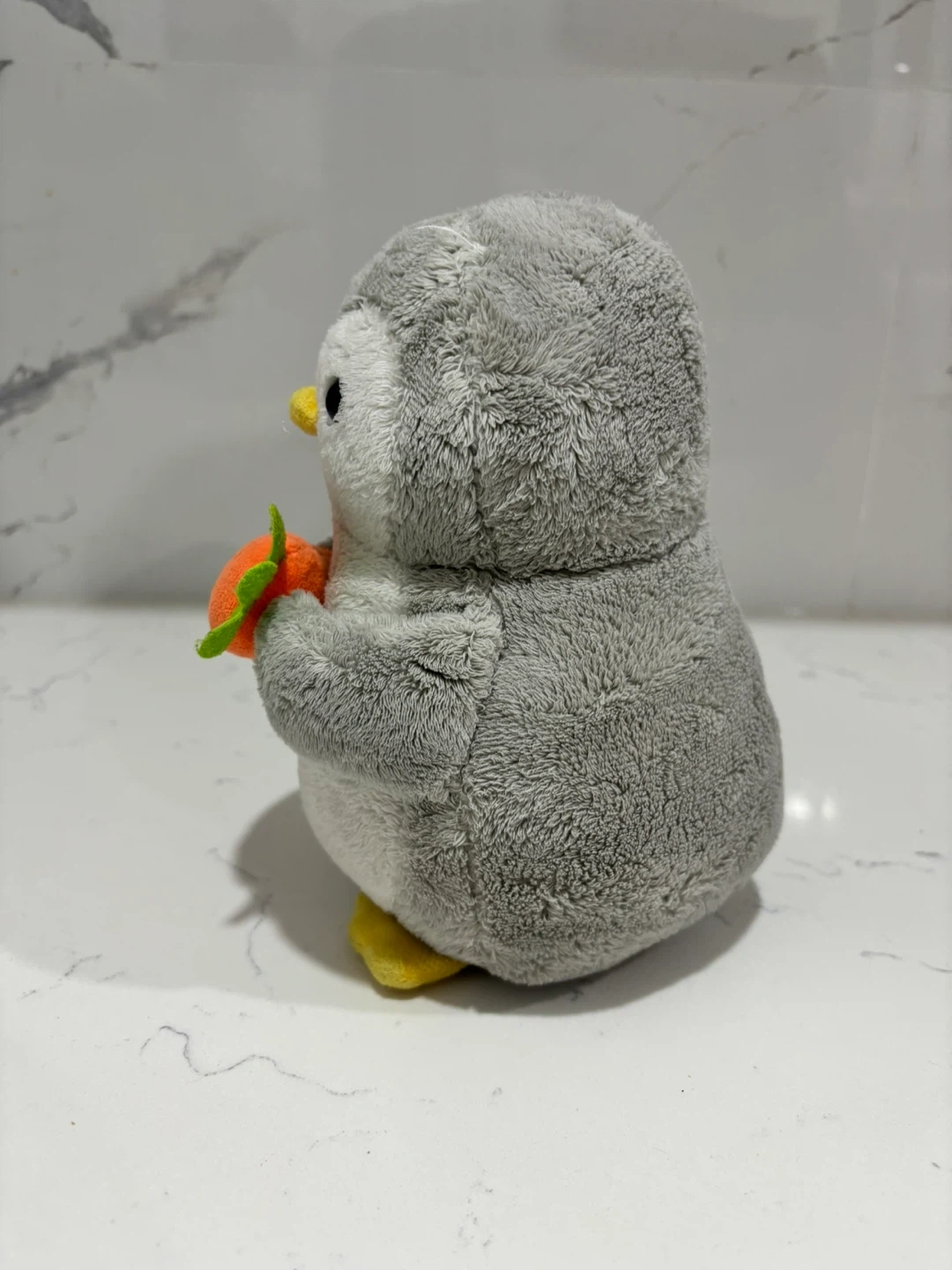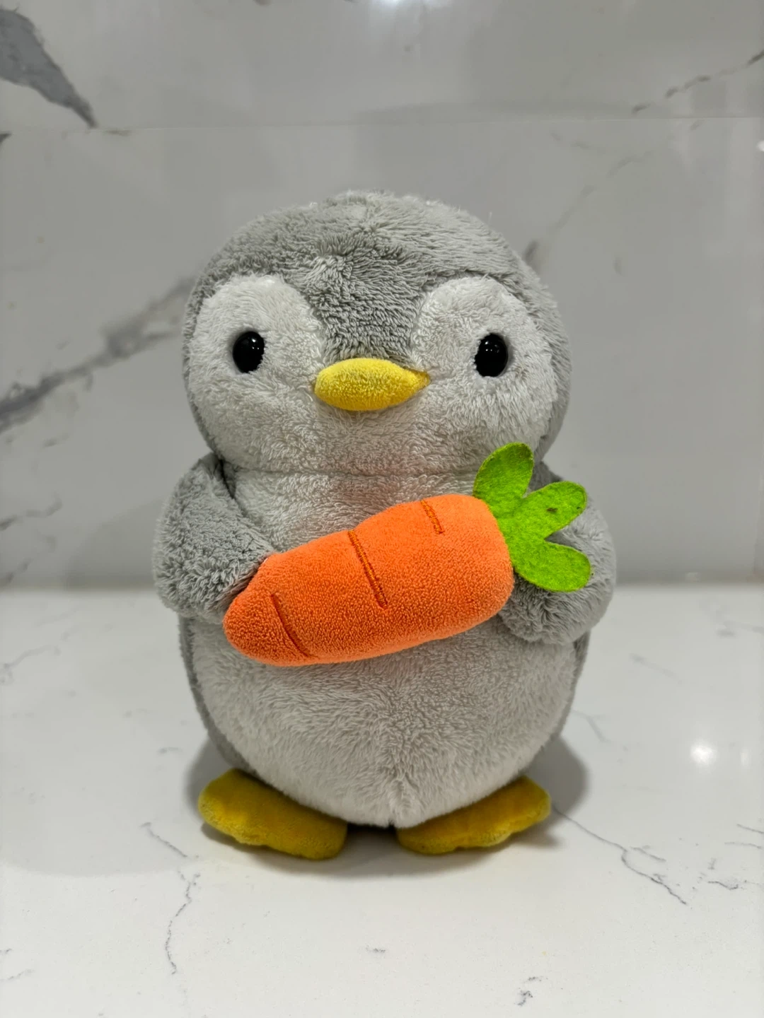 10Selling a cute penguin plush toy! It's grey and holding a bright orange carrot. Perfect for a little one or anyone who loves penguins.