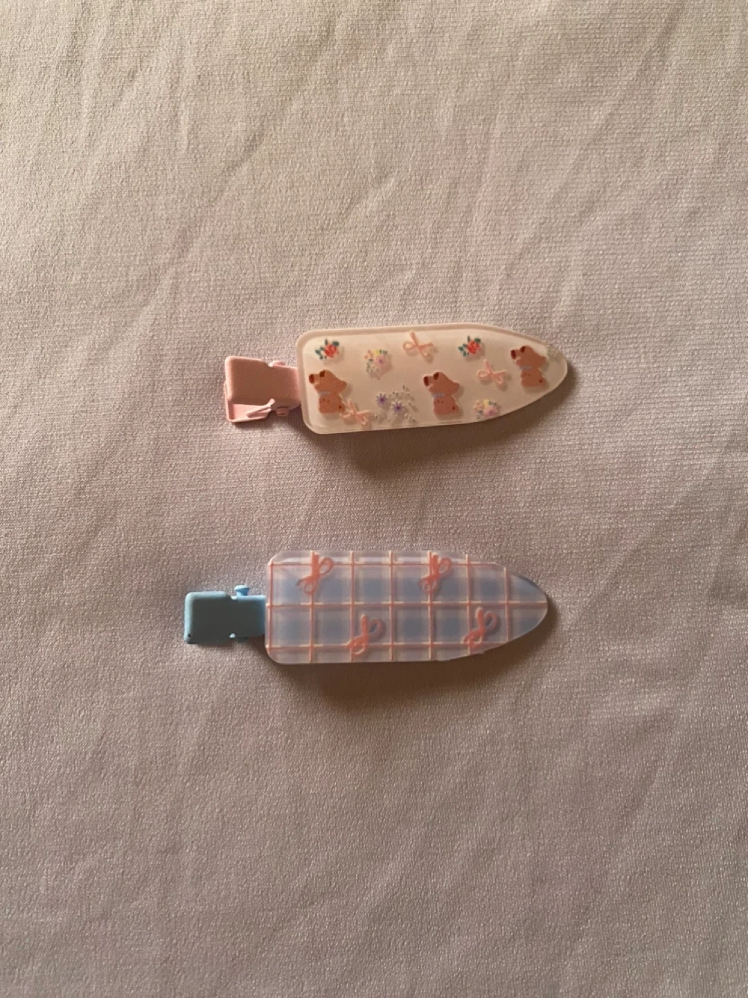 A set of two adorable hair clips! One is decorated with little bears and flowers, and the other has a cute pink bow pattern. They're perfect for adding a touch of sweetness to any hairstyle