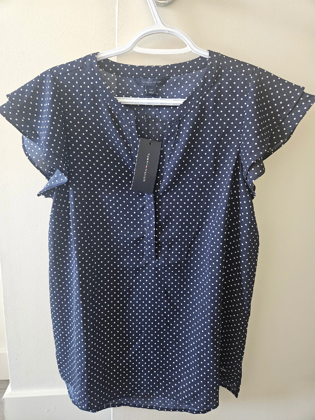 This is a cute Tommy Hilfiger blouse in navy with white polka dots. It features a v-neck and flutter sleeves. Perfect for a casual or dressed-up look!