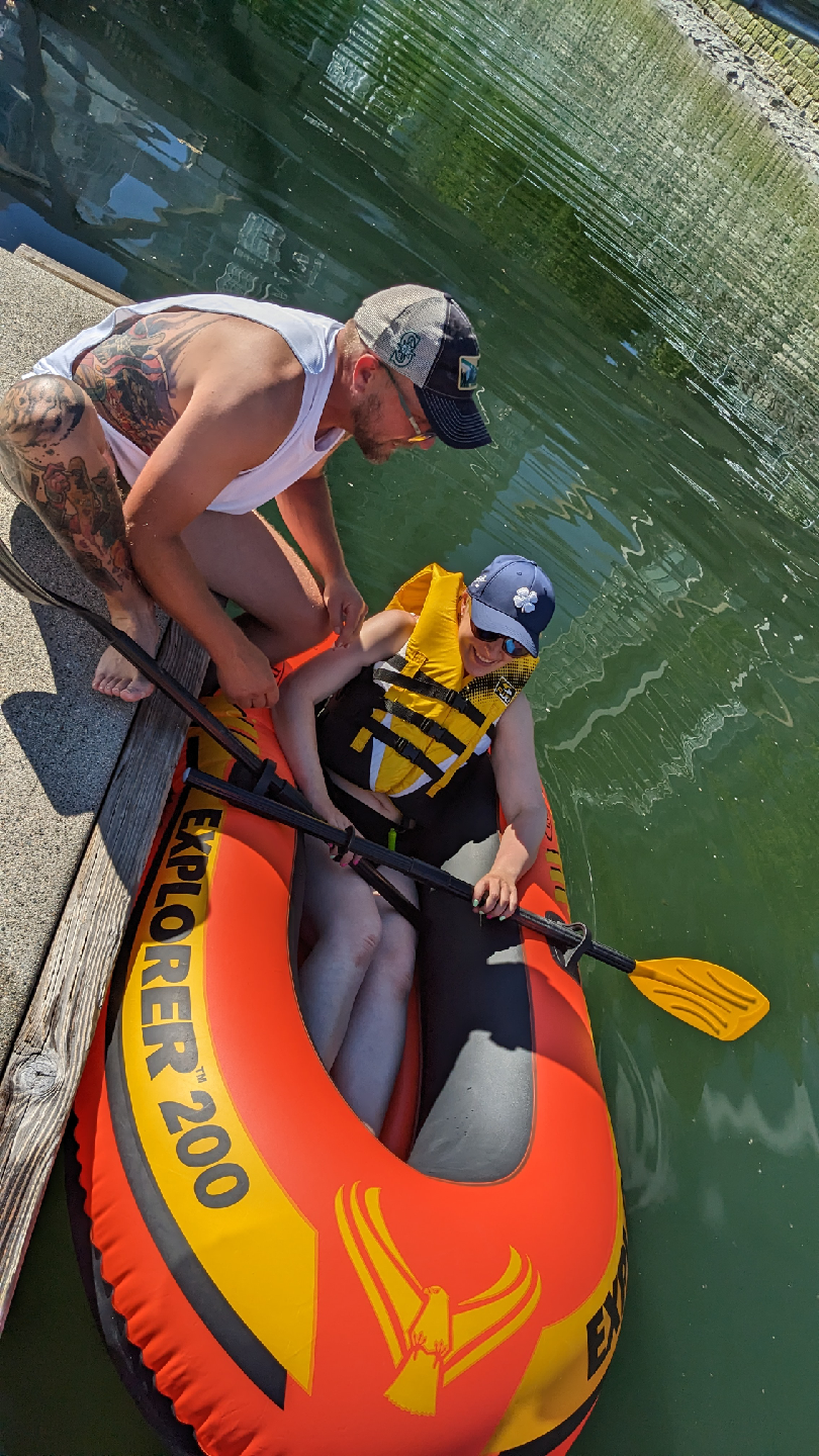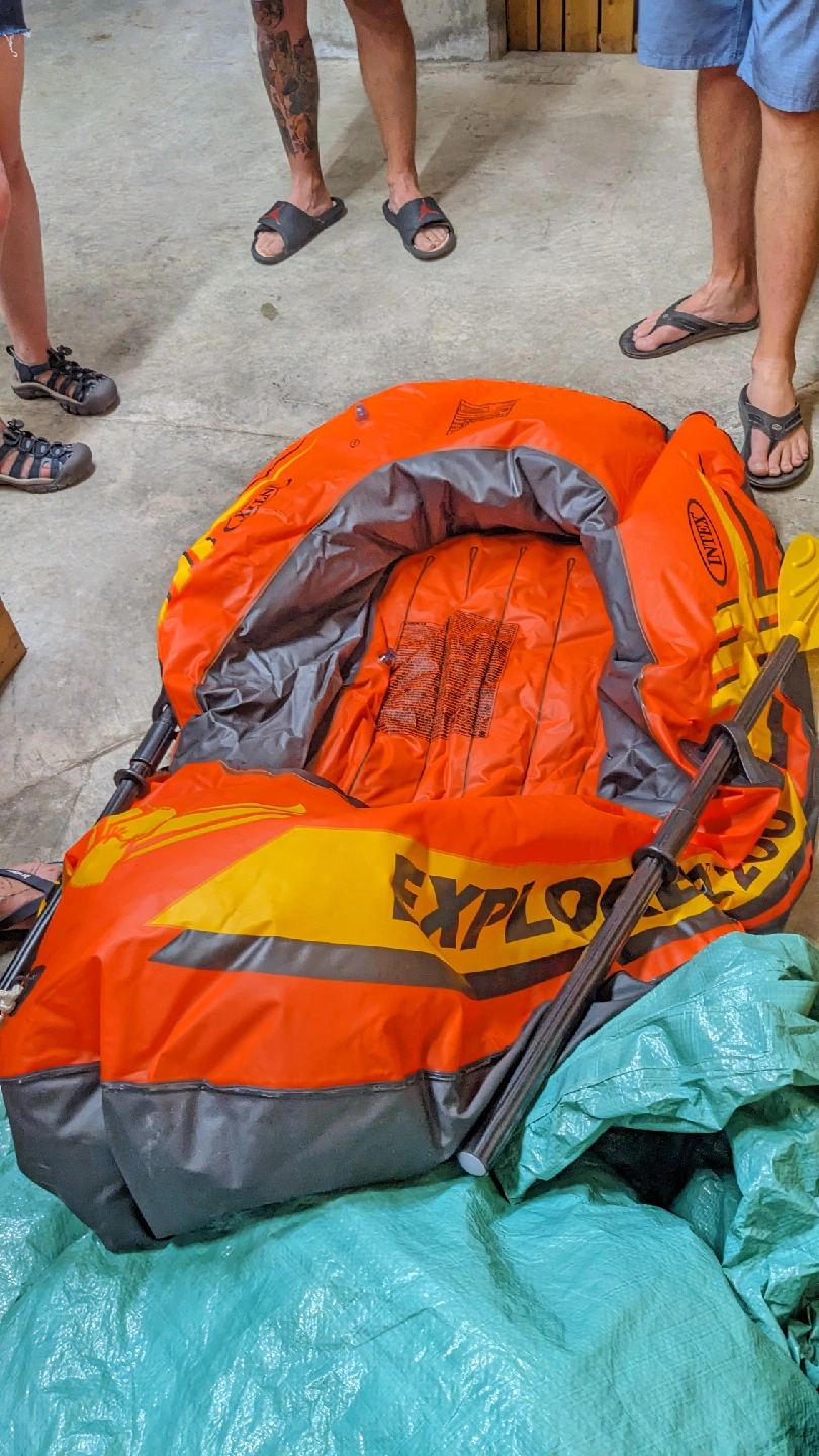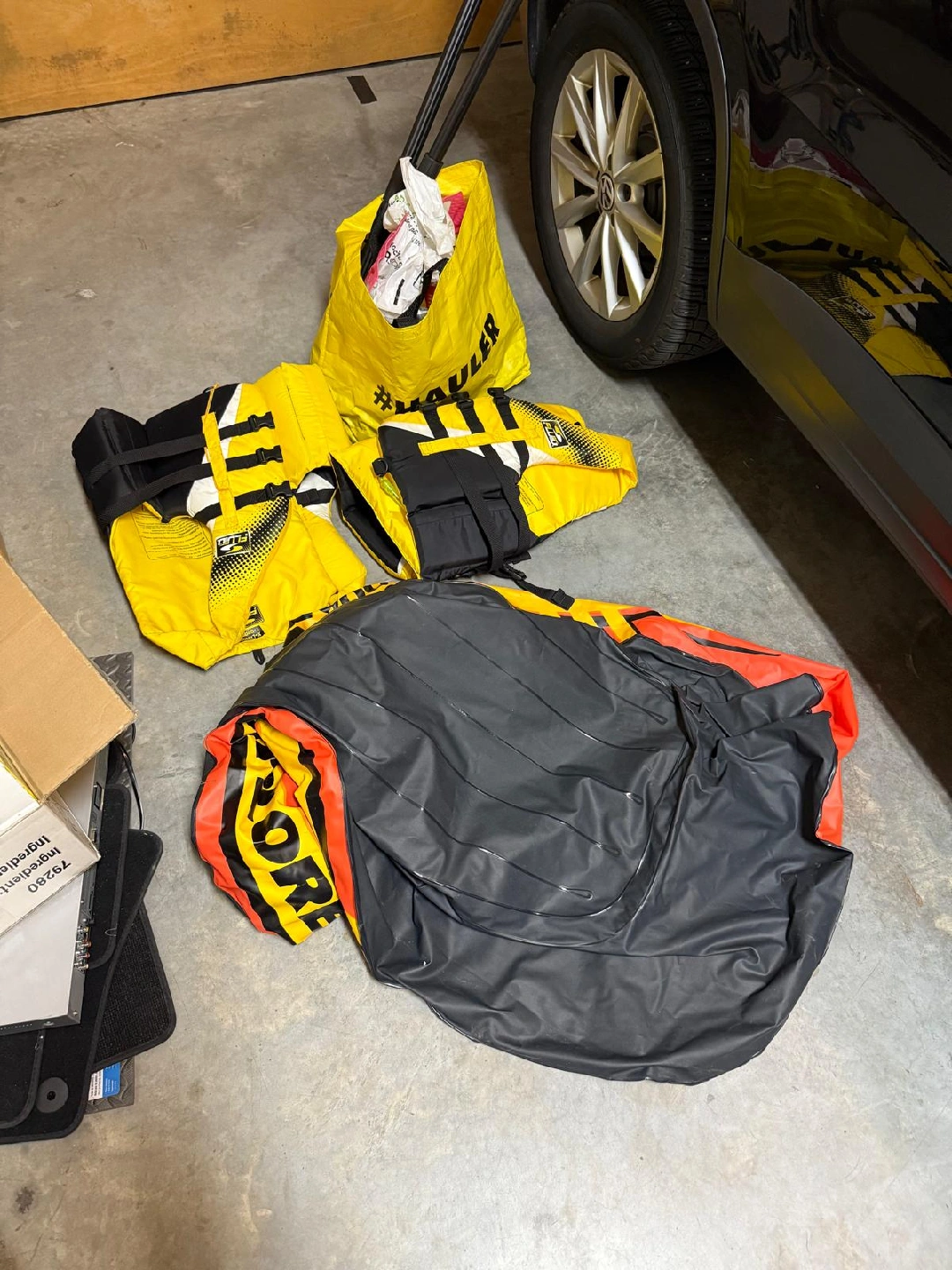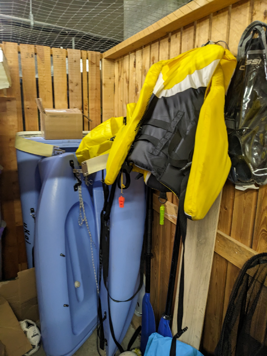 Collapsible kayak and water gear ; dolley(over 100$ alone), inflatable raft with pump ( can tow on kayak for a fun ride haha), all paddles, lifejackets w/ whistles, waterproof LED lights usb charged, dry bag, dry phone case, fishing stuff, etc) .