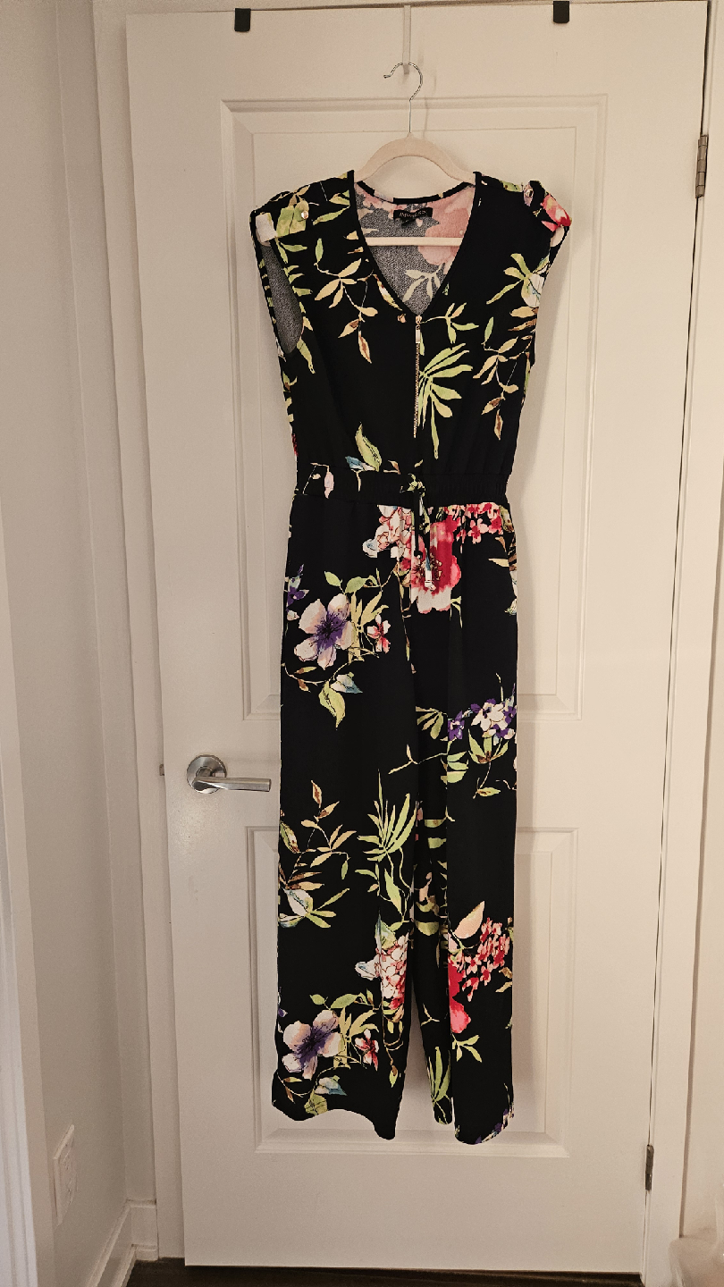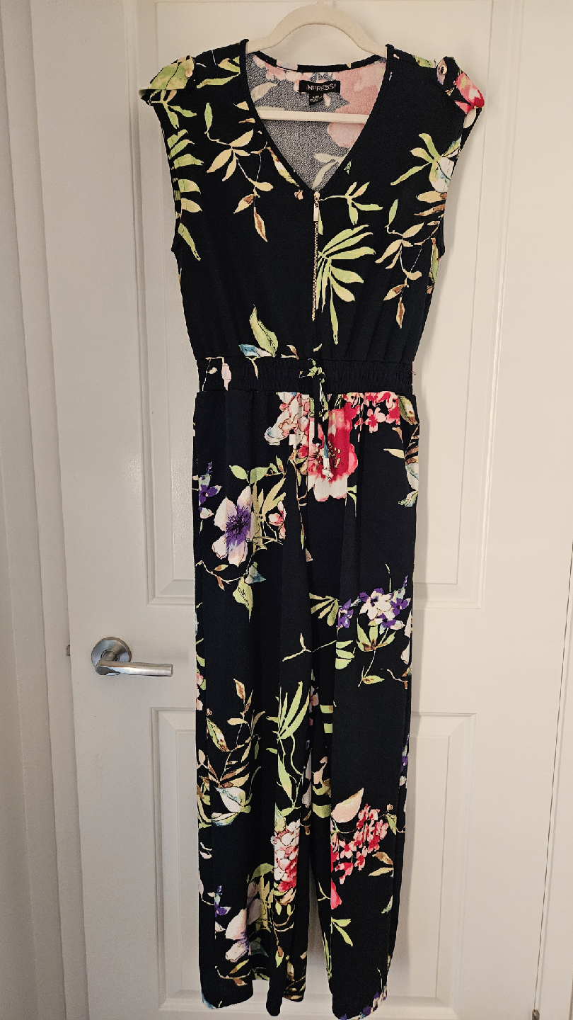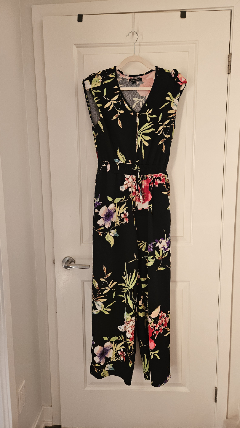 Selling a lovely floral jumpsuit from Impress! It's a size M and features a vibrant floral pattern on a black background. Perfect for a casual day out or a fall or summer evening!