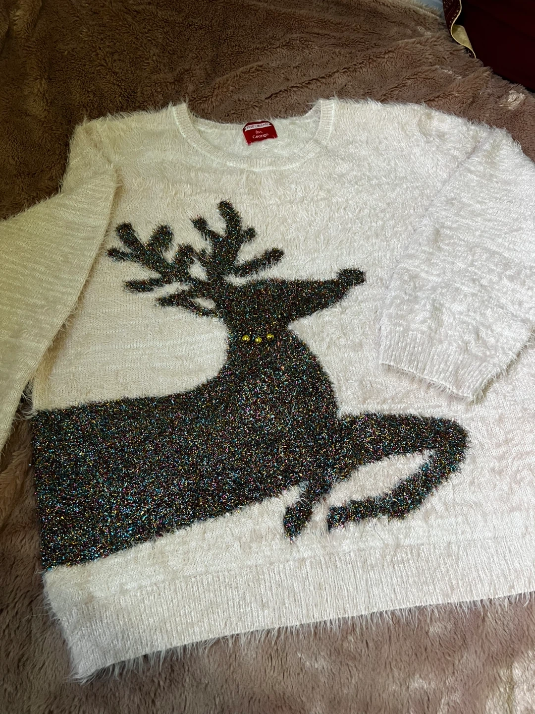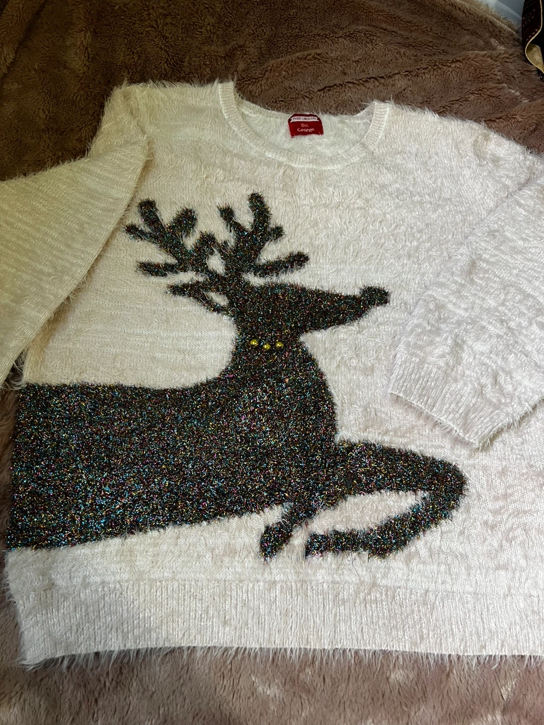 Cozy up this holiday season with this adorable George Christmas sweater! It features a festive reindeer design on a soft, white background. Perfect for spreading some cheer!