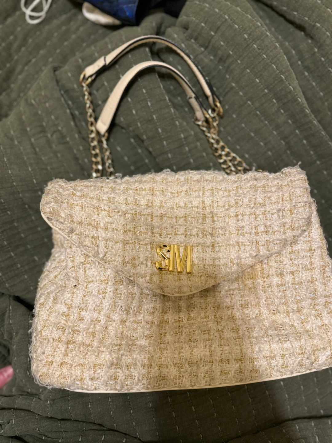 Check out this stylish Steve Madden shoulder bag! It features a unique tweed texture and gold chain detailing, perfect for adding a touch of elegance to any outfit
