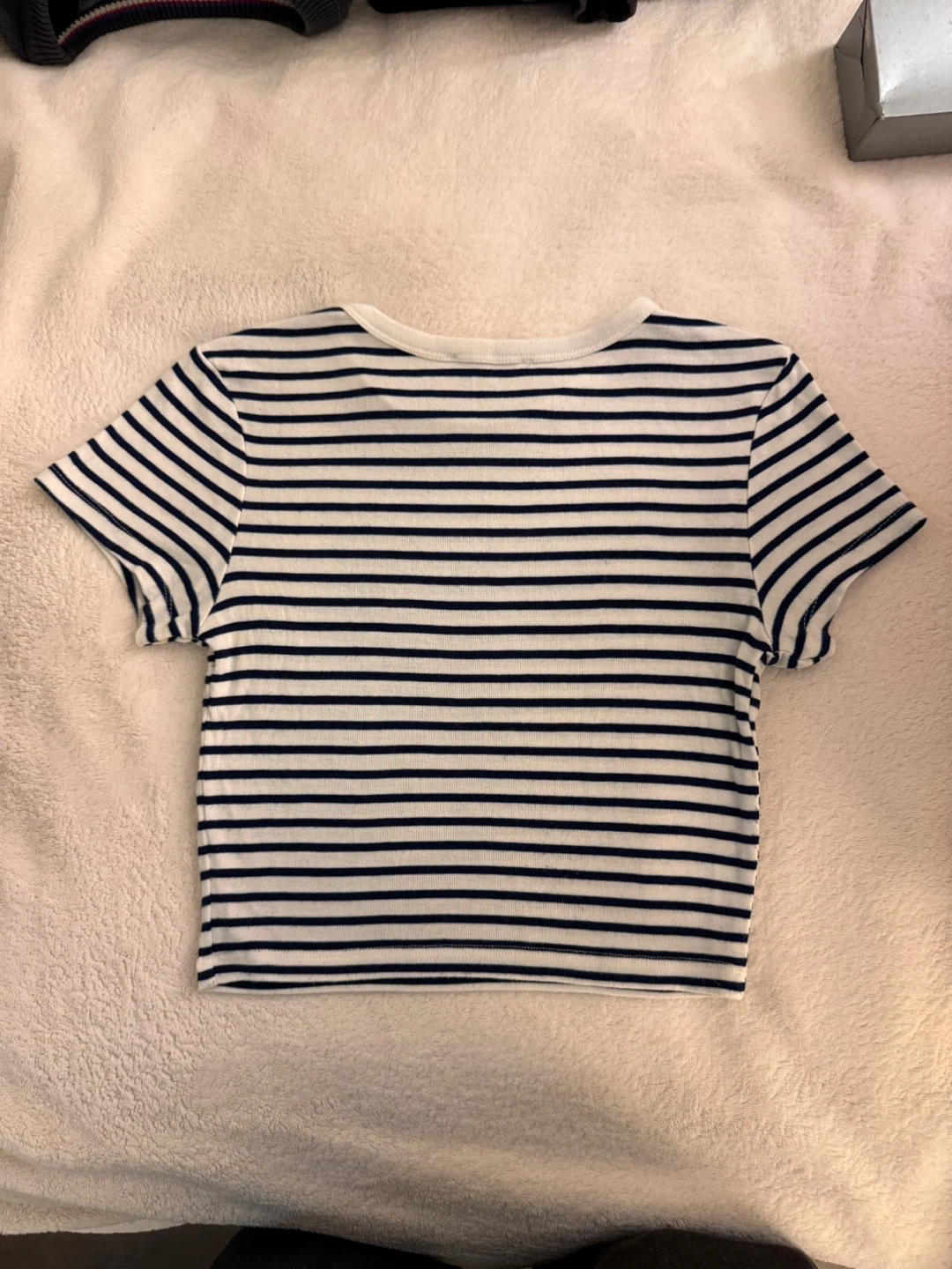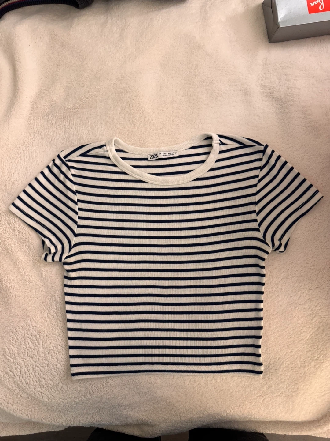 Cute Zara striped crop top in size small! It's in great condition and would look great with jeans or a skirt. The shirt is a navy and white stripe pattern. Made in Turkey.