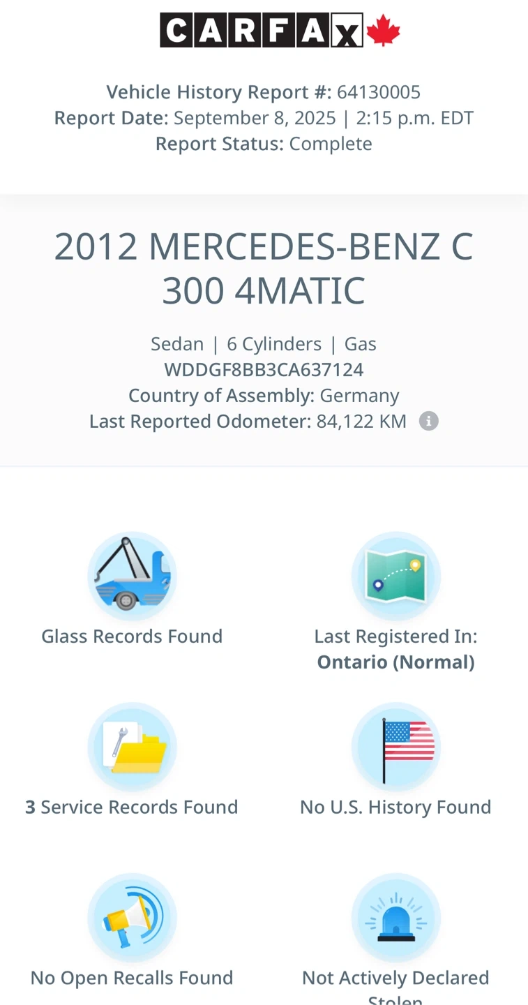 2012 Mercedes-Benz C300 4MATIC 125,000 km ๐ฅ Special Finance Price: $9,988 ๐ฐ Cash Price: $11,988 Features: โข AMG Sport Package โข Panoramic Roof โข Backup Camera โข No Accident โ Clean History ๐ Located in Toronto | Available today This Vehicle can be certified for an additional $999, if not Certified, then as per OMVIC Regulations the vehicle is deemed to be not drivable and Not Certified.