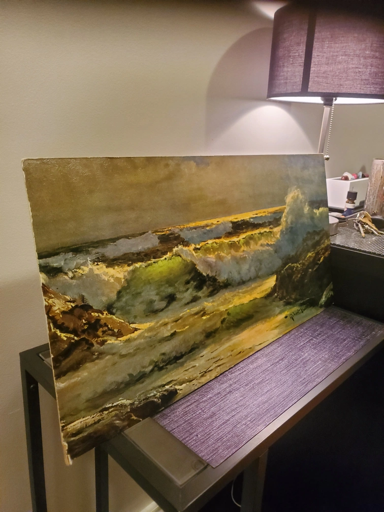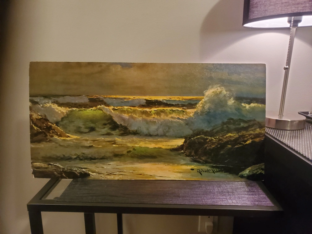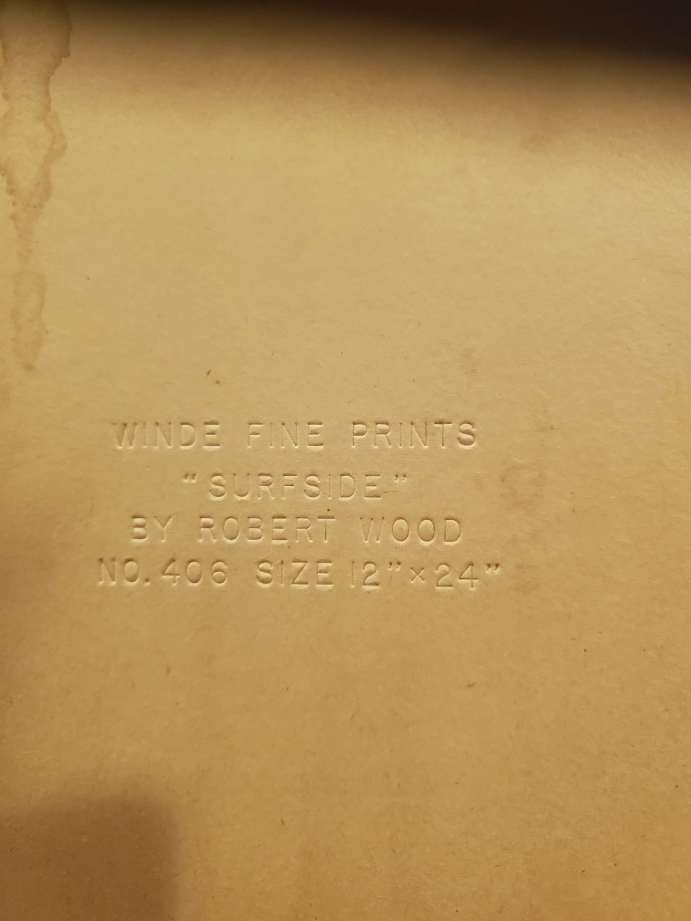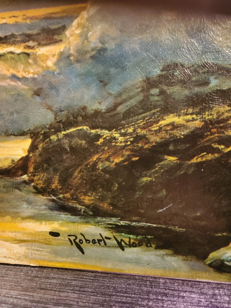 1960's lithograph print by Robert Wood. 12x24 inches. This is a vintage print with a very moody and emotional vibe. Considering the age, the piece has been kept in very reasonable shape, the art is undamaged however the backside shows some minor aging and moisture from storage (as shown in last pic) But the front is near perfect condition.