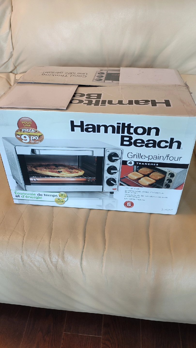 used Hamilton Beach toaster oven, still in its original box in great condition! perfect for small kitchens, studios, cottages, quick meals.