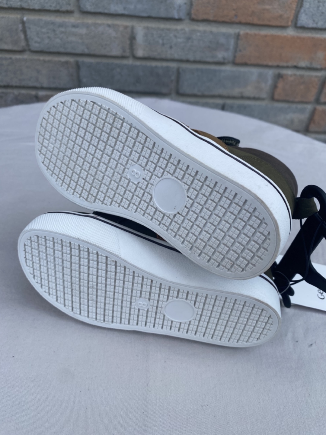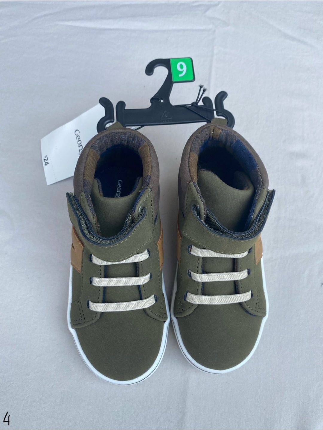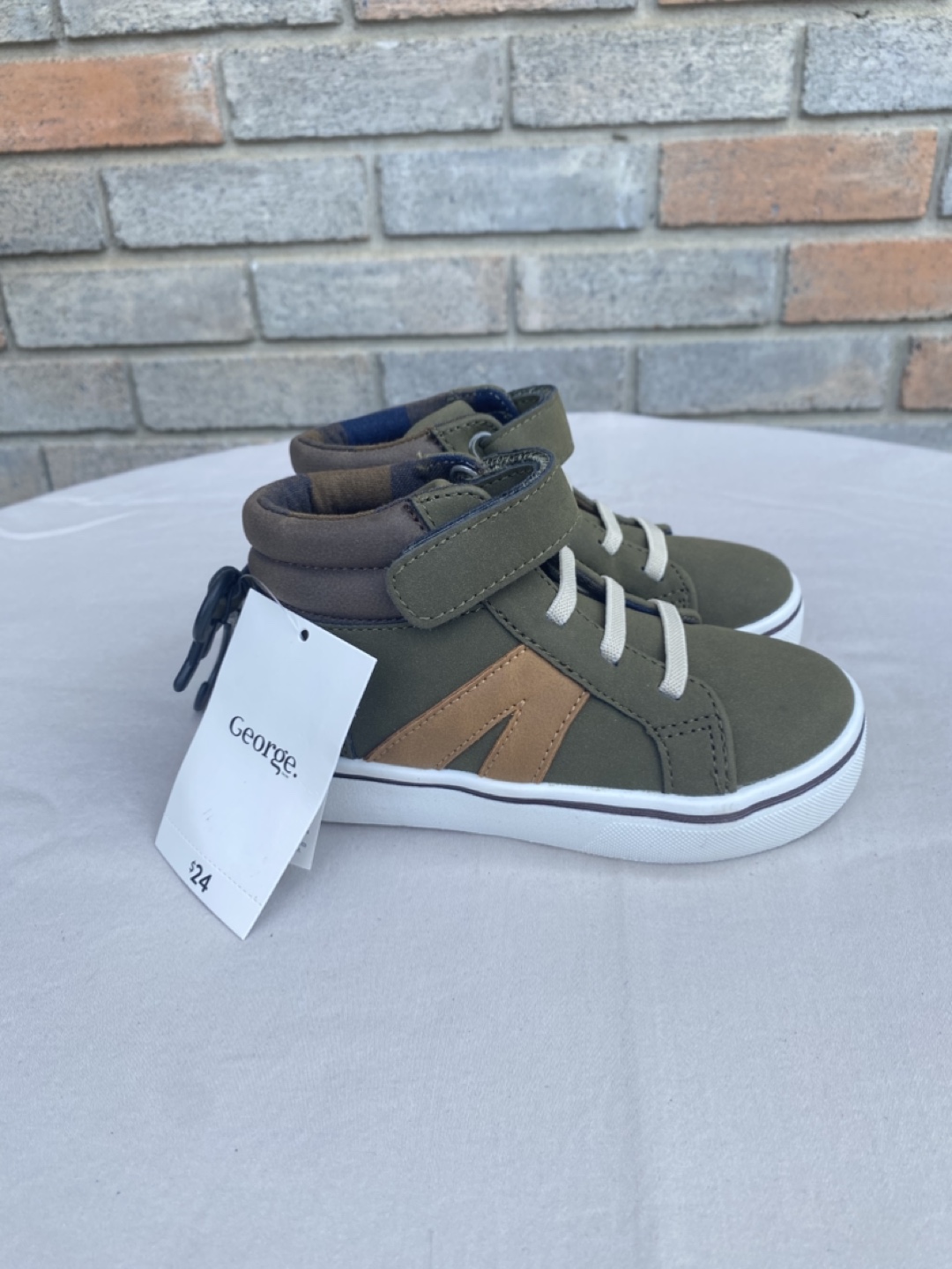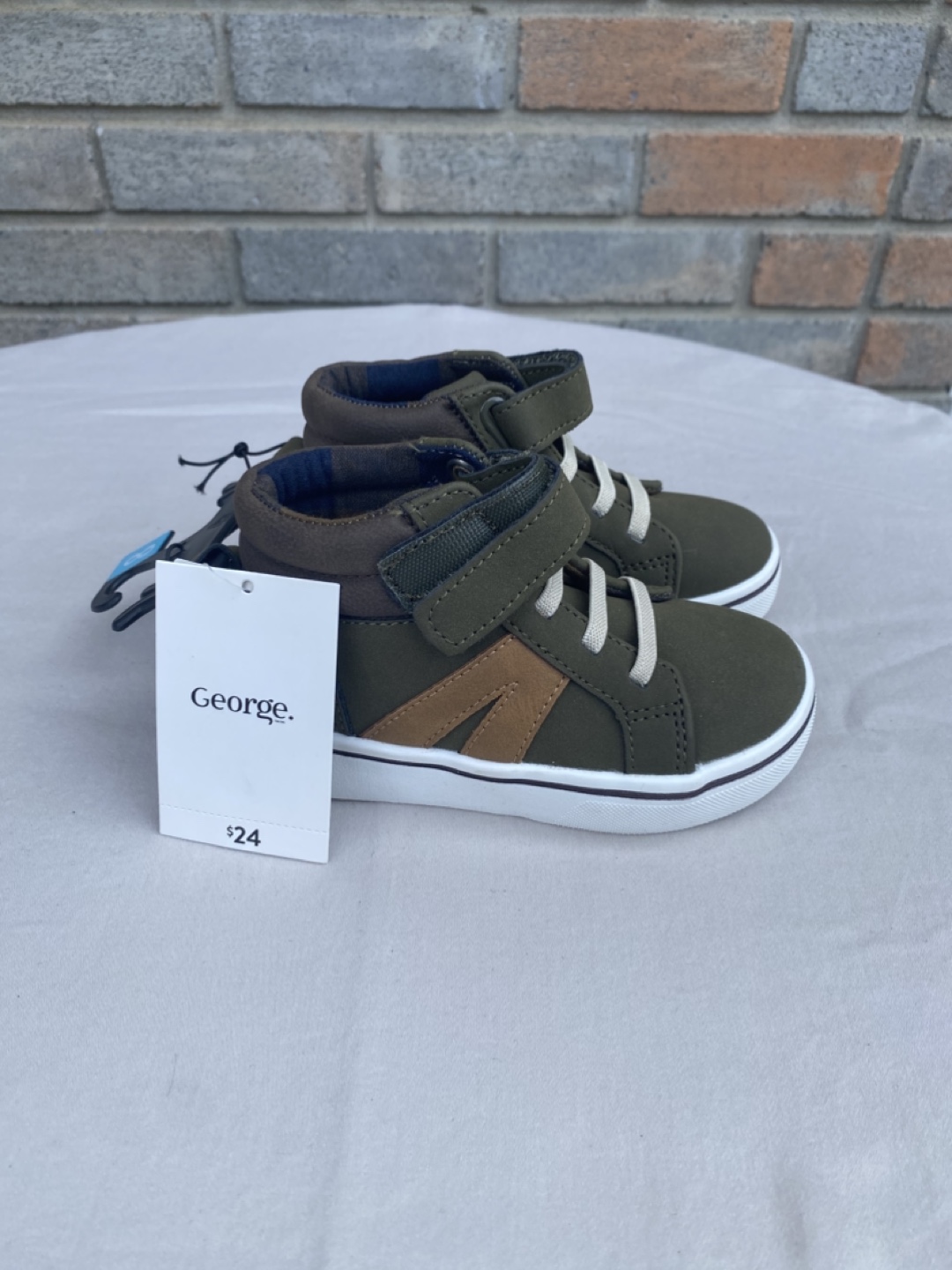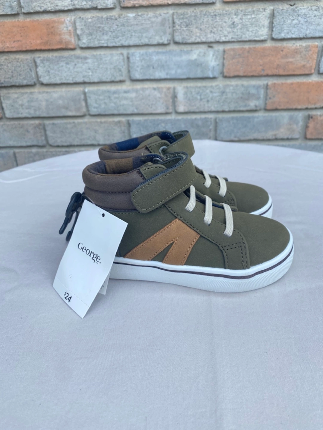 These are a brand new pair of George. toddler boy's high top sneakers! They feature a stylish olive green and brown colour combination. They have velcro straps and laces.