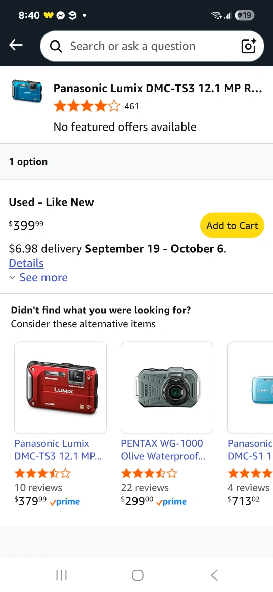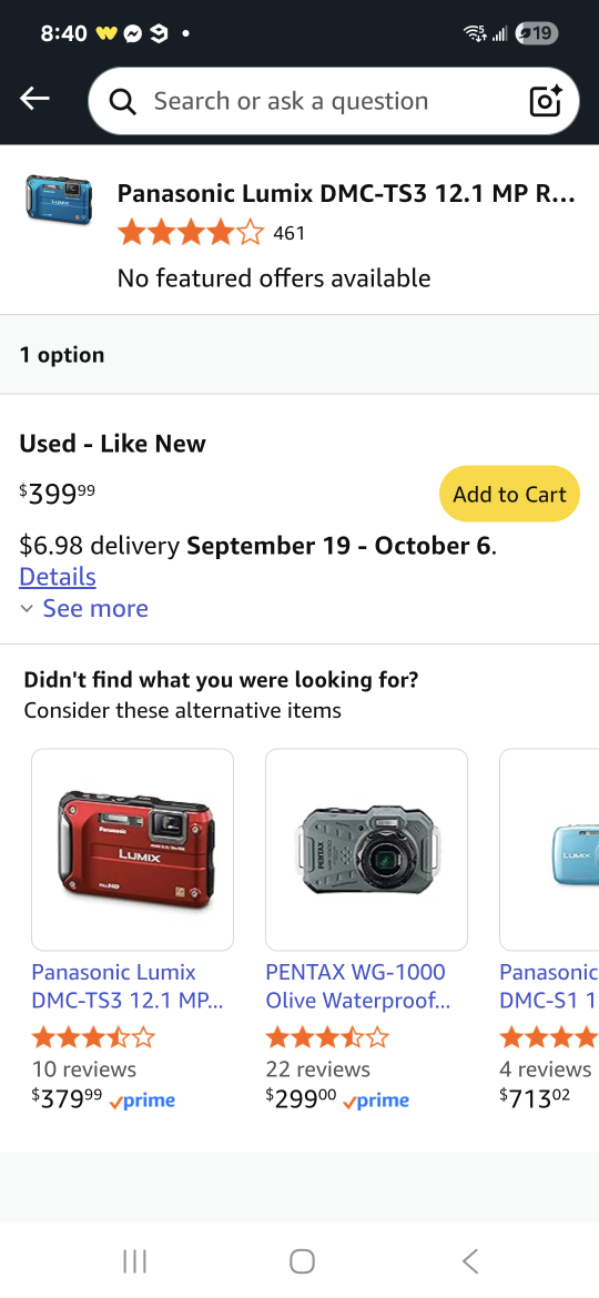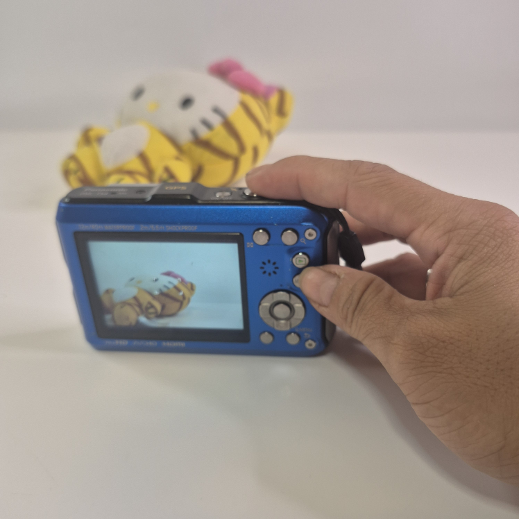 Selling a blue Panasonic Lumix DMC-TS4 digital camera. It's waterproof up to 12m/40ft and shockproof up to 2m/6.6ft. It also features GPS. The screen shows a date of 2025 September 13.