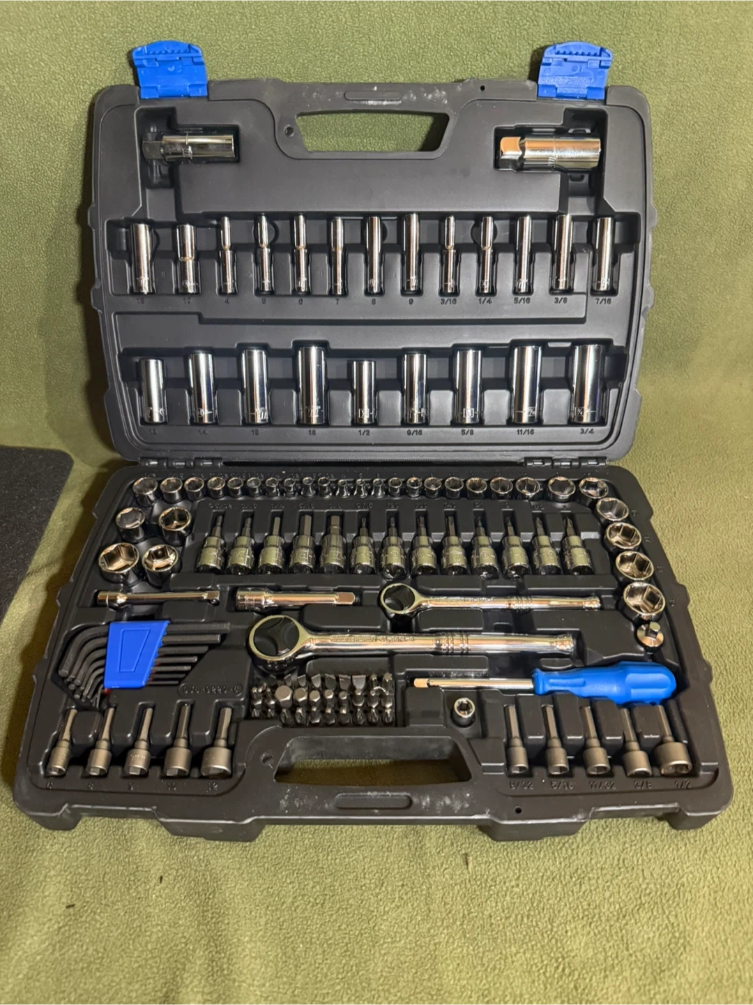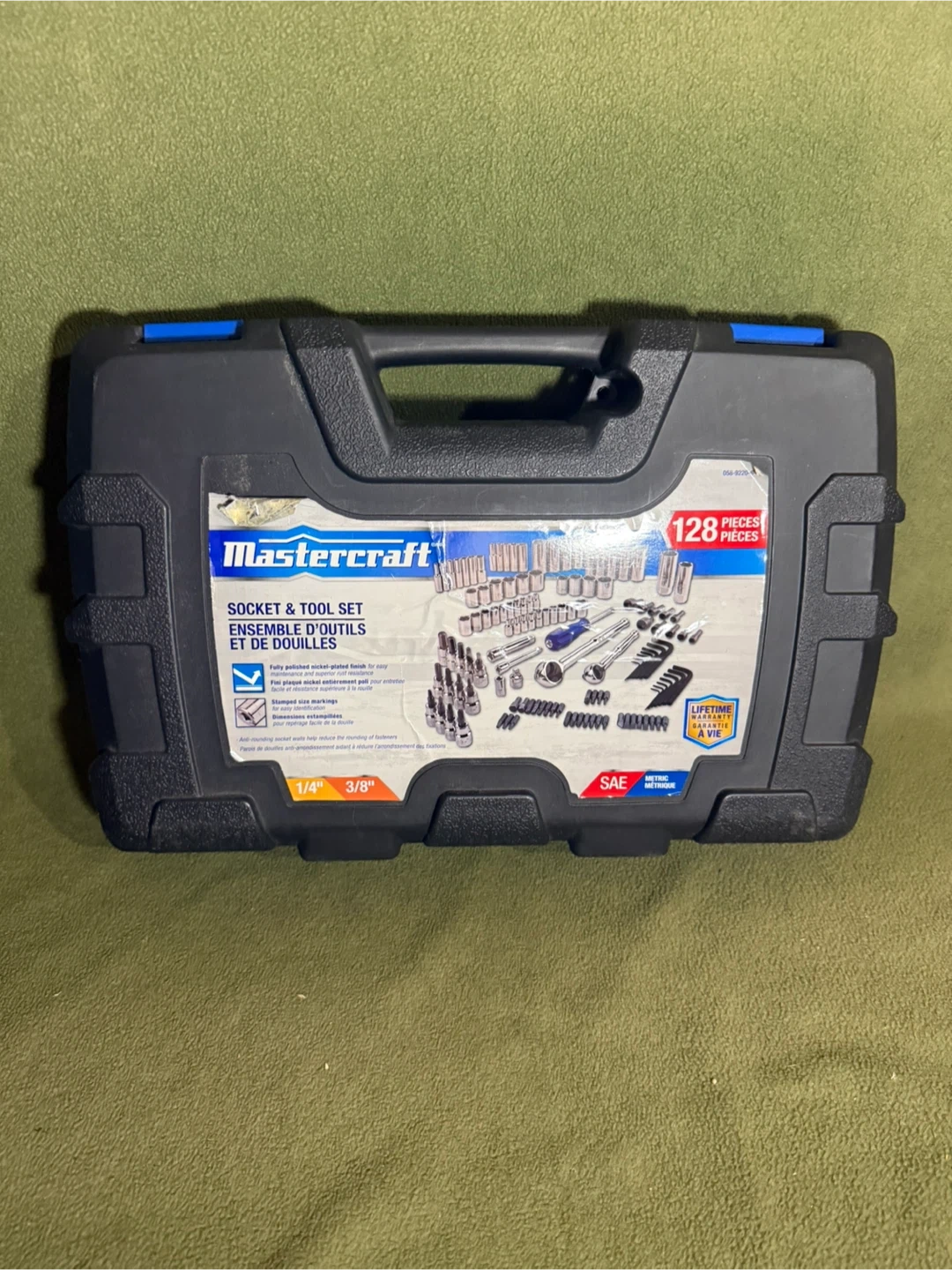 I'm offering a Mastercraft 128-piece socket and tool set, perfect for various tasks! This set includes a comprehensive selection of sockets and tools, ideal for both DIY enthusiasts and professionals. The set is used but in good condition. This versatile set ensures you're well-equipped for any project that comes your way!