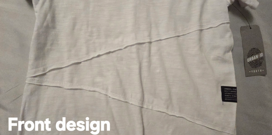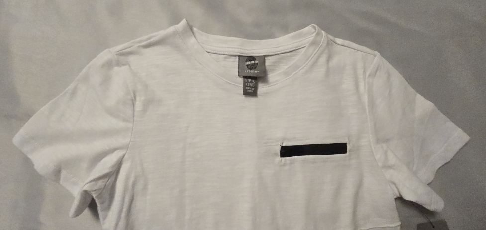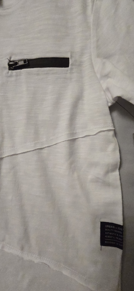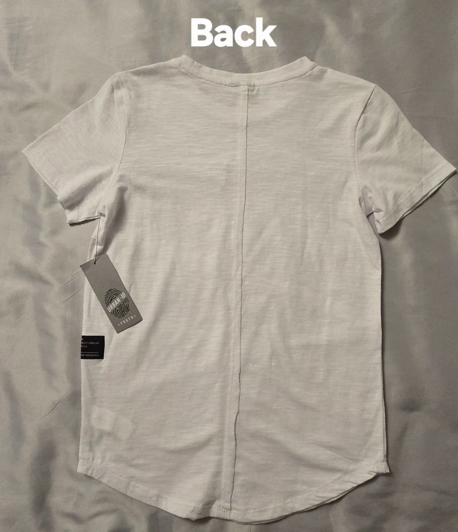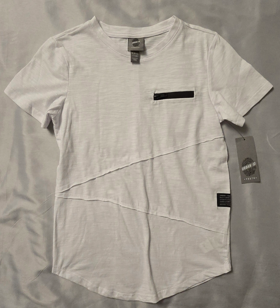 This is a brand new Urban ID youth t-shirt! It's white and size S (7/8). It has a cool, unique design with a small zipper pocket on the chest! Cool design on the back! Very stylish and goes well with jeans or khakis!