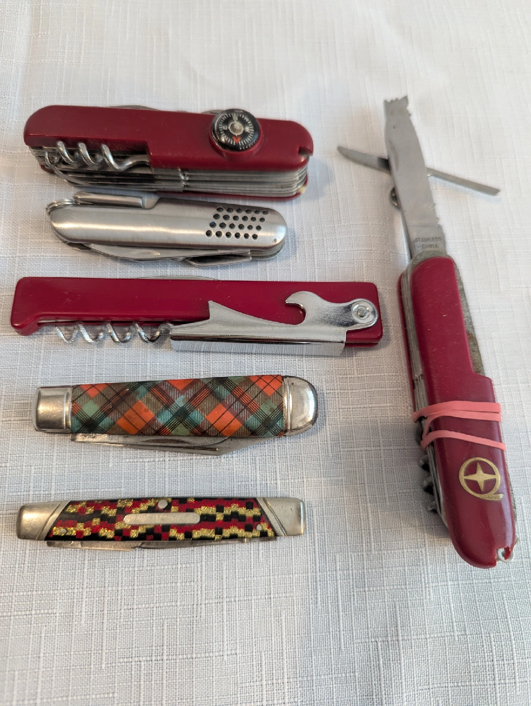Selling a collection of five vintage Swiss Army style knives and others. They show signs of wear and use, but they're still functional and have a lot of character. Great for collectors or anyone who appreciates classic tools! Selling as a lot. Some of these have seen better days but I am sure someone can clean these up.