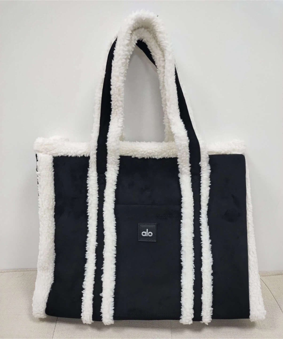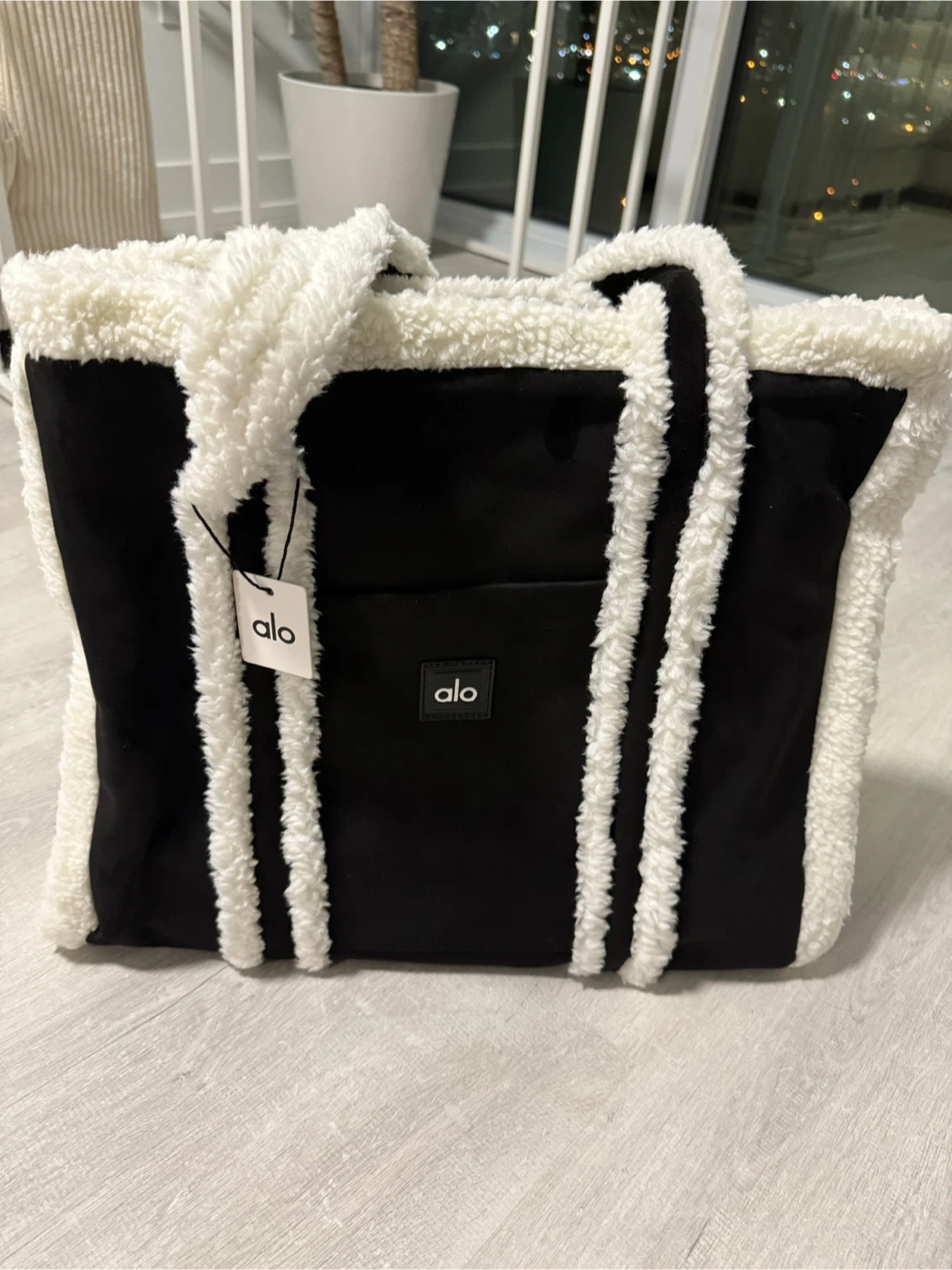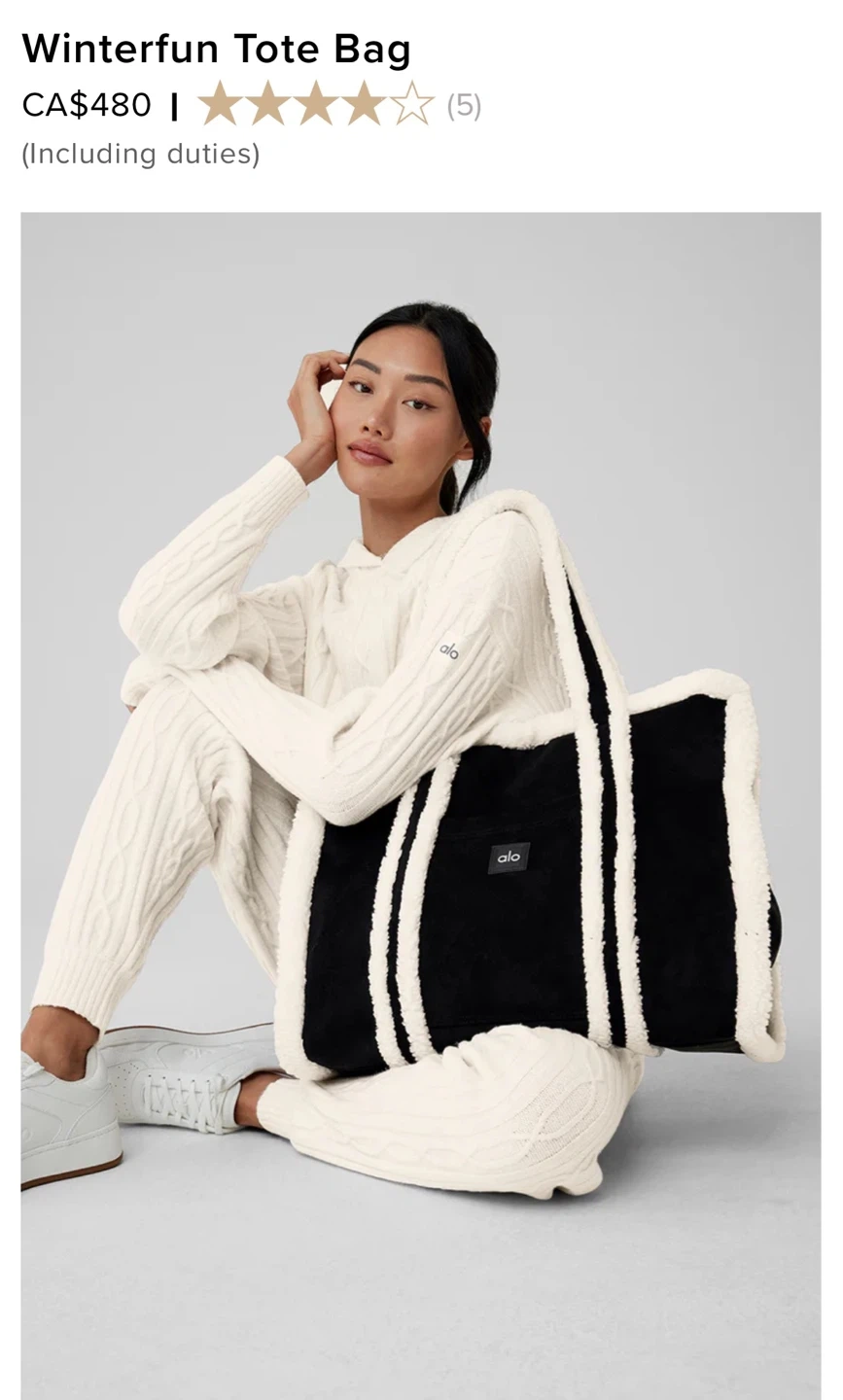 Selling an ALO Winterfun Tote Bag! It's brand new and authentic with tags. Features a stylish black and white design with a cozy sherpa trim. This tote is perfect for carrying all your essentials. The original listing shows it retails for $480 CAD.