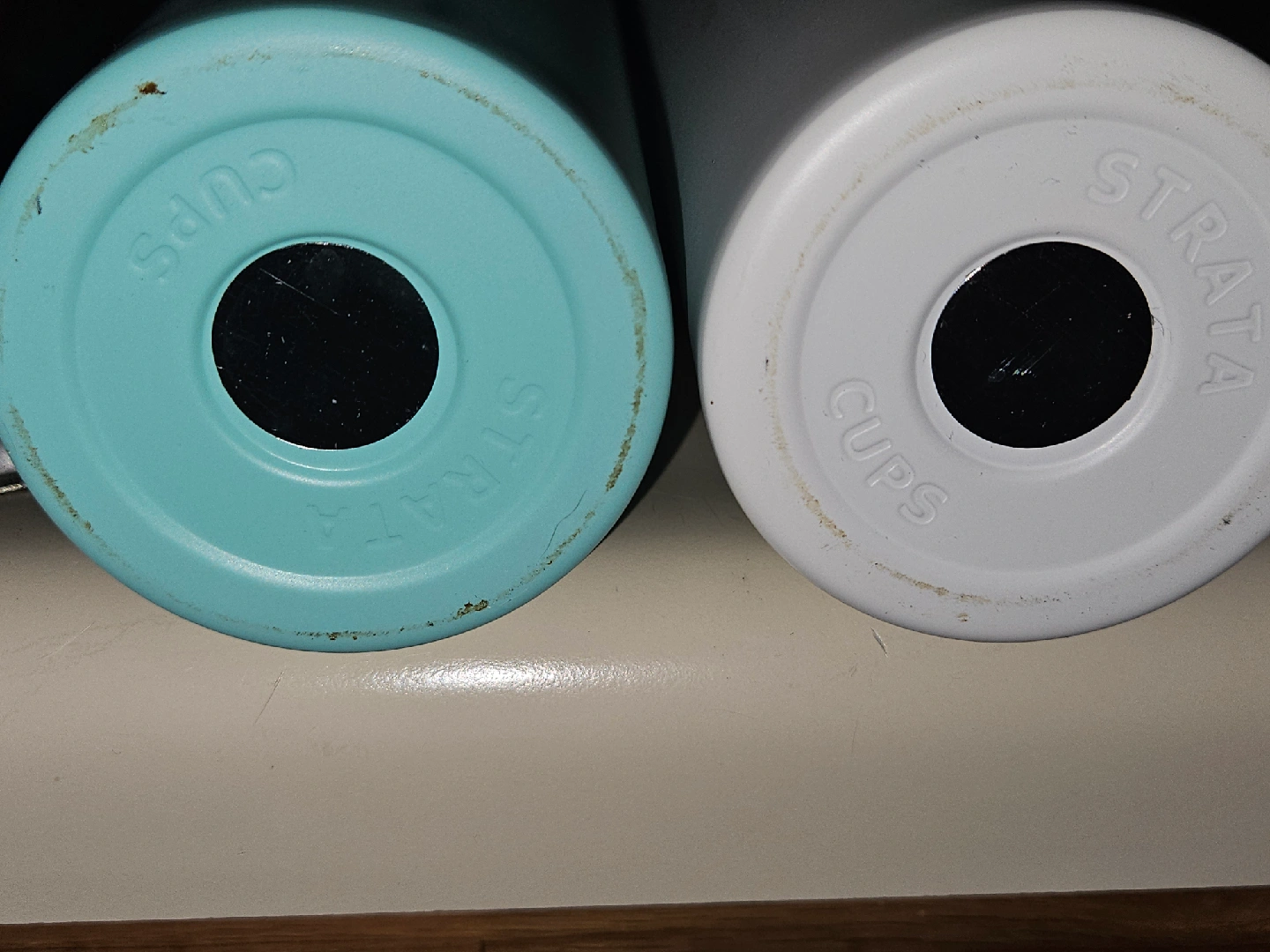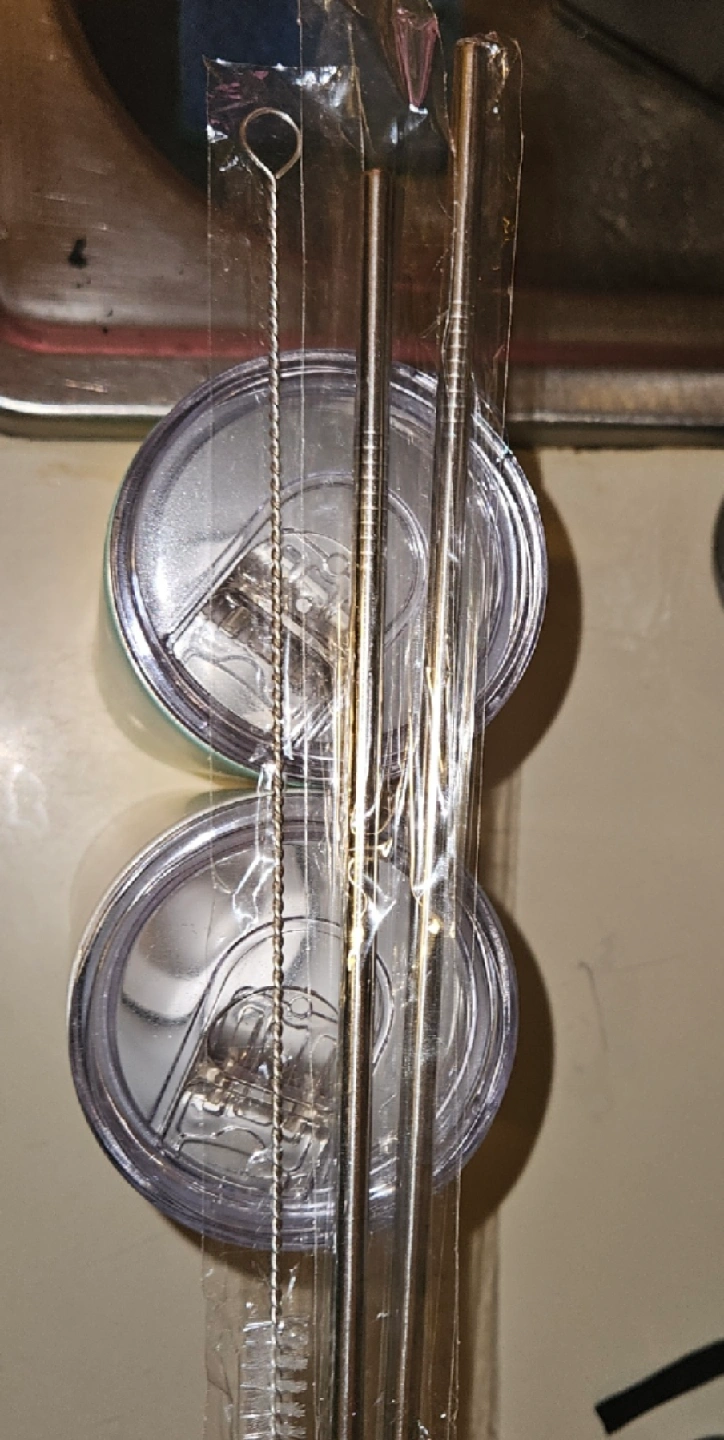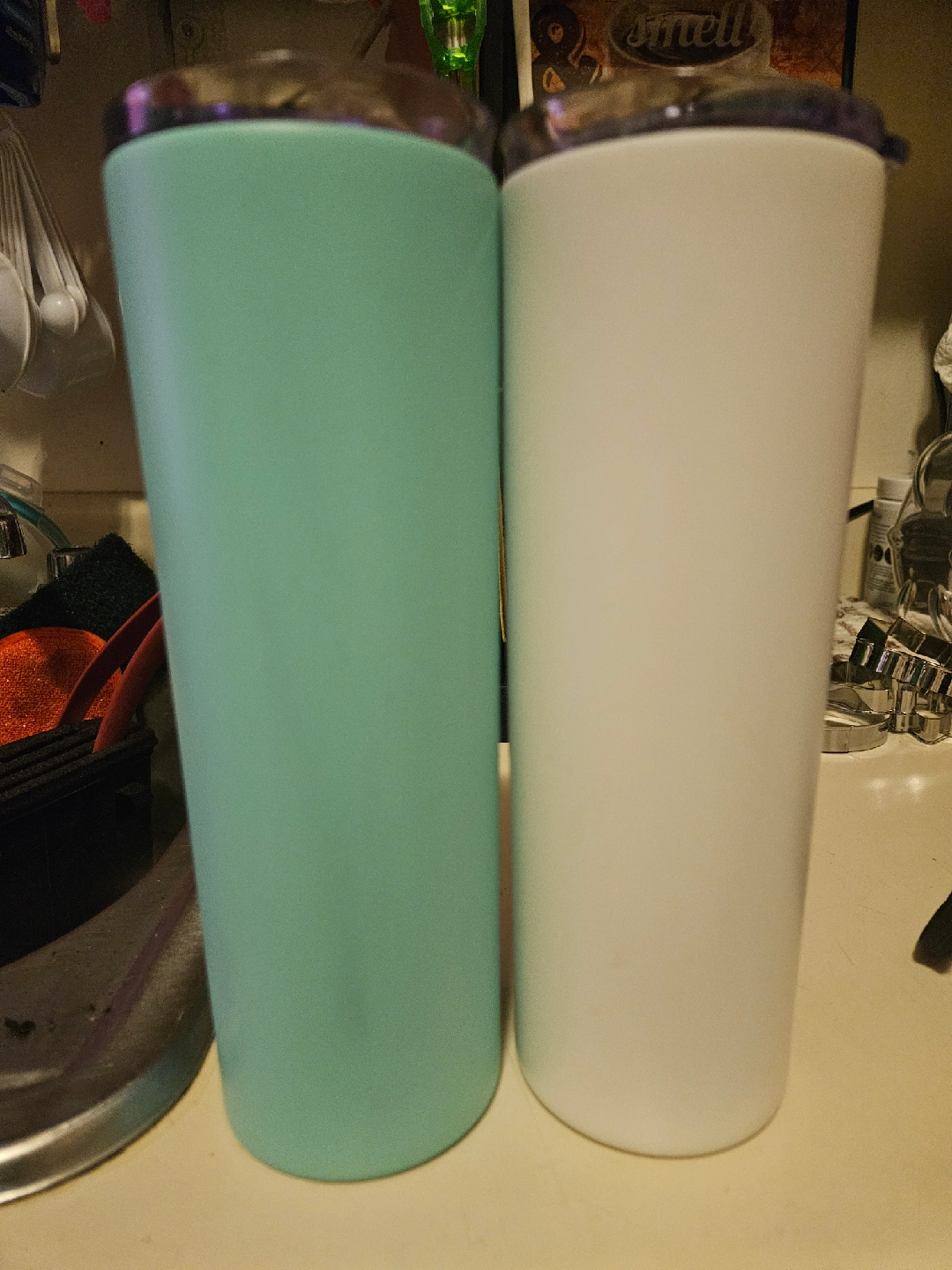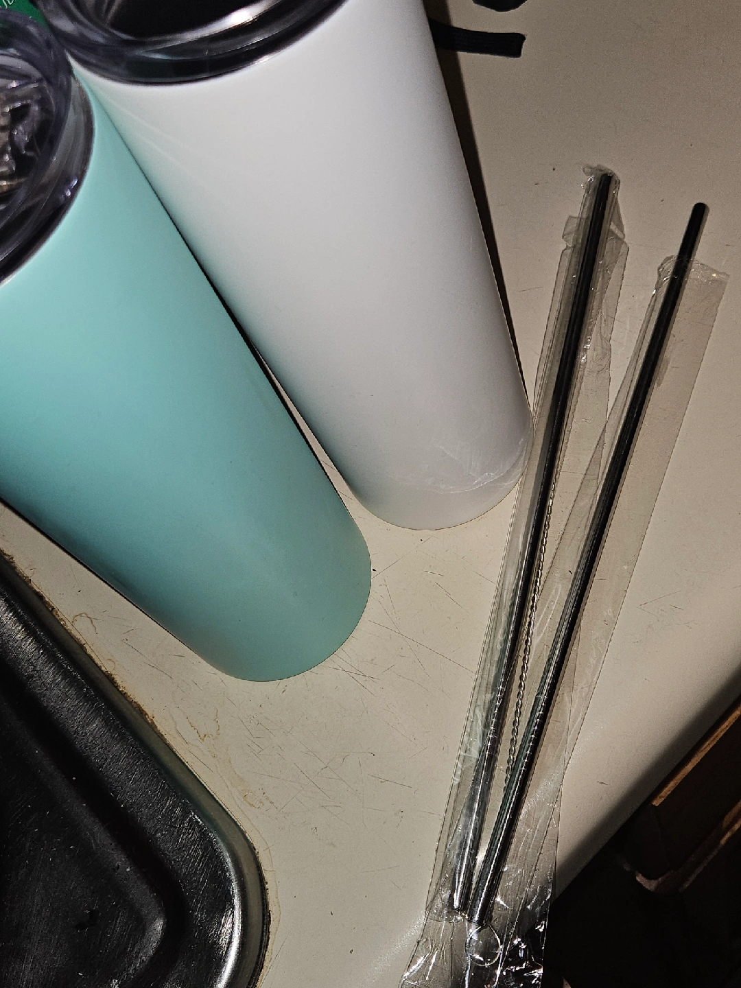 I have two 20oz stainless steel tumblers for sale. One is a light green/blue color and the other is white. They both come with lids, metal straws, and cleaning brushes!