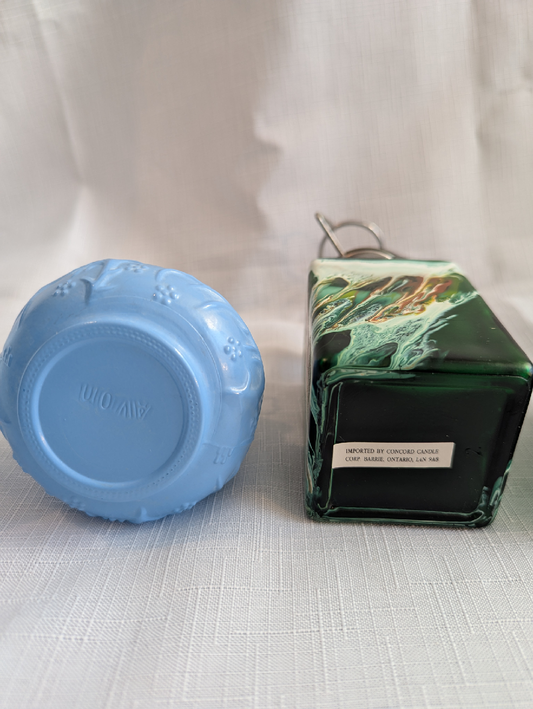 Selling a lovely vintage Avon bottle made of Blue Milk Glass with a white Milk Glass shade. This is purely a decorative lamp. It is not actually a lamp. There is no way to light it.