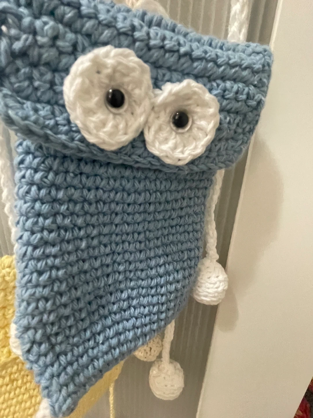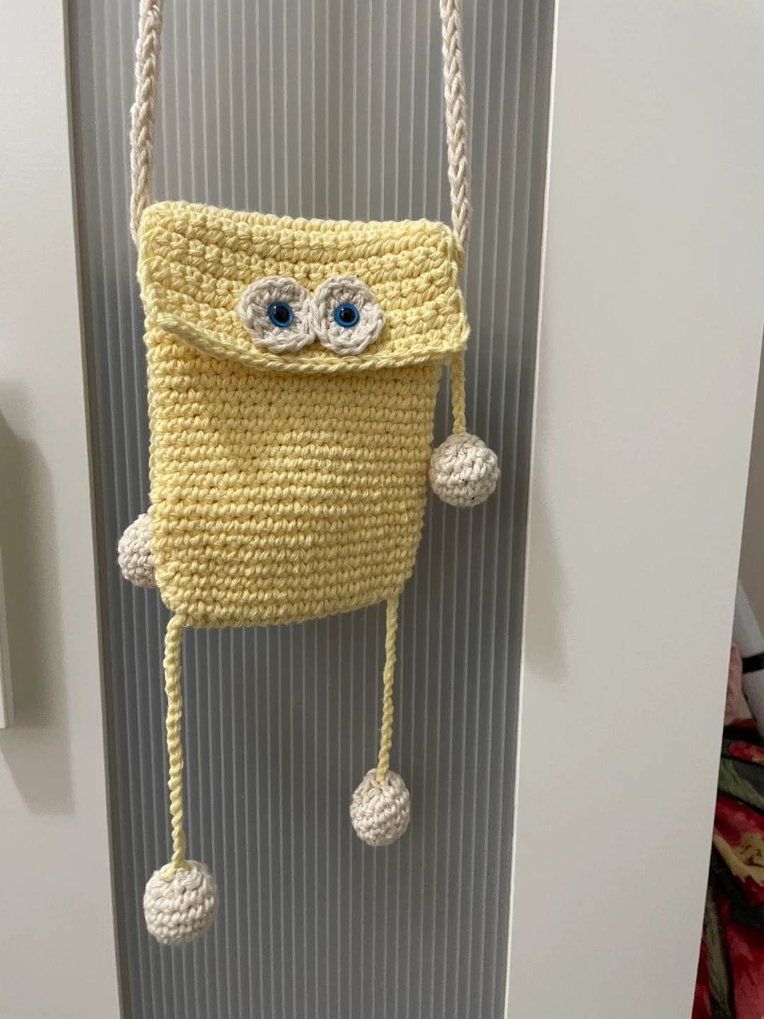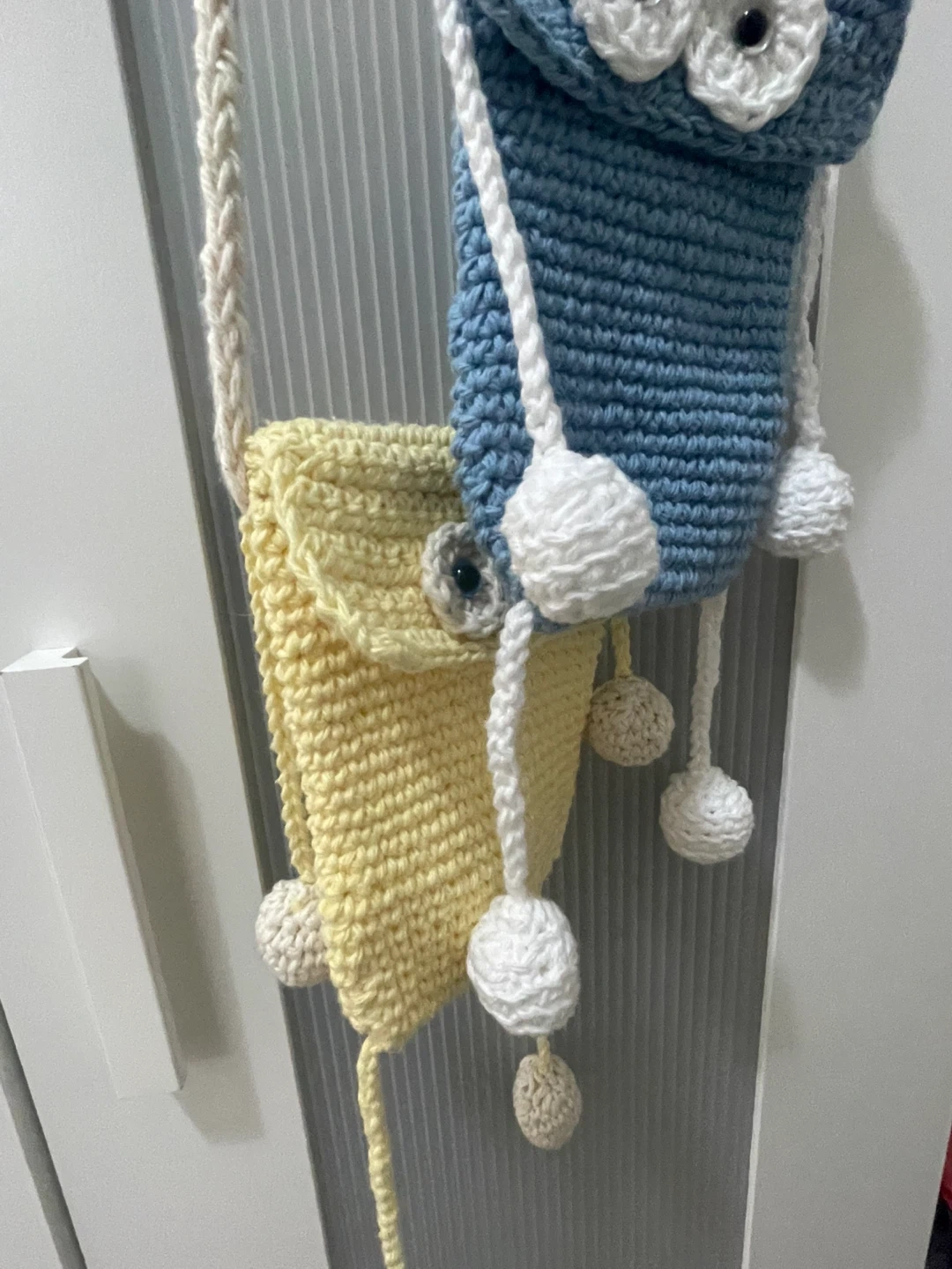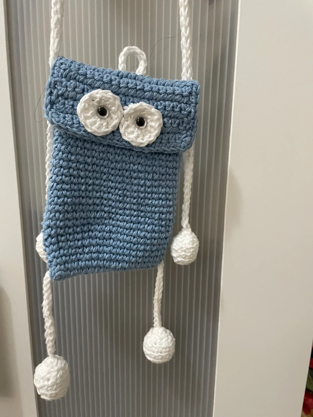 Super cute handmade crochet owl purse! Perfect for carrying small items. Available in light blue and yellow. The purse has a flap closure and a long strap for easy carrying. Great for kids or anyone who loves unique accessories, with a magnetic snap