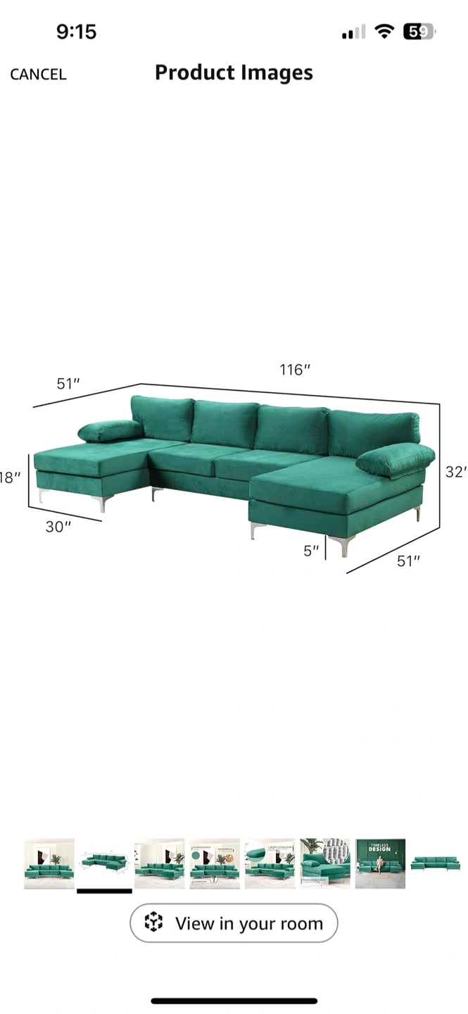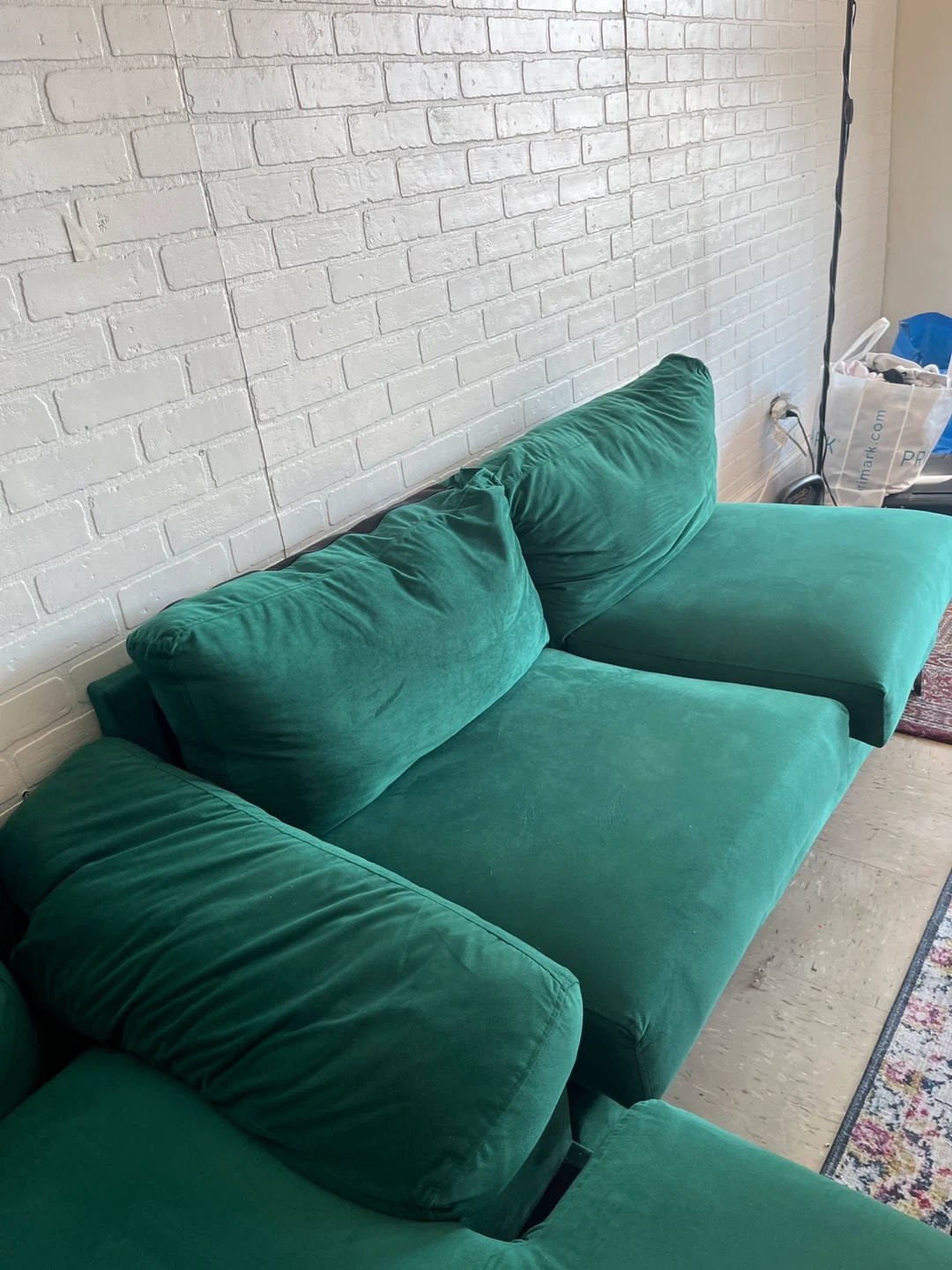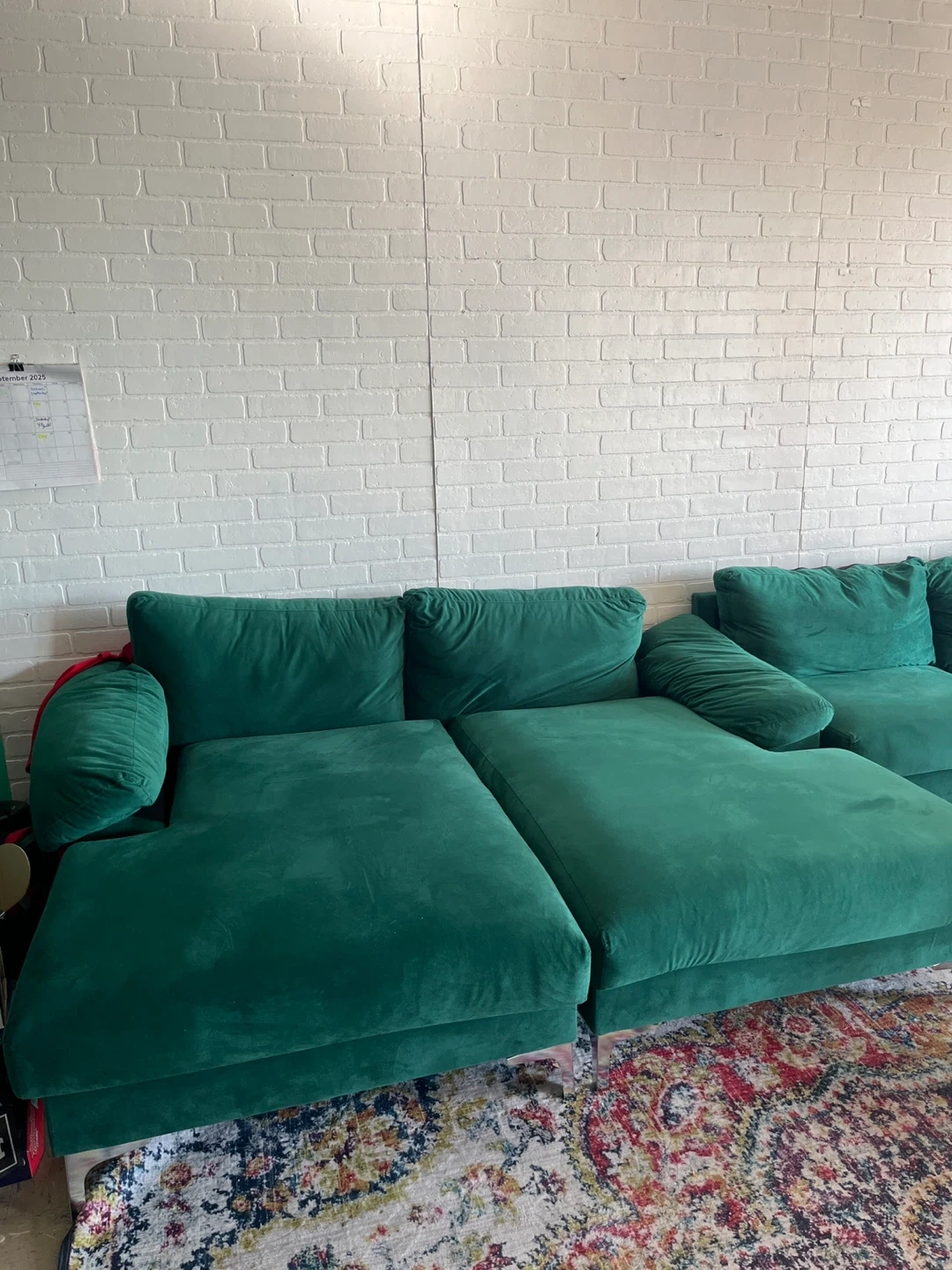 Selling a green velvet sectional sofa. It features a hand-picked ultra soft and durable velvet blend fabric. The dimensions are approximately 116" x 51". It's a beautiful and comfortable piece for any living room