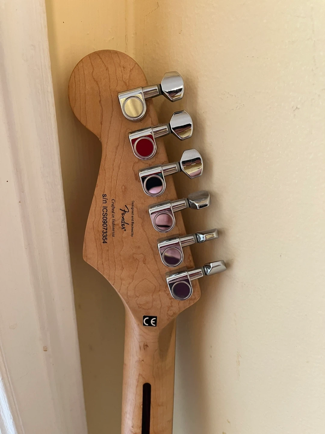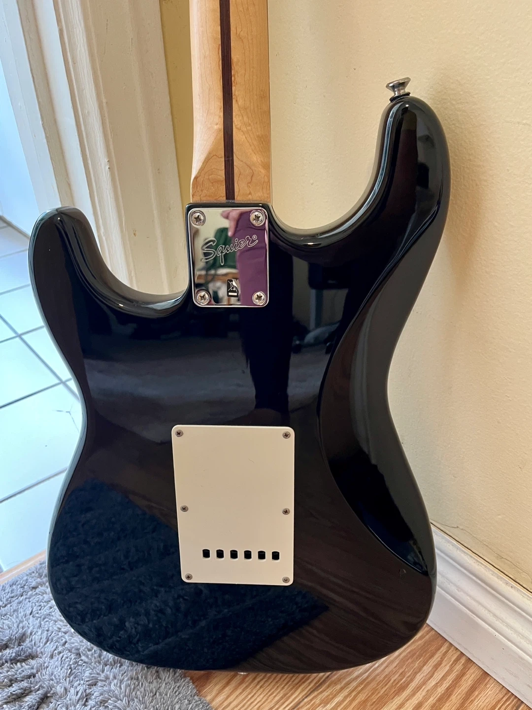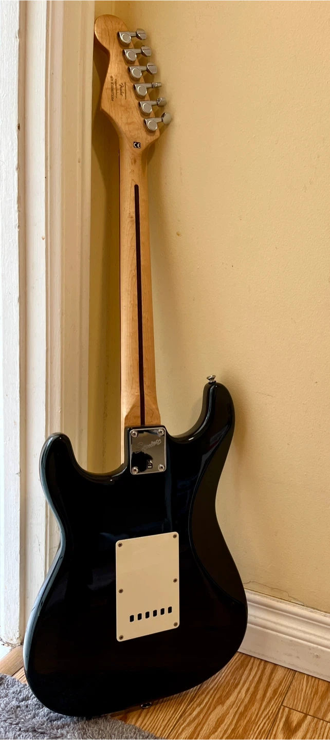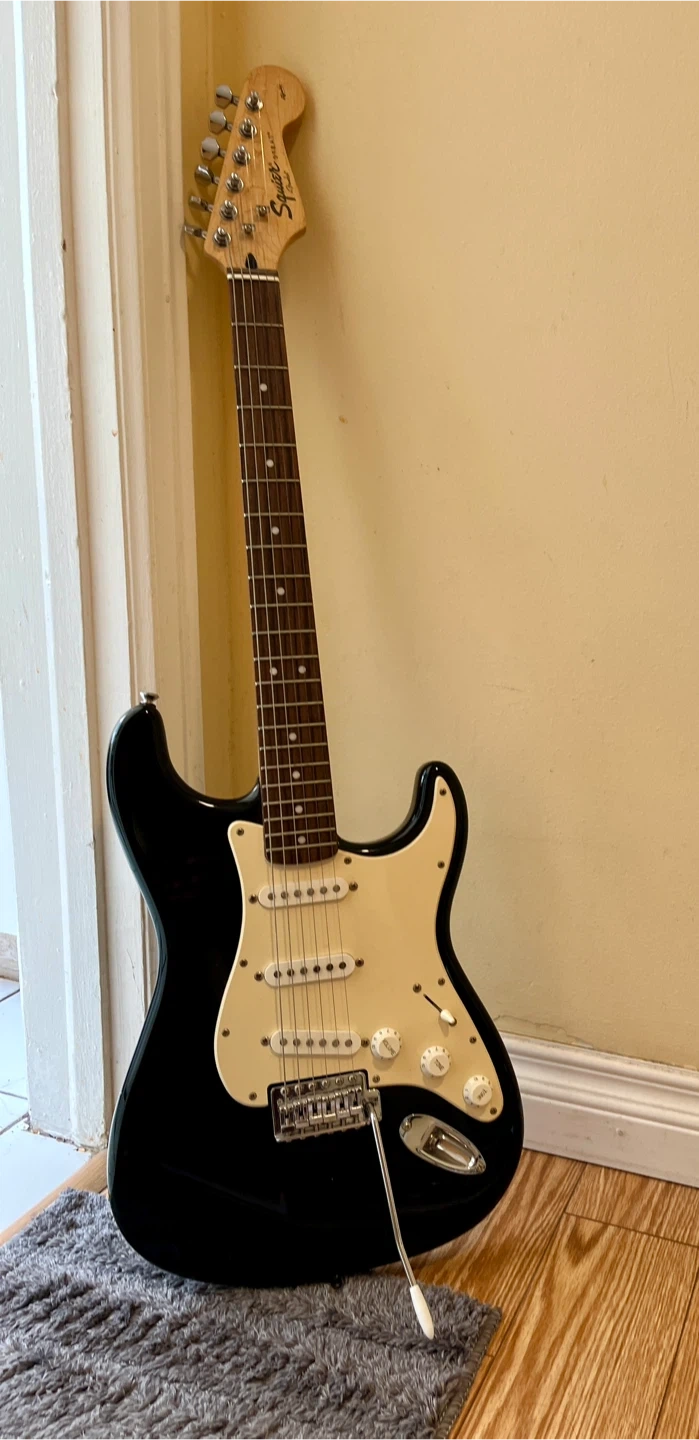 Selling a Squier Stratocaster electric guitar with whammy bar - ready to play! The guitar features a classic black finish and the iconic Stratocaster body style. Perfect for beginners or experienced players looking for a reliable instrument Has a few minor scratches from use Pick up at broadview avenue Open to offers