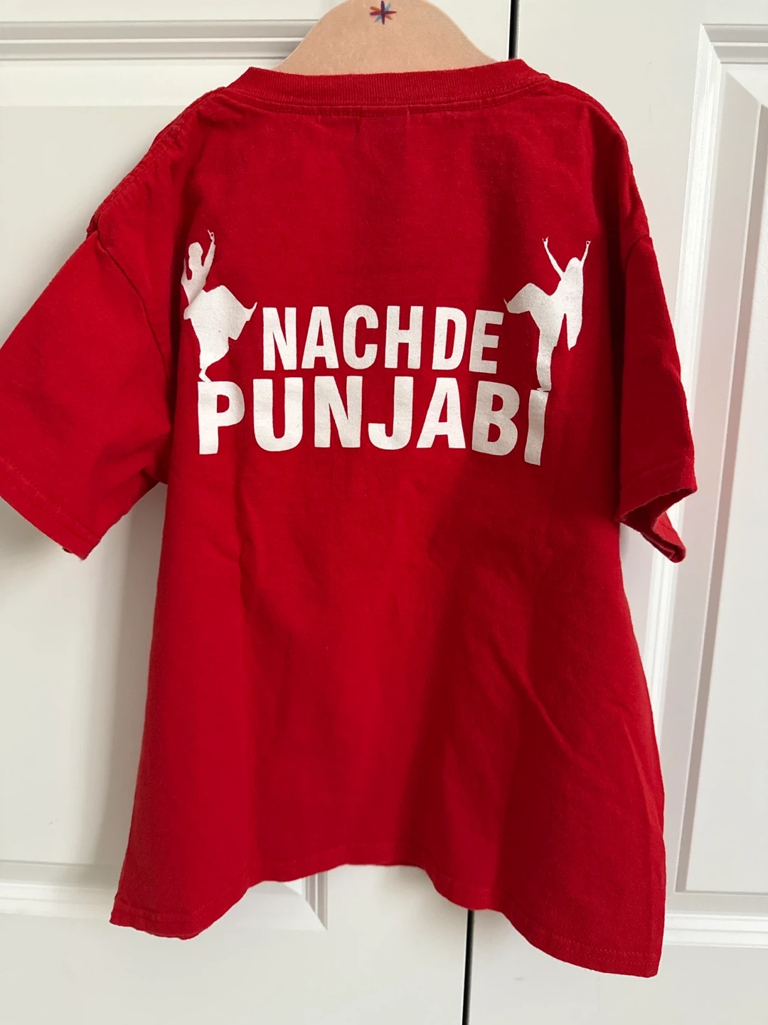 Selling a red Gildan t-shirt with the Punjabi Bhangra & Cultural Academy logo. The size is S. It has 'NACH DE PUNJABI' printed on the back. Great for dance enthusiasts!