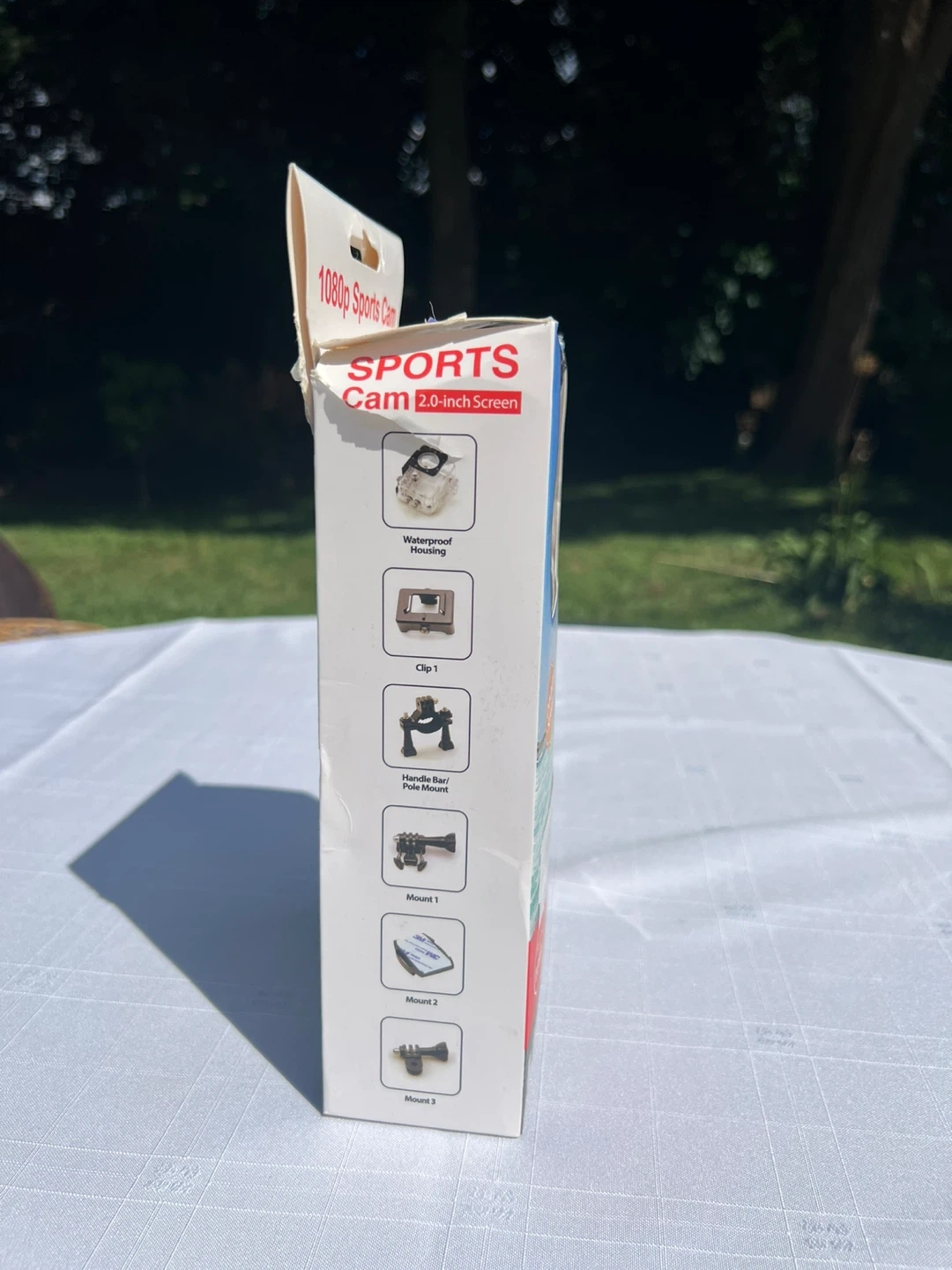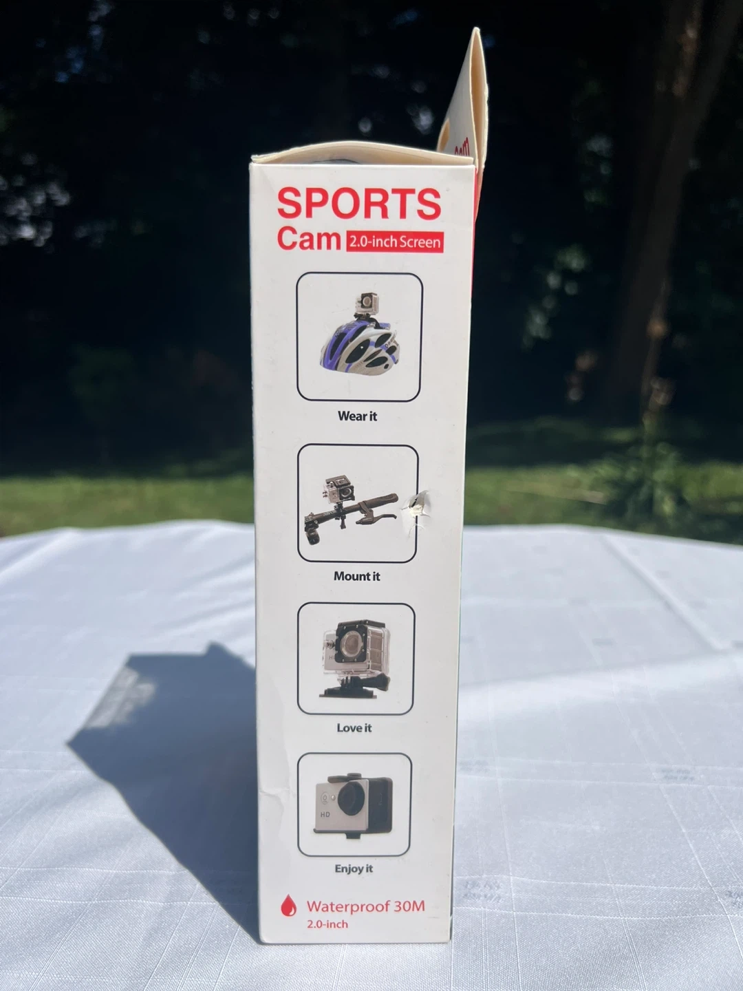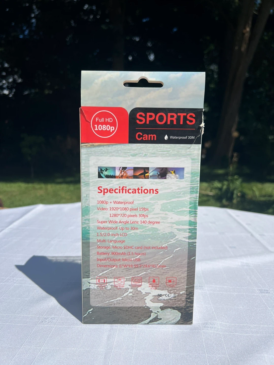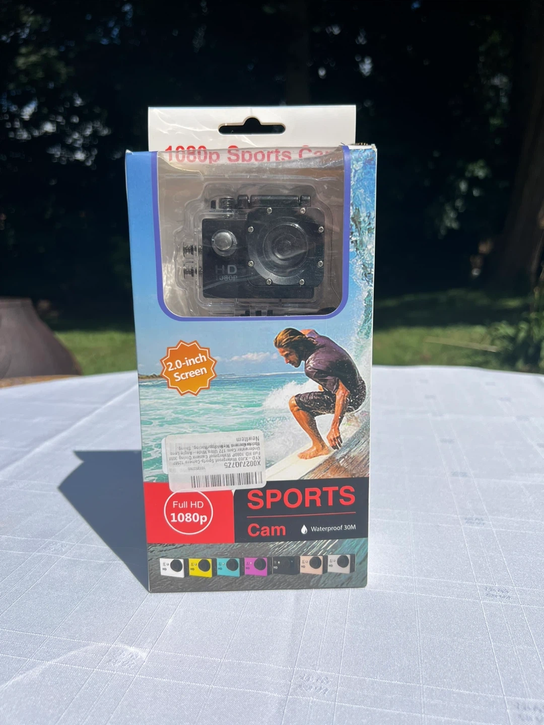I'm selling a brand new 1080p Sports Cam with a 2.0-inch screen. It's waterproof up to 30M. Specifications: - Video: 1920*1080 pixel 15fps, 1280*720 pixels 30fps - Super Wide Angle Lens: 140 degree - 1/2/4/8 inch x2 - Storage: Micro SDHC card (not included) - Battery: 900mAh (1.5 hours) - Input/Output: Micro USB - Dimensions: (L*W*H) 59.3*24.6*41.1mm It comes with accessories to wear and mount it. Enjoy!