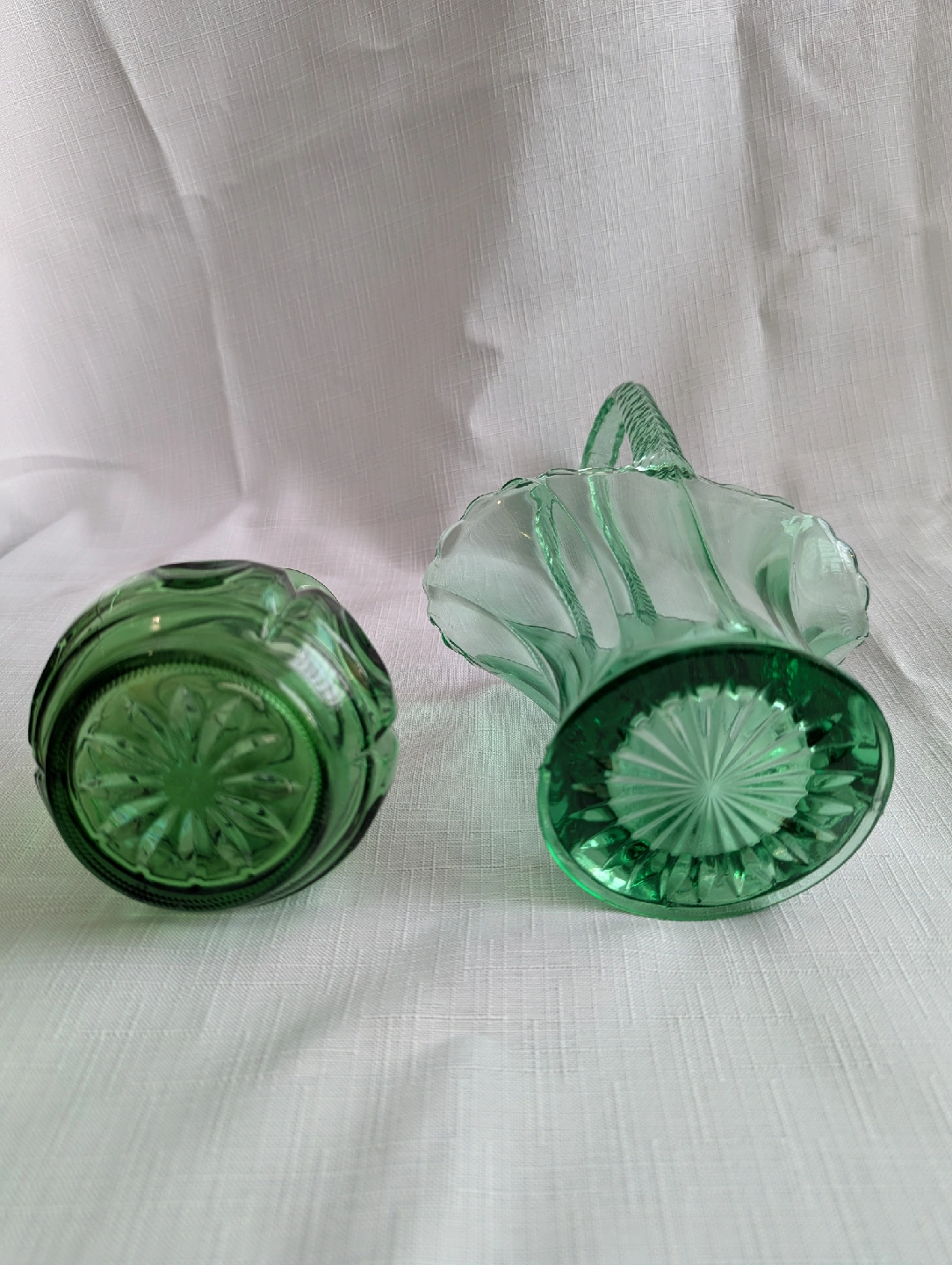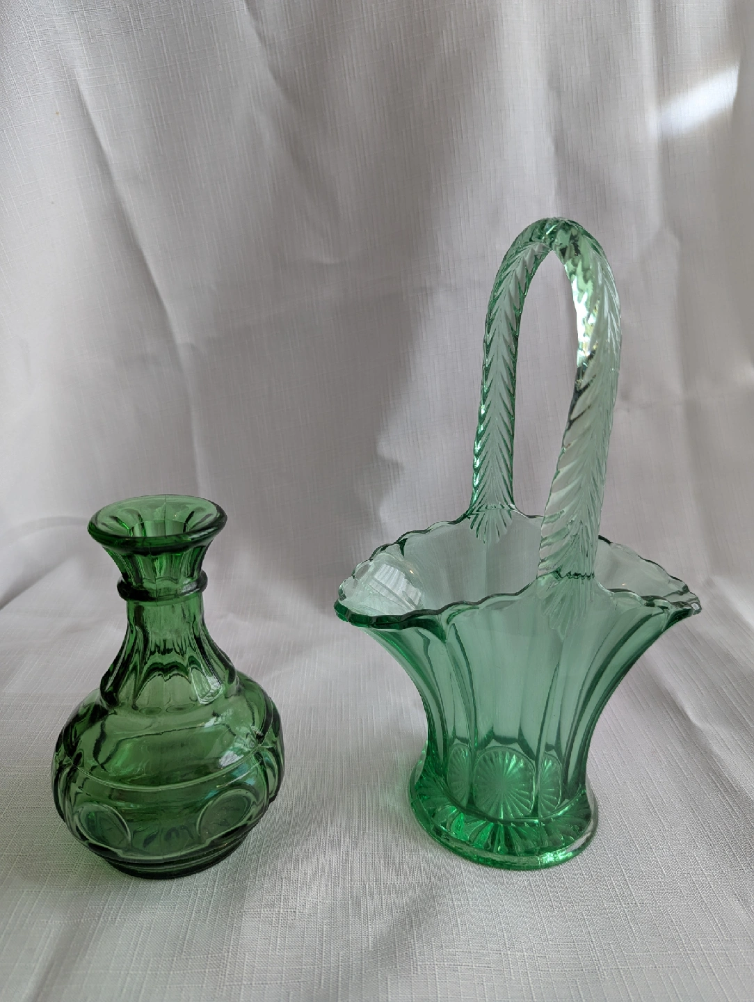 Selling 2 green glass vintage pieces Both for $25 or $15 each 1. Wheaton glass vase 5.5 inches high with bullseye pattern 2. Westmoreland green glass scalloped penel basket 10 inches tall. They are in great condition no chips or cracks PICKUP South Etobicoke. SEE map Smoke and pet free home. No delivery. No meetups