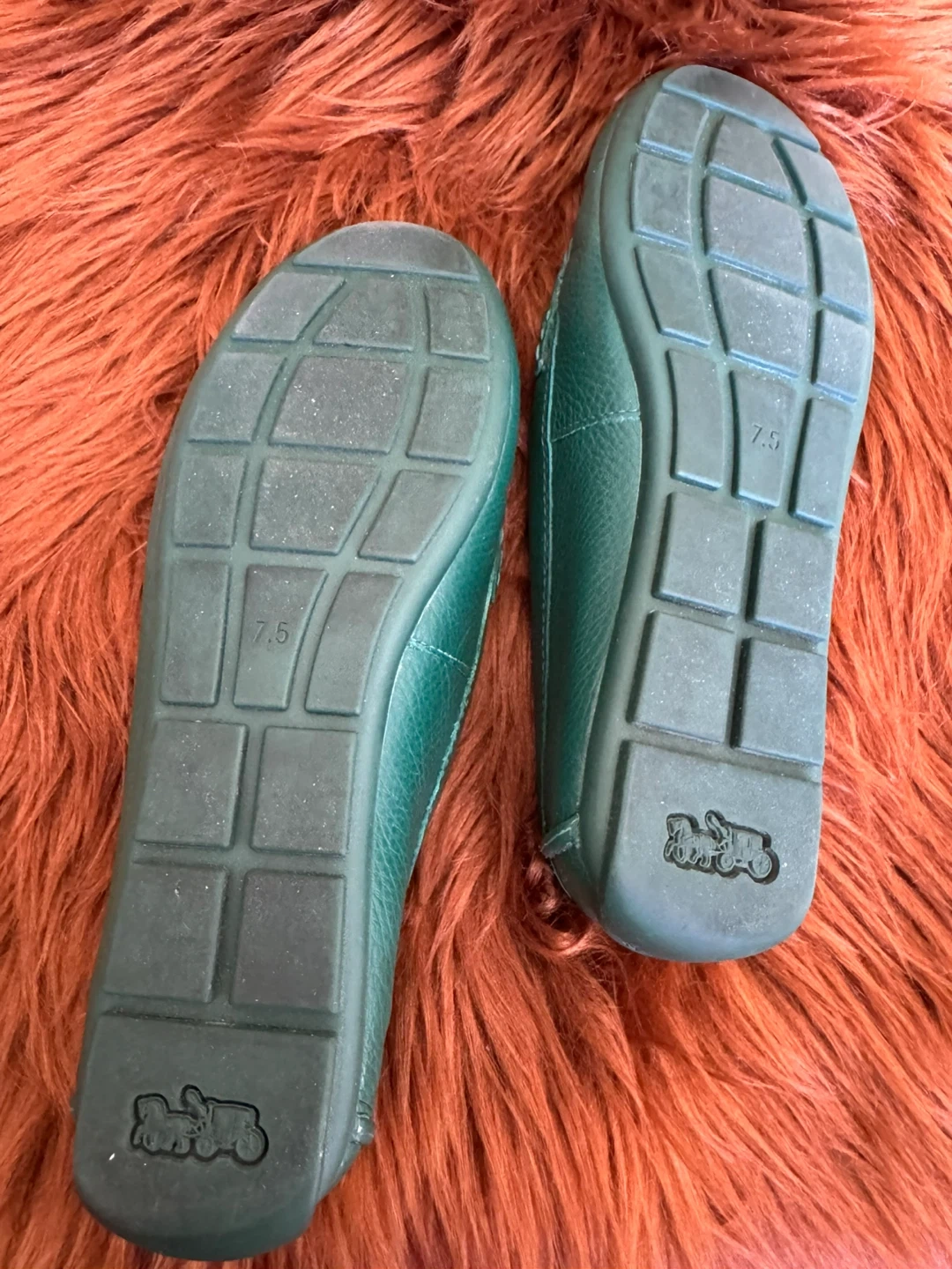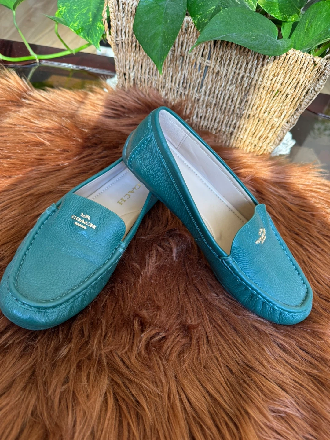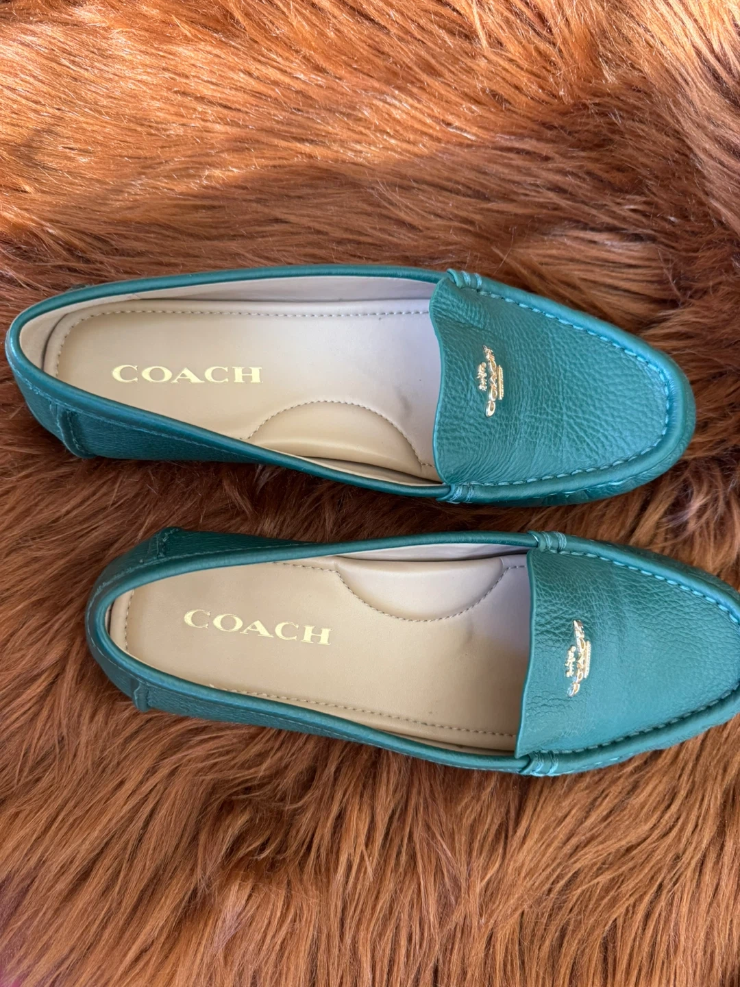 These are a pair of Coach loafers in a beautiful green leather! They're a size 7.5 and in great shape. Perfect for adding a pop of colour to your outfit the colour in the picture seems different