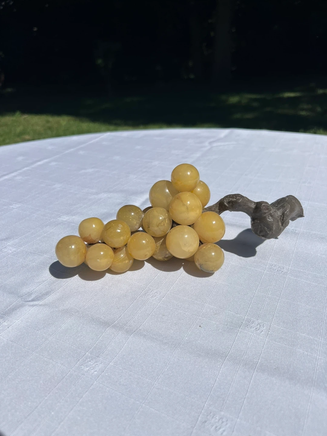 Selling a vintage alabaster grape cluster. It's a beautiful decorative piece, perfect for adding a touch of elegance to any room. The grapes are a lovely soft yellow colour and the stem has a nice dark finish.