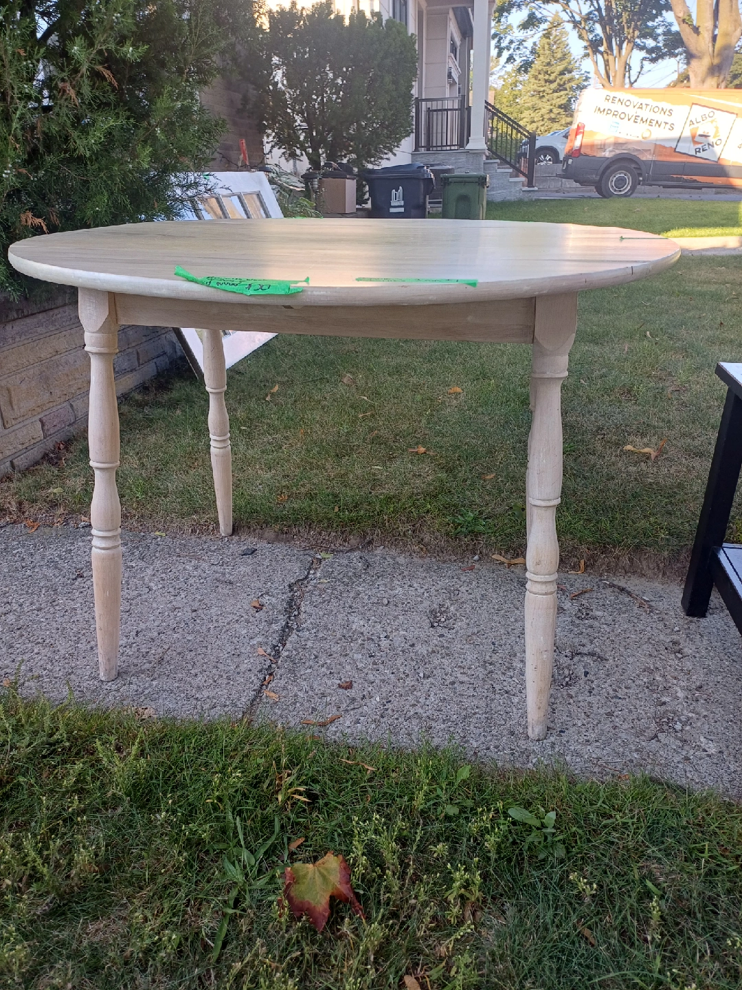 Round wooden dining table. It's in good condition and would be a nice addition to any dining room or kitchen. The table has a classic design with turned legs. Perfect for small spaces or cozy meals!