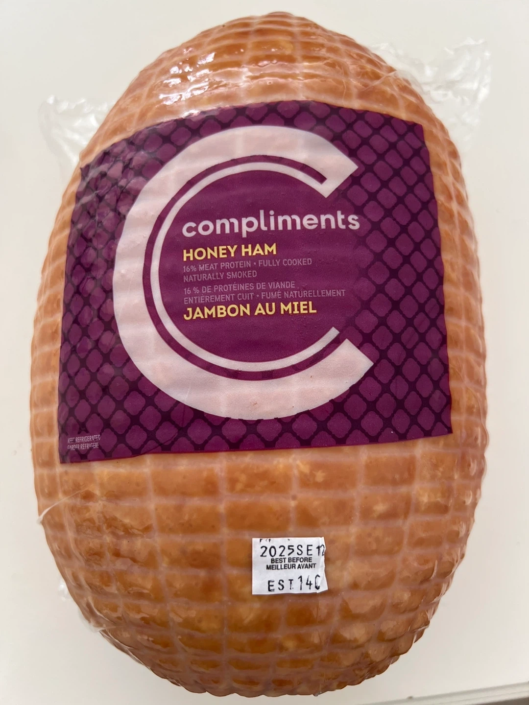 Selling a fully cooked Compliments Honey Ham. It's naturally smoked and contains 16% meat protein. The best before date is 2025 September 12