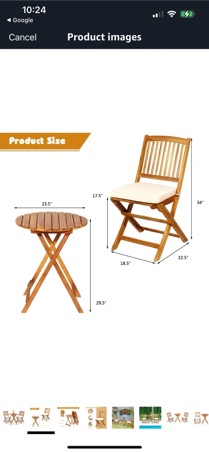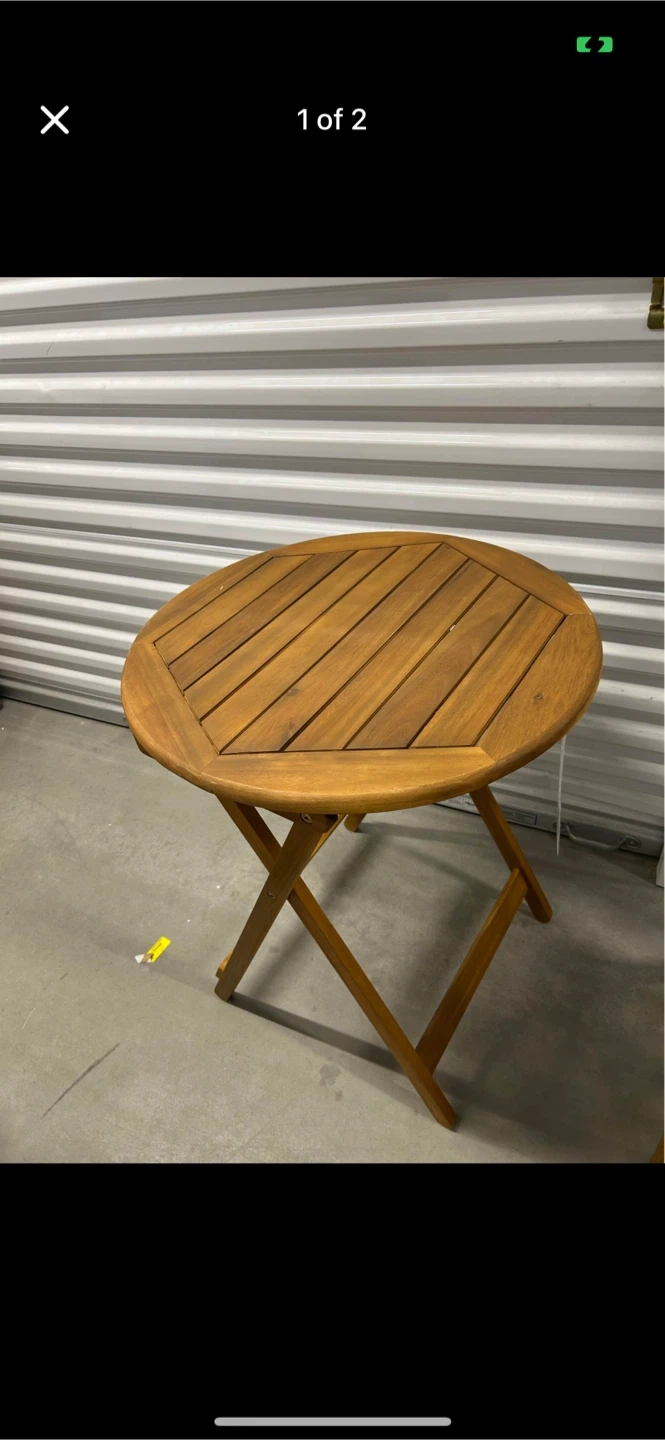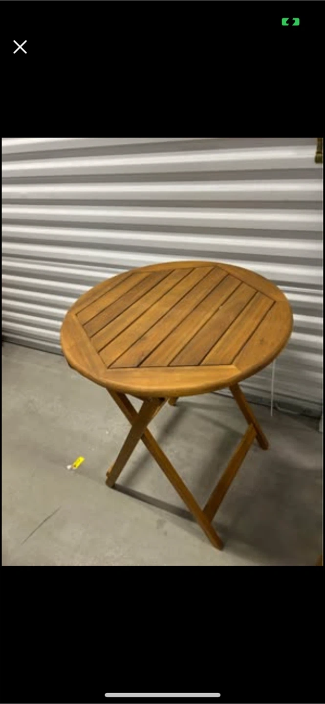 Here's a cute little outdoor folding table! It's perfect for a small patio or balcony. The table is made of wood and folds up for easy storage. Dimensions are approximately 23.5" diameter and 29.5" high
