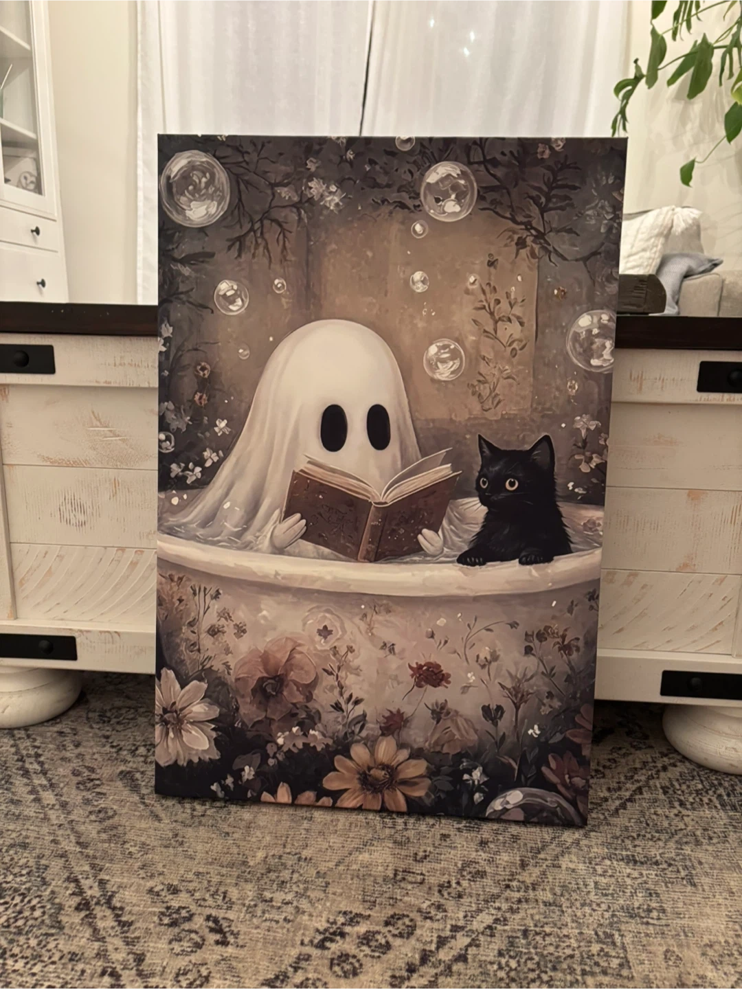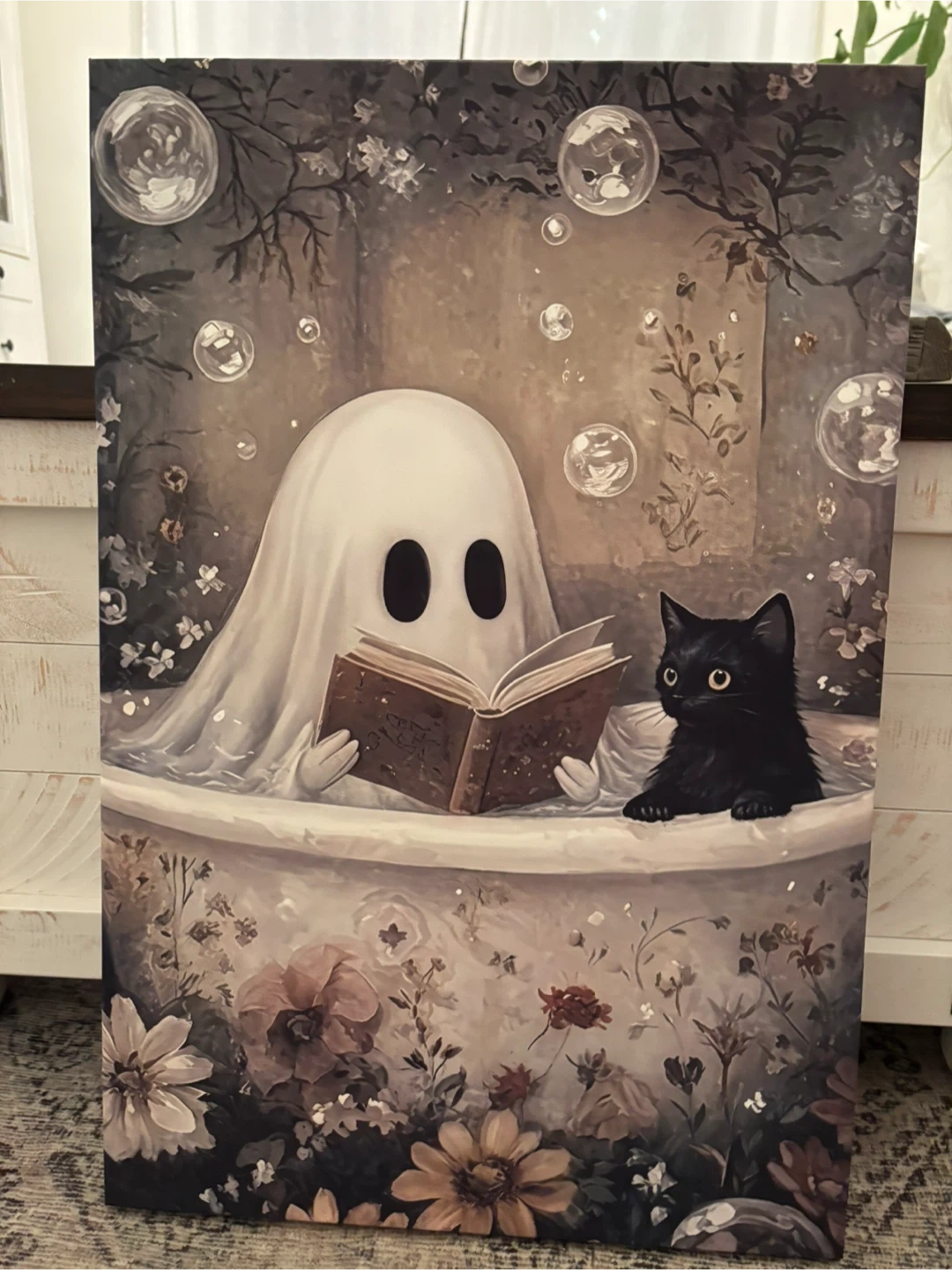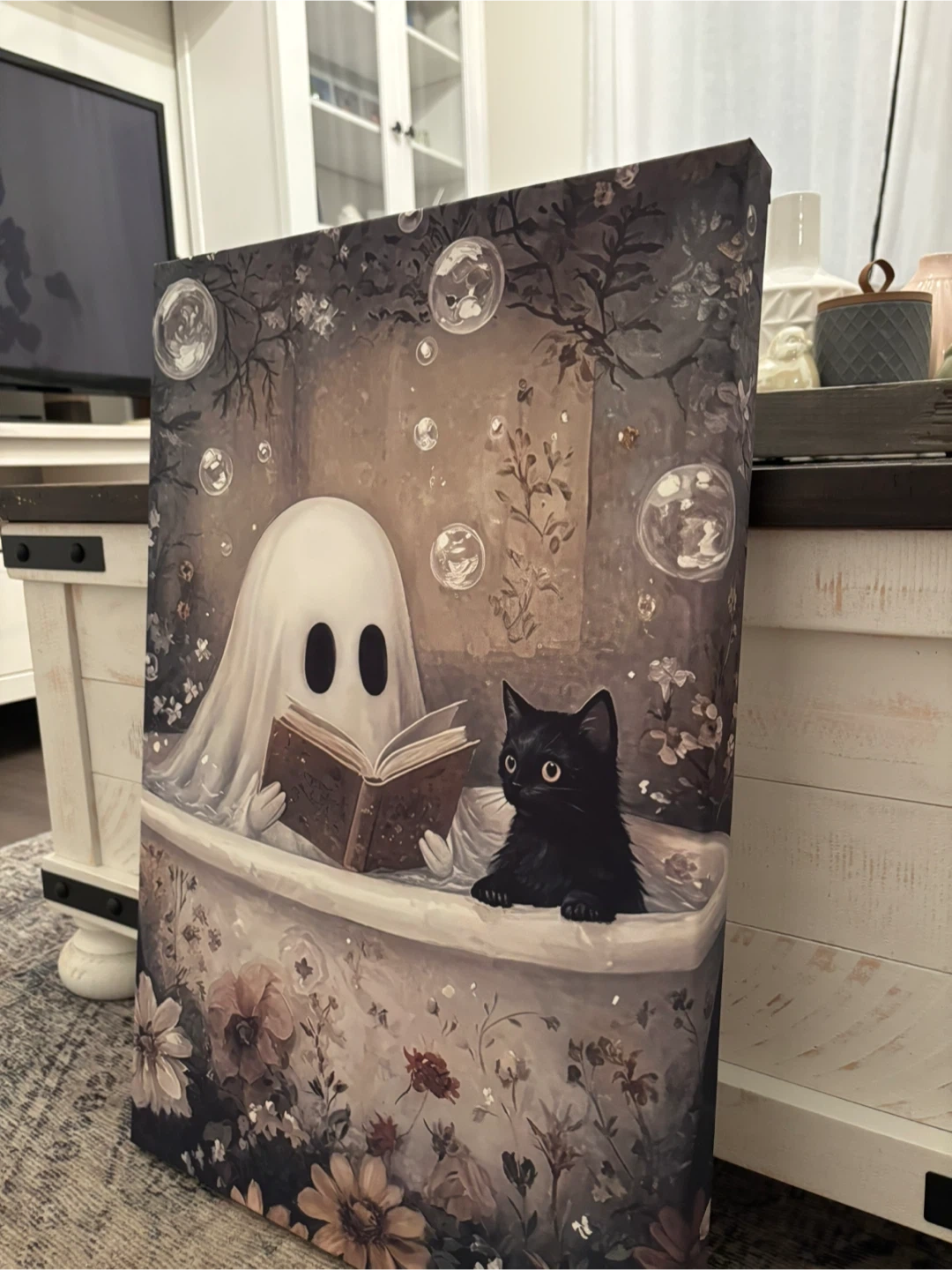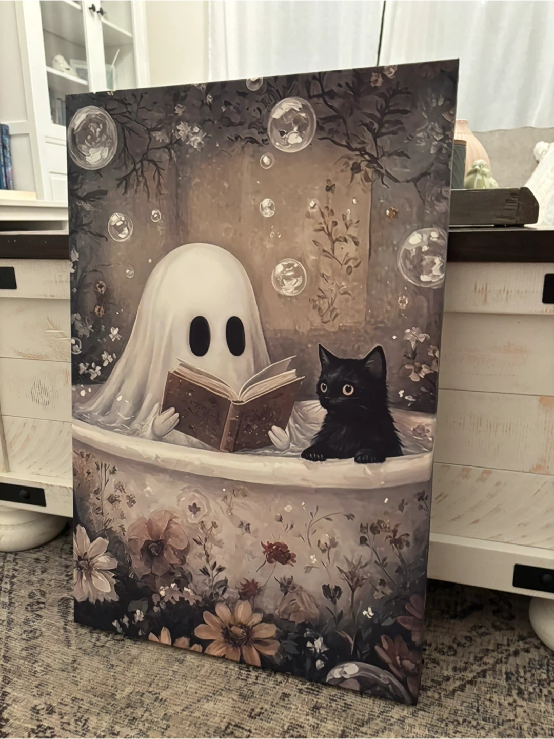 Selling a canvas print featuring a cute ghost reading in a bathtub with a black cat! It's brand new and would look great in any room. Framed (by me) onto 23.6”X15.7”X1.5” wooden frame. Light weight and ready to hang with sawtooth hanger attached. Pick up in Northglen area, Bowmanville.