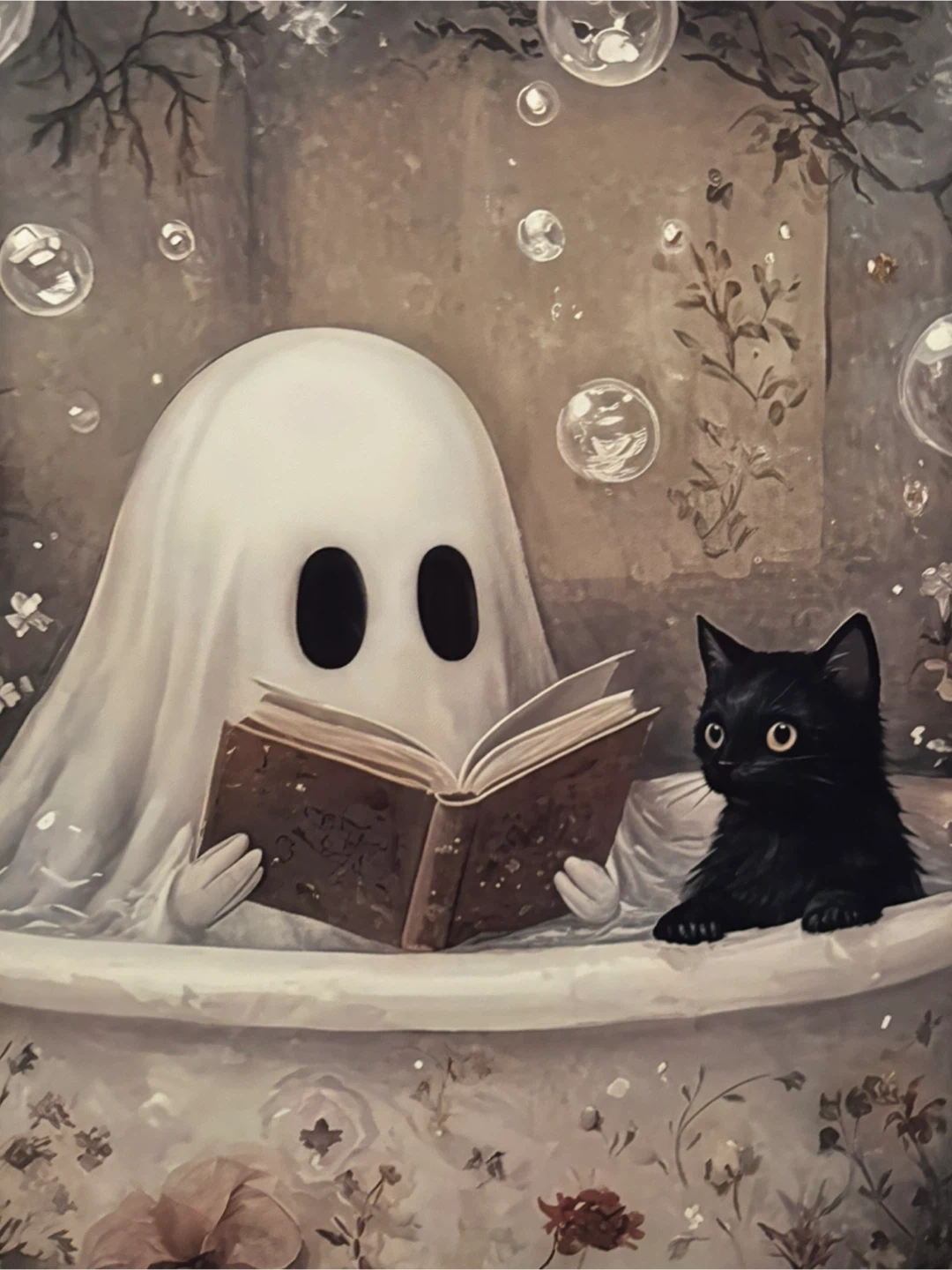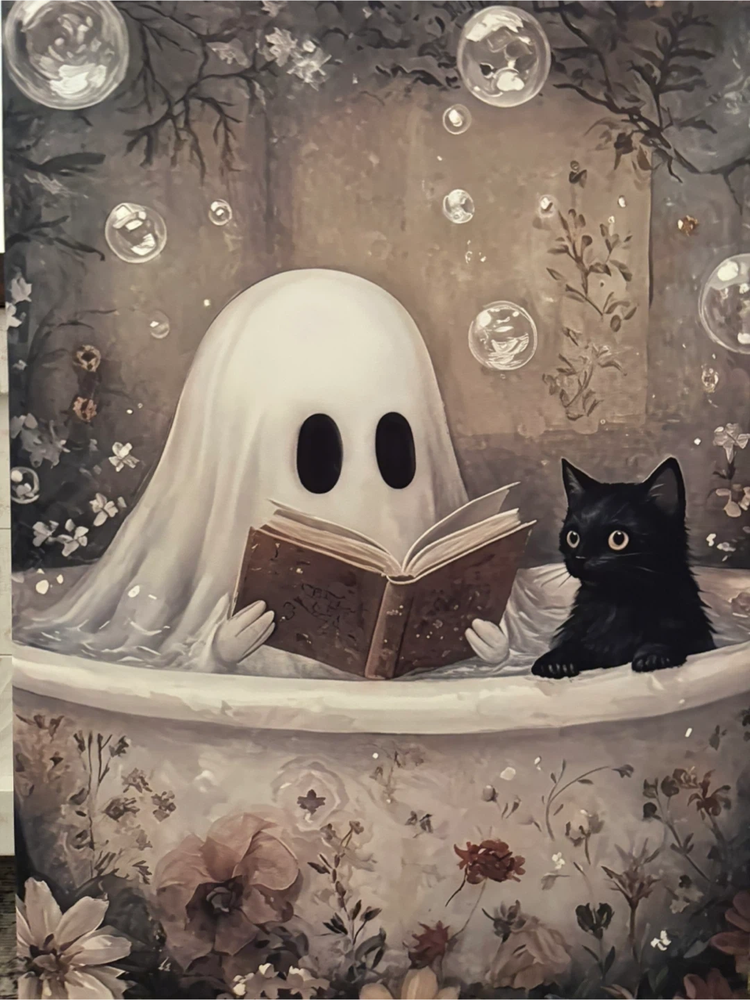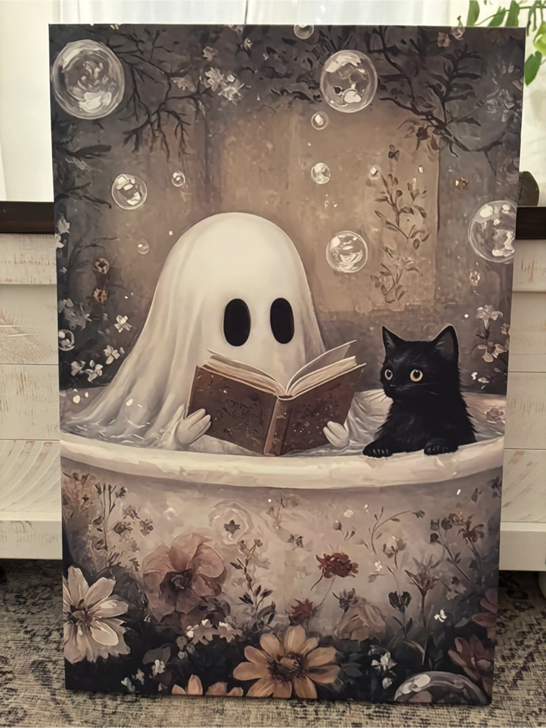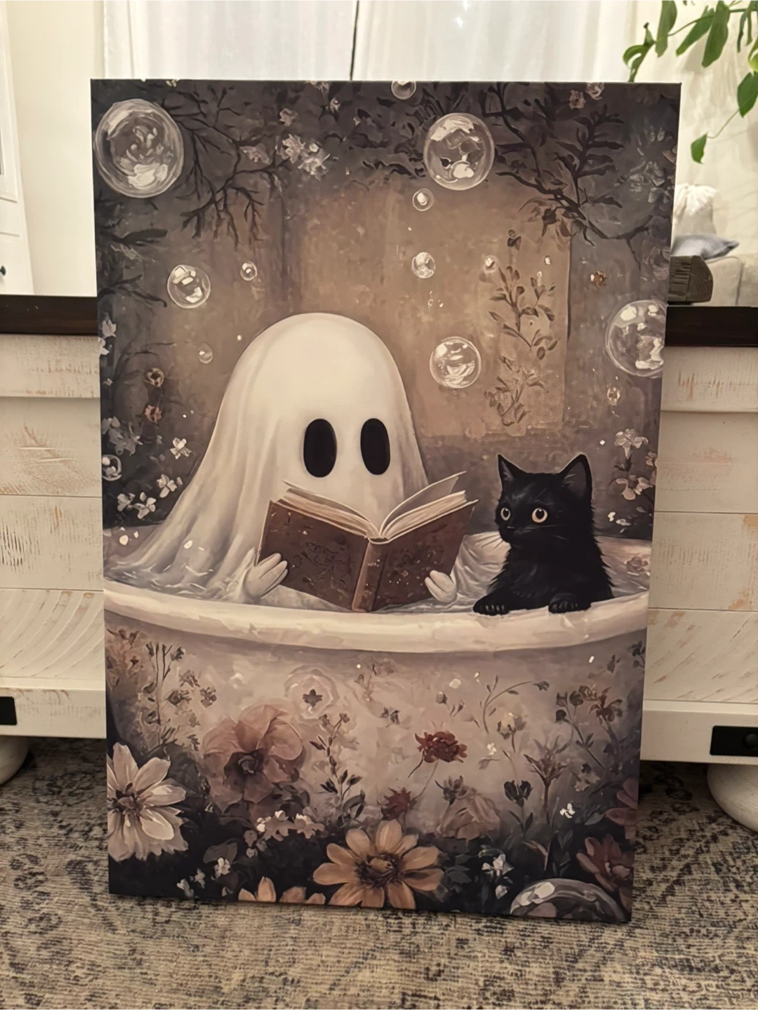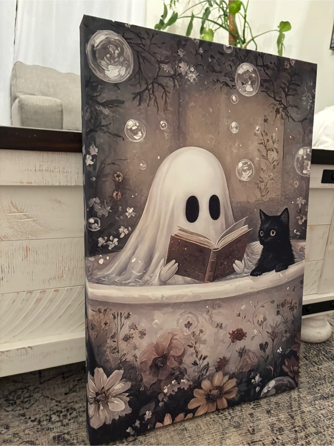 Selling a canvas print featuring a cute ghost reading in a bathtub with a black cat! It's brand new and would look great in any room. Framed (by me) onto 23.6”X15.7”X1.5” wooden frame. Light weight and ready to hang with sawtooth hanger attached. Pick up in Northglen area, Bowmanville.