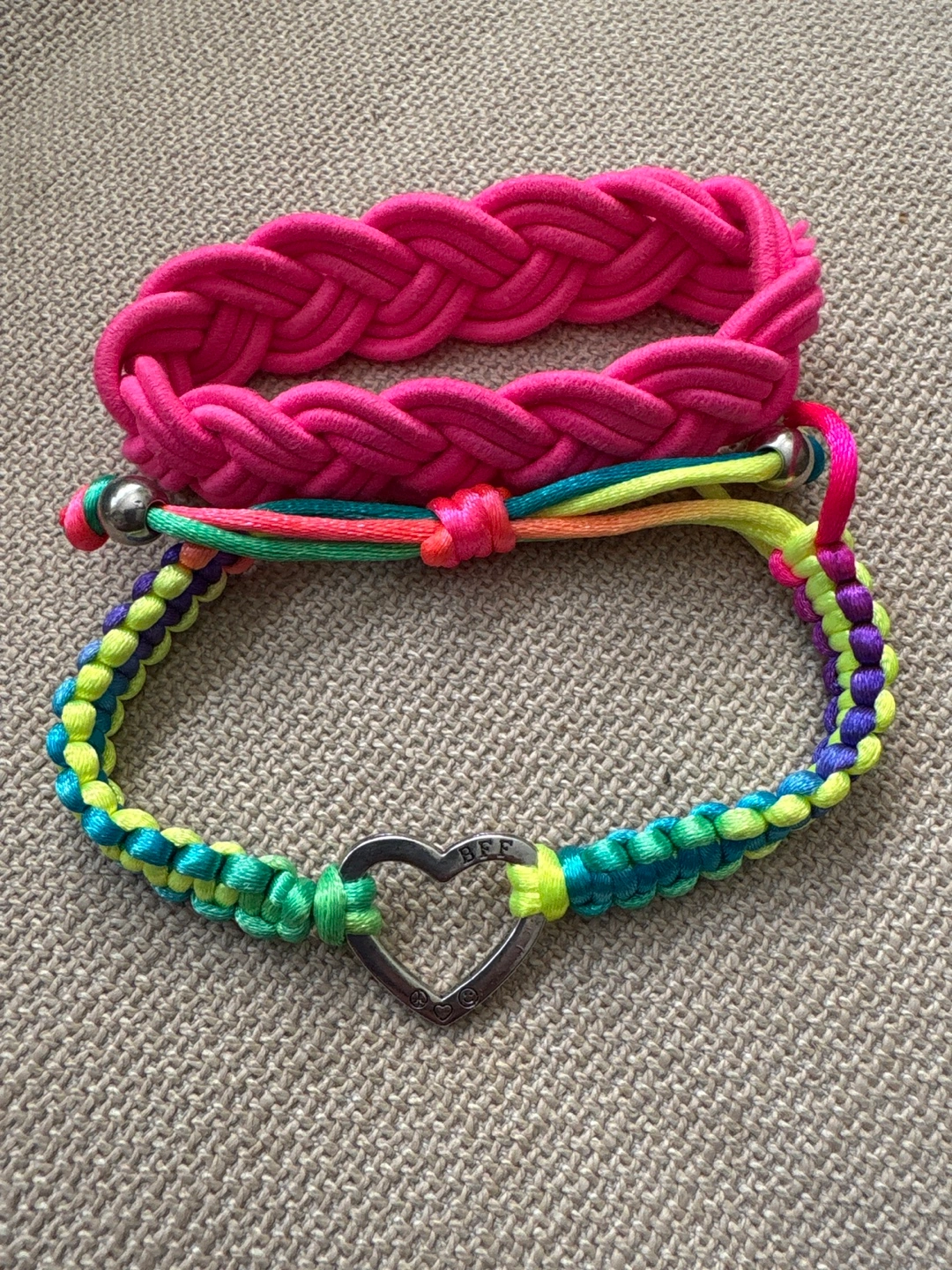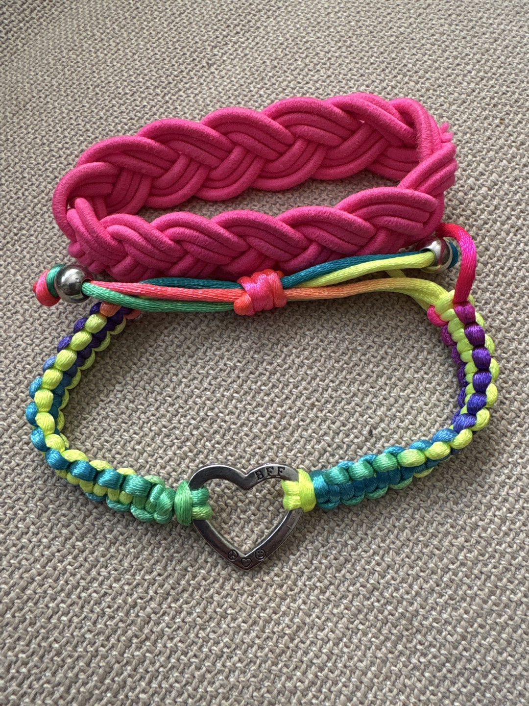 Selling two cute bracelets! One is a bright pink braided style, and the other has a heart charm with colourful detailing. Perfect for adding a pop of fun to any outfit