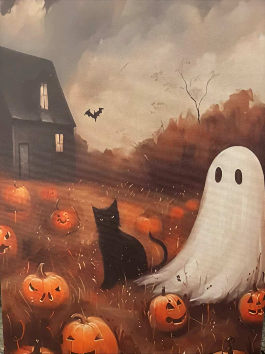 This canvas print features a spooky yet cute Halloween scene with a ghost, black cat, pumpkins, and a haunted house! It's perfect for adding a festive touch to your home decor for the Halloween season. Framed (by me) onto 19.6”x11.7”x1.5” wooden frame. Light weight and ready to hang with sawtooth hanger attached. Pick up in North Bowmanville.