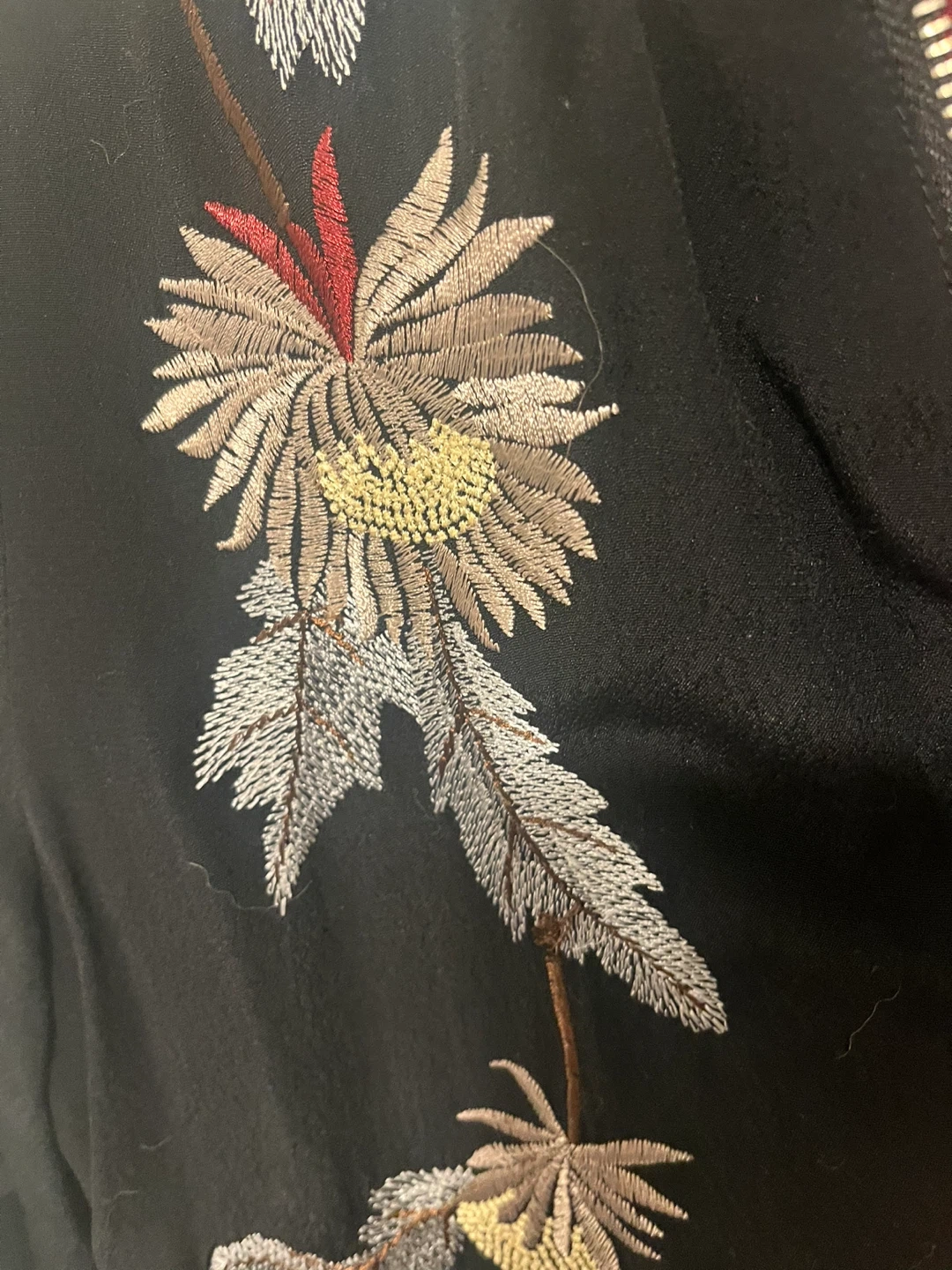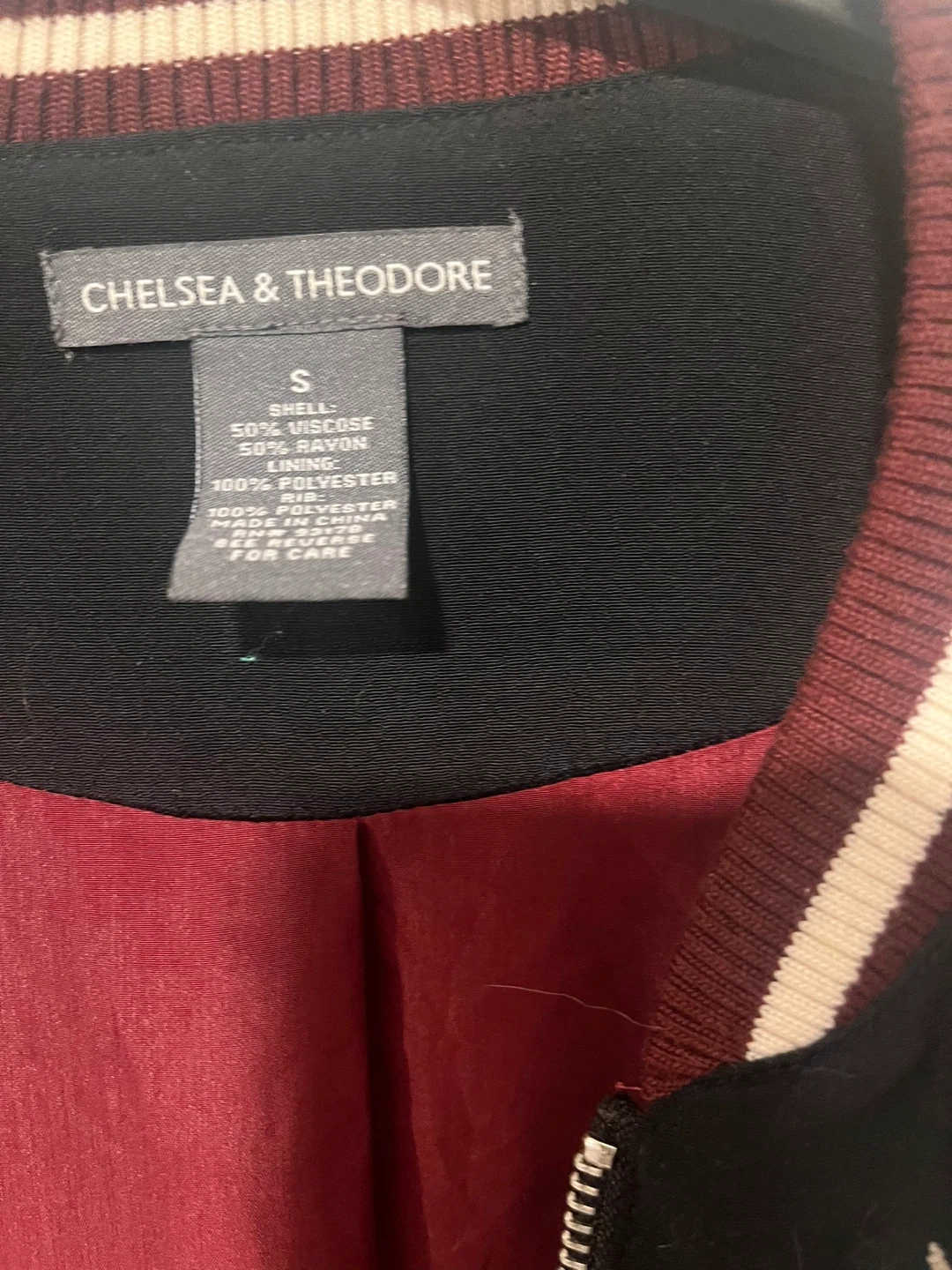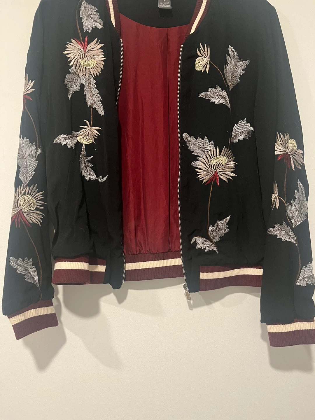 Selling a Chelsea & Theodore bomber jacket in size small! It features beautiful floral embroidery and a contrasting red lining. The shell is made of 50% viscose and 50% rayon, while the lining is 100% polyester.
