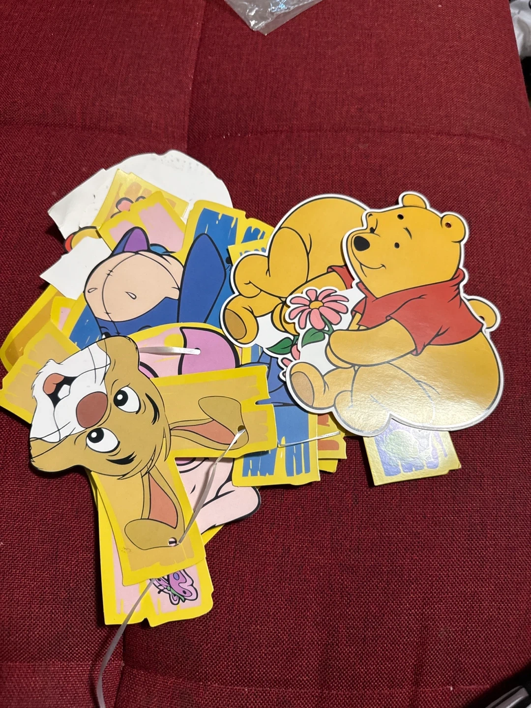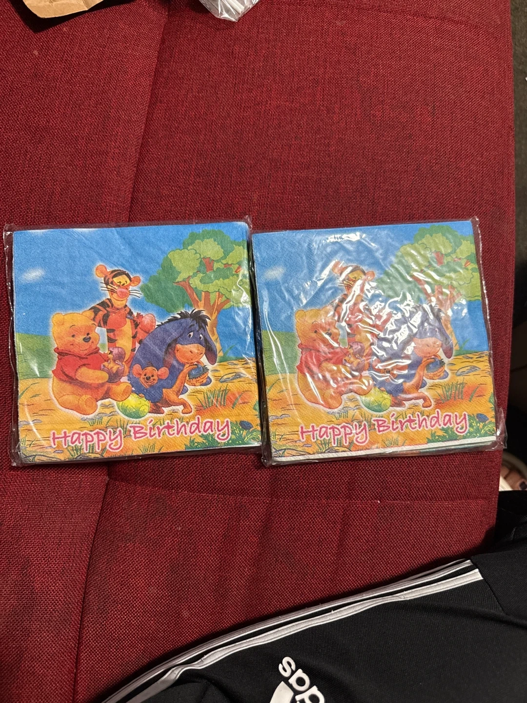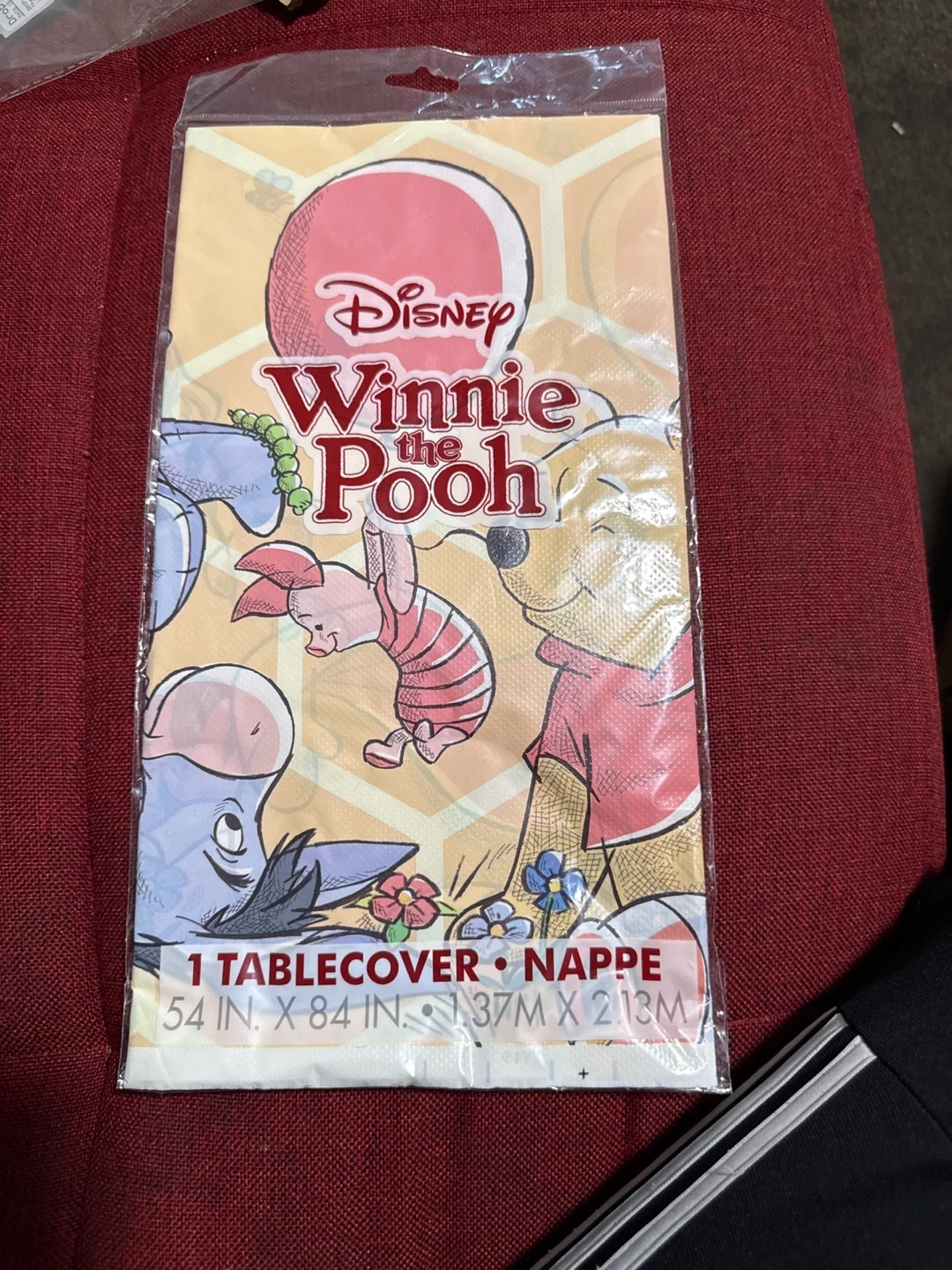 I have Winnie the Pooh themed birthday party supplies. Great for a themed party! Background 210*150 cm , 4 tablecloth (2 open, 2 new), new napkins, 2 set of cake toppers with cupcake toppers , and 2 new ribbon.