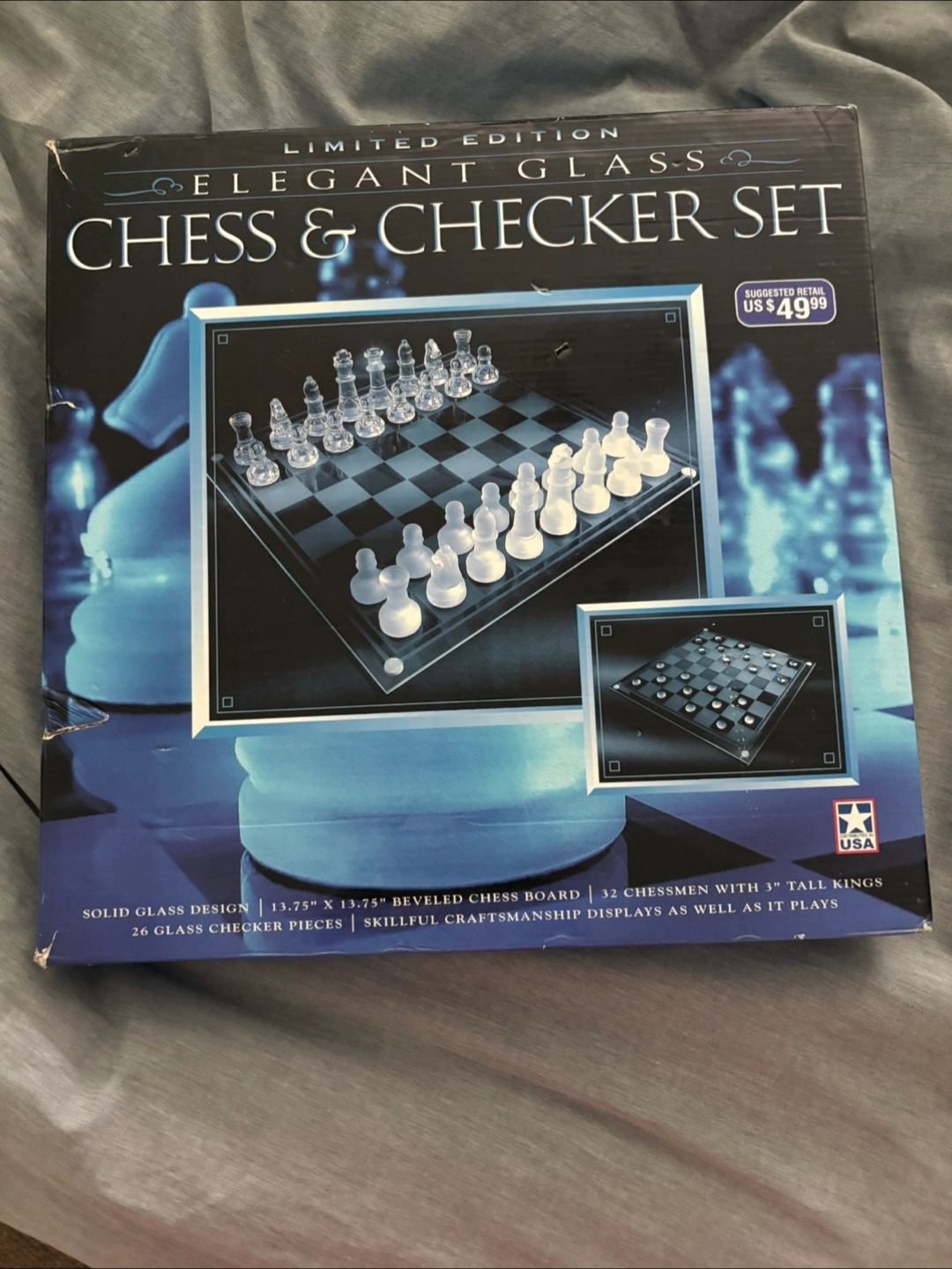 Selling a limited edition Elegant Glass Chess & Checker Set. It features a solid glass design with a bevelled chessboard measuring 13.75" x 13.75". The set includes 32 glass chessmen with 1" tall kings and 26 glass checker pieces. It comes in its original box with the styrofoam inserts to keep everything safe and organized. The retail price was US$49.99