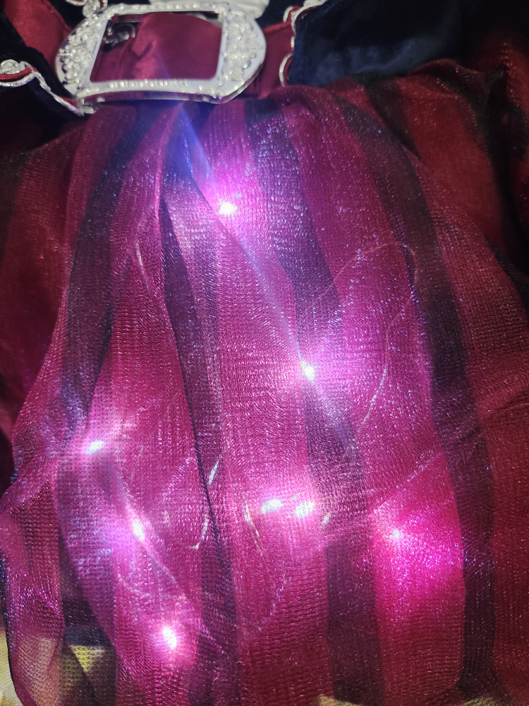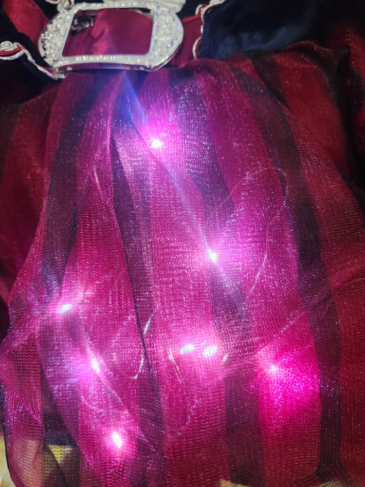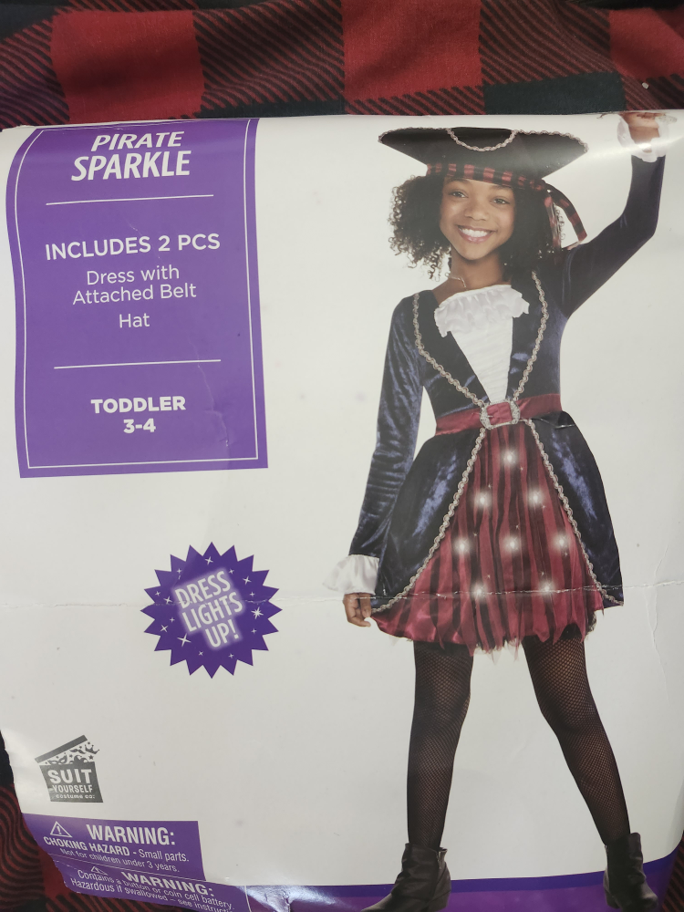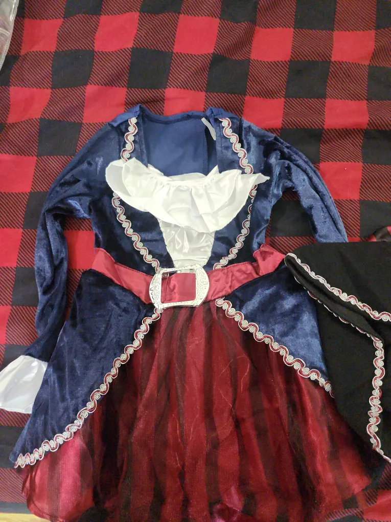 Ahoy there! Get ready for adventure with this pirate costume. It features a mix of blue, red, and black colours, perfect for dress-up. It's in great condition and ready for a new swashbuckler!