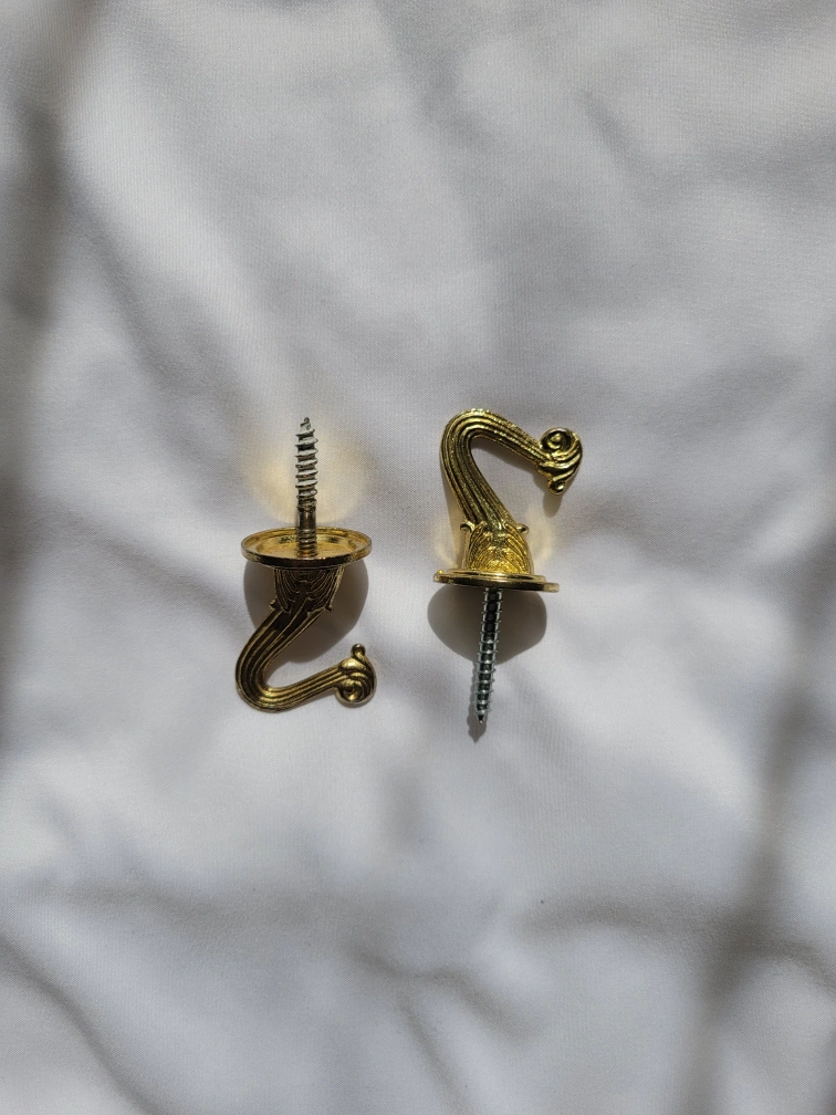 Selling two decorative gold-coloured hooks that screw in easily! They're in great condition and ready to add a touch of elegance to your space.