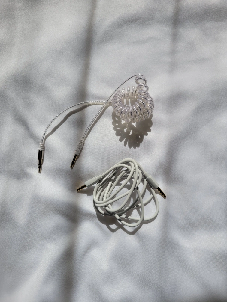 Two audio cables. One is a coiled cable and the other is a regular straight cable. Both are white and in great condition!
