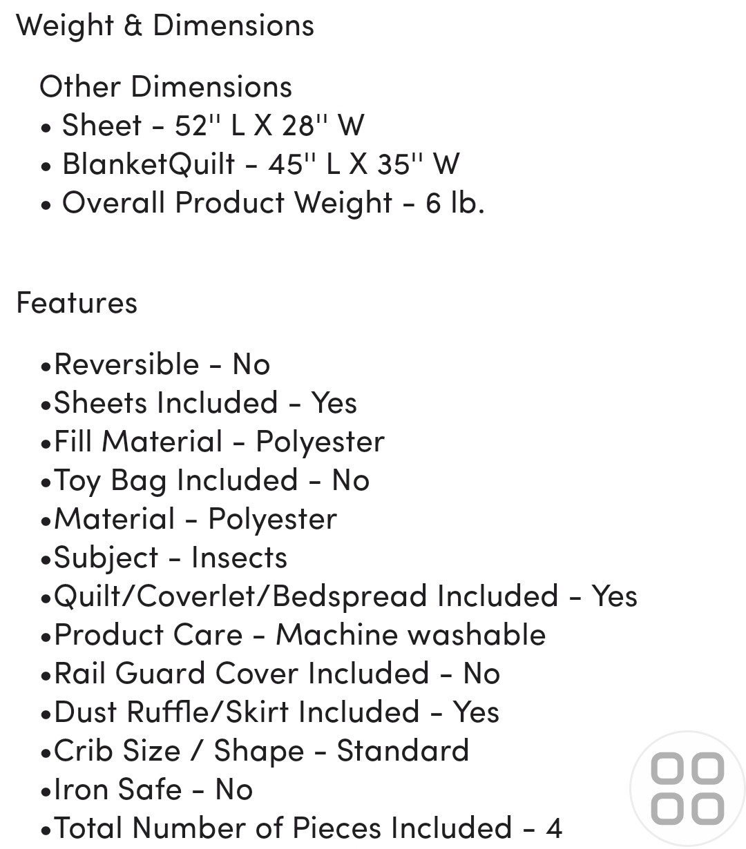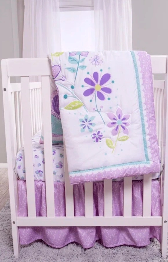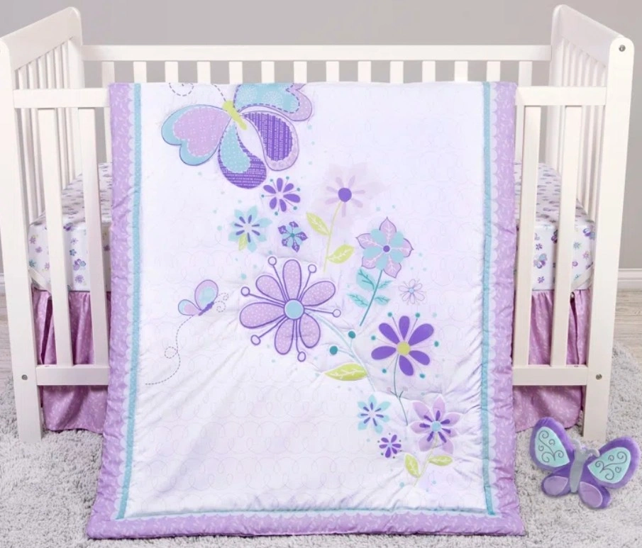 This adorable 4-piece crib bedding set features a lovely butterfly and floral design! The set includes a sheet (52" L x 28" W) and a blanket/quilt (45" L x 35" W). It's made of polyester and is machine washable for easy care. The set also includes a dust ruffle/skirt. Perfect for adding a touch of sweetness to your little one's nursery!