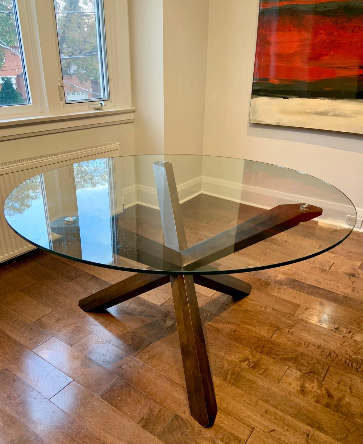 This modern round dining table combines a sleek glass top with a solid oak cross base for a contemporary look.
